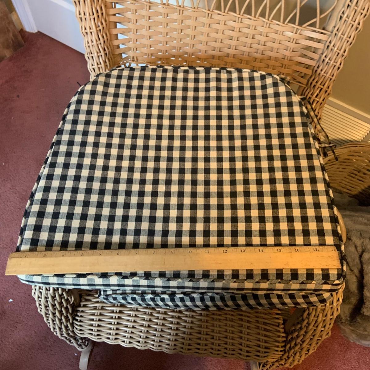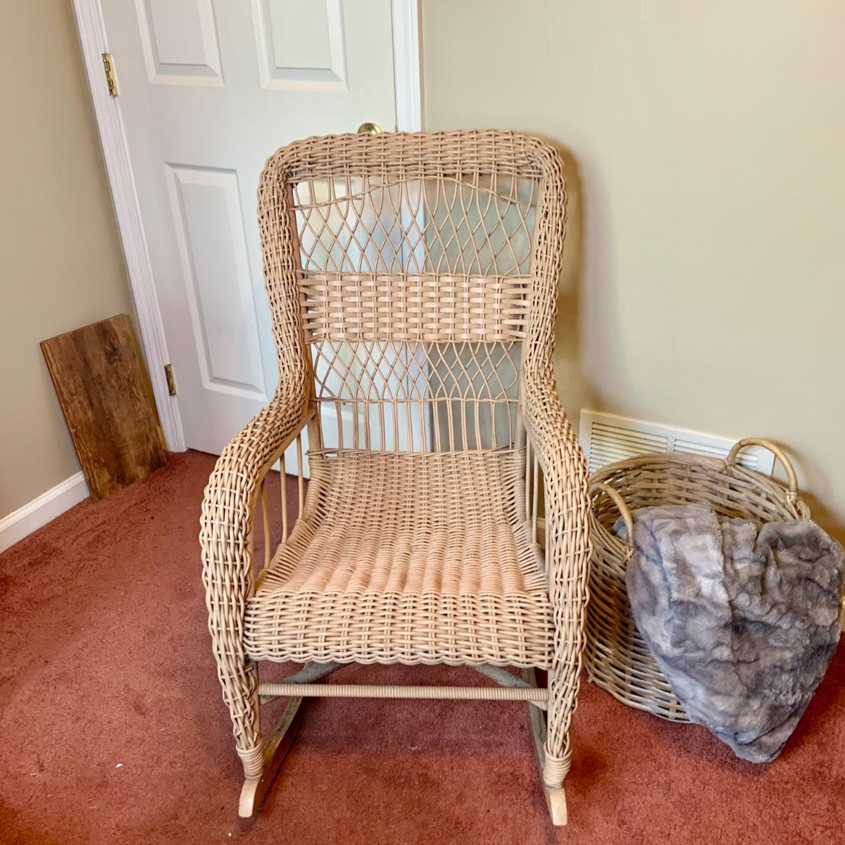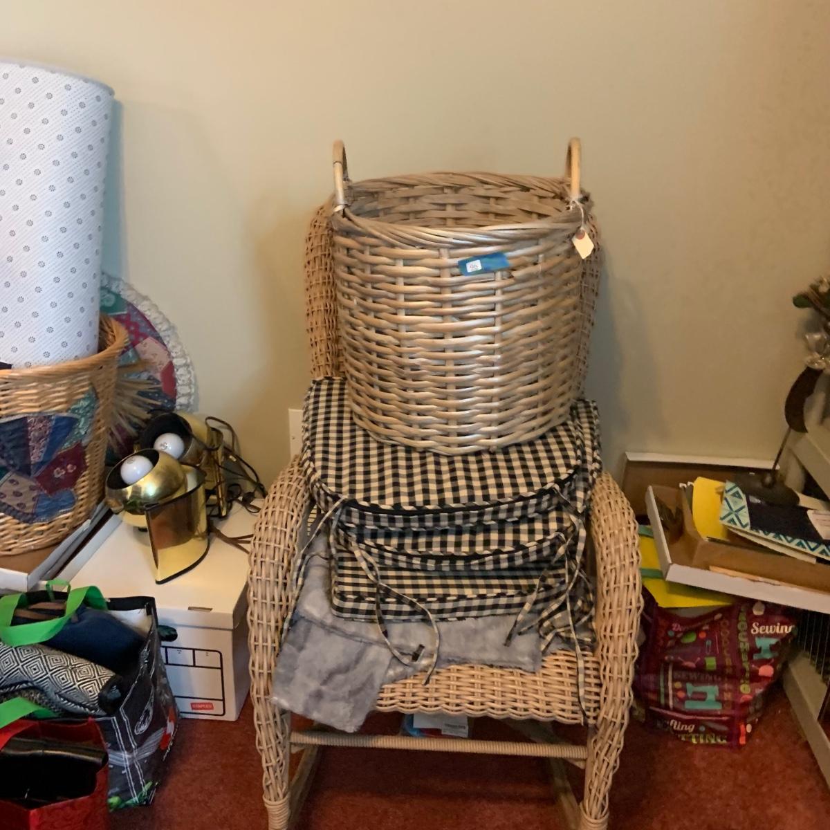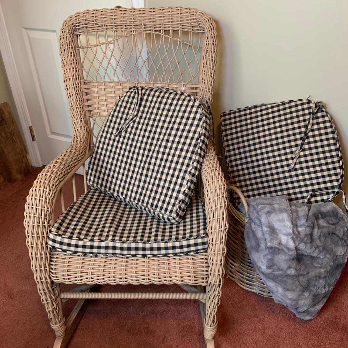 LOT96:: Wicker Rocking Chair, Large Wicker Basket with Handles, Black Gingham Seat Cushions and Cozy Blanker