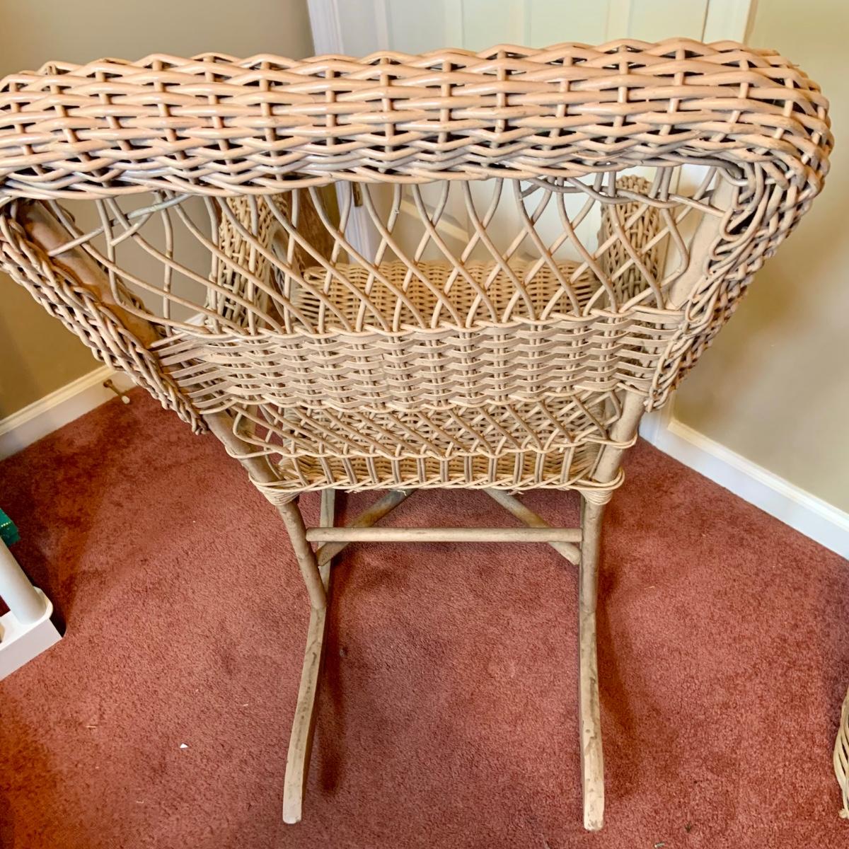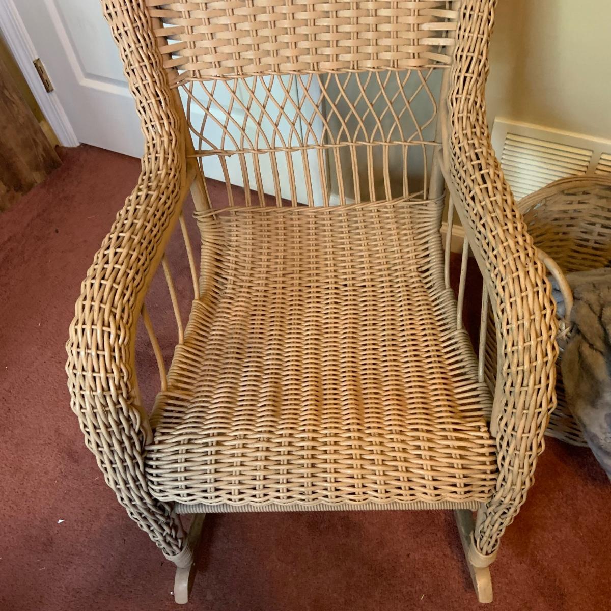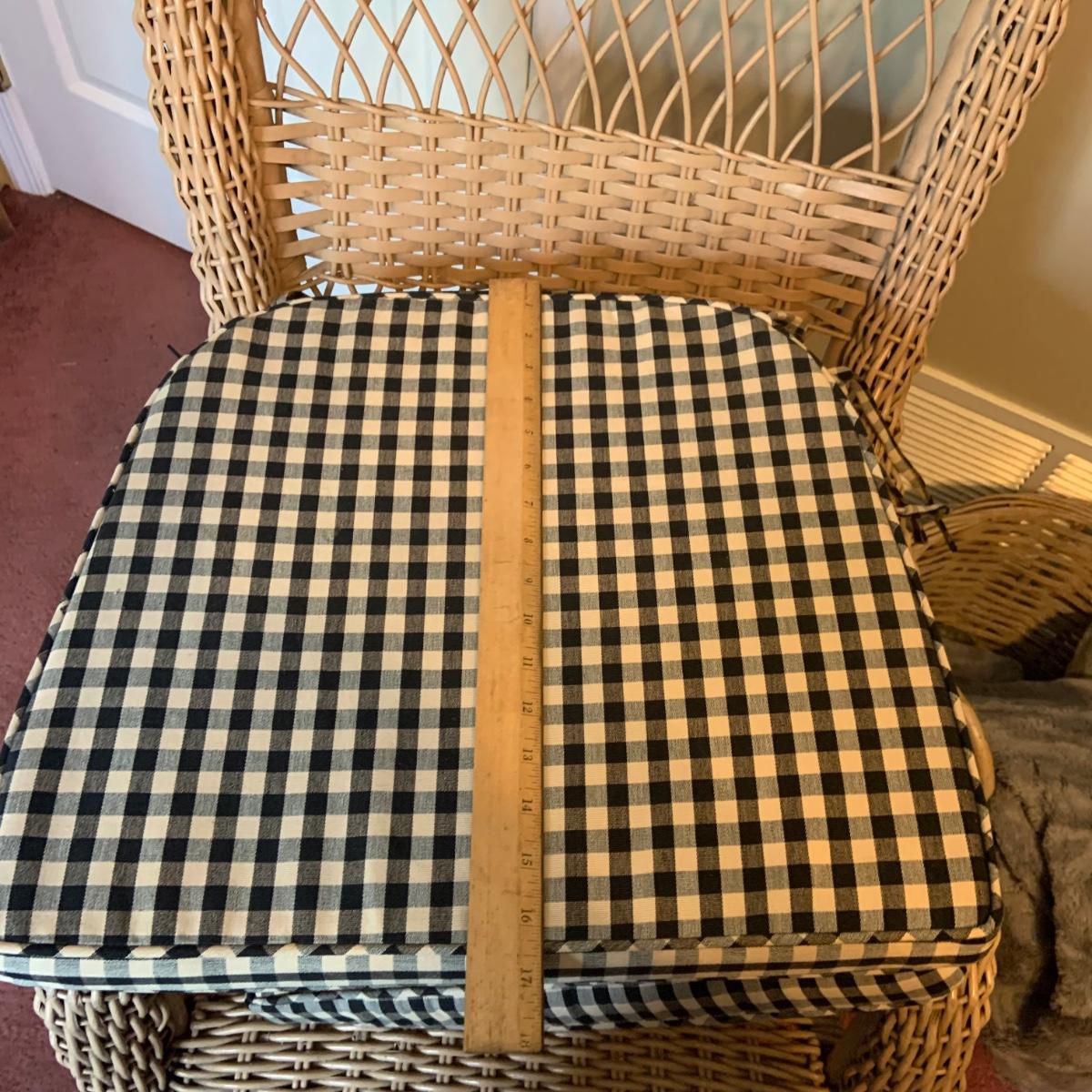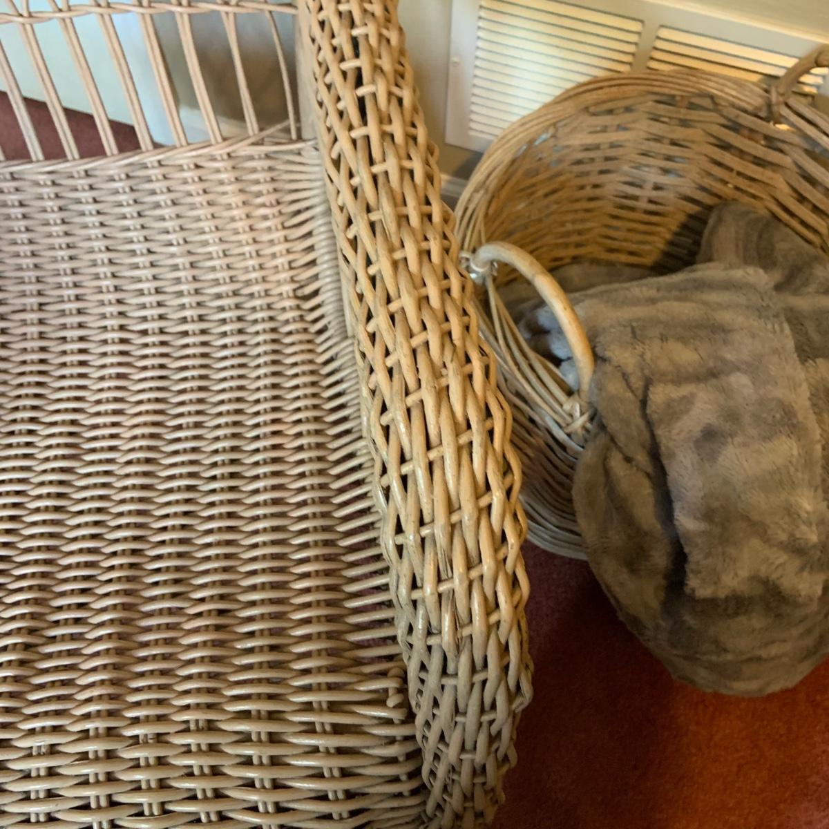 LOT96:: Wicker Rocking Chair, Large Wicker Basket with Handles, Black Gingham Seat Cushions and Cozy Blanker