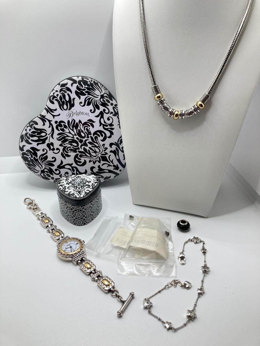 LOT 144: Brighton Jewelry - Two Tone Watch, Bracelet, Star / Crystal Bracelet, Charms and Tins