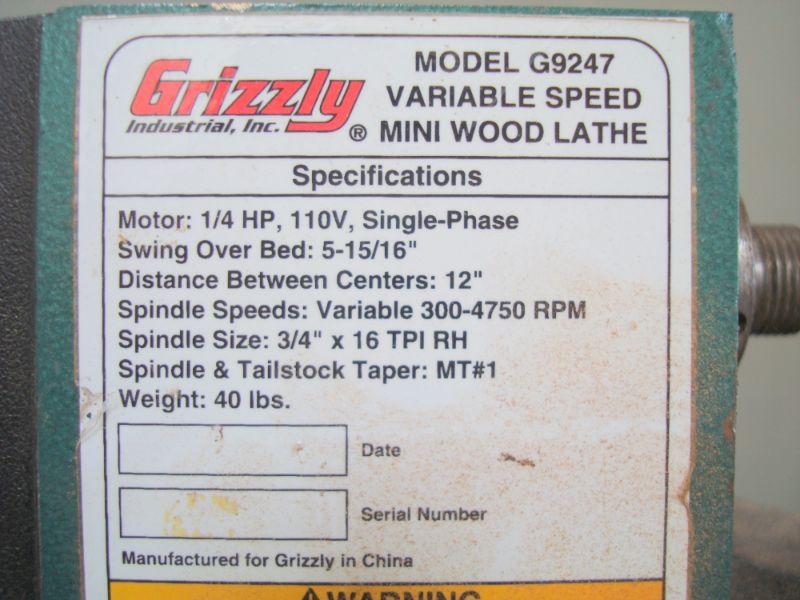 Lot 1062 - Grizzly Model G9247 Variable Speed Mini Wood Lathe