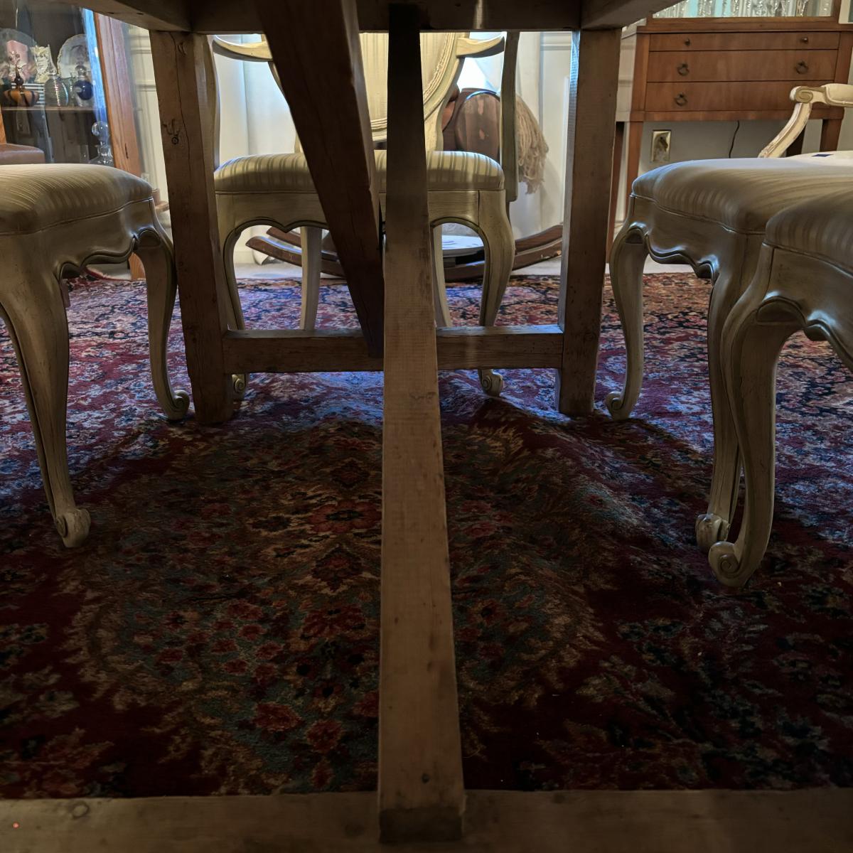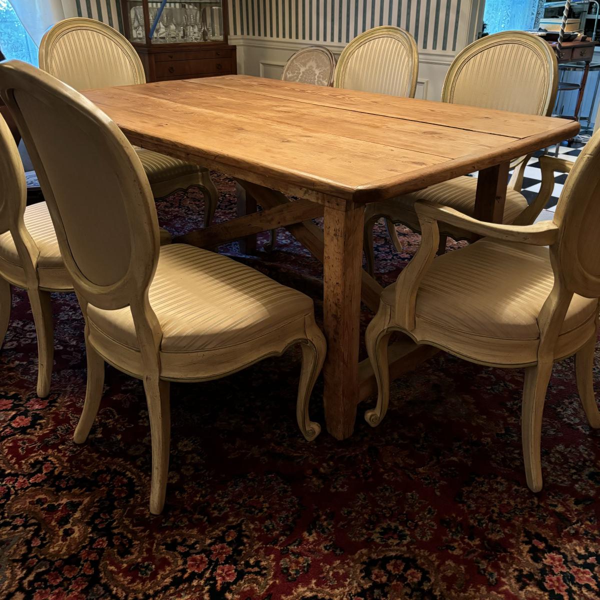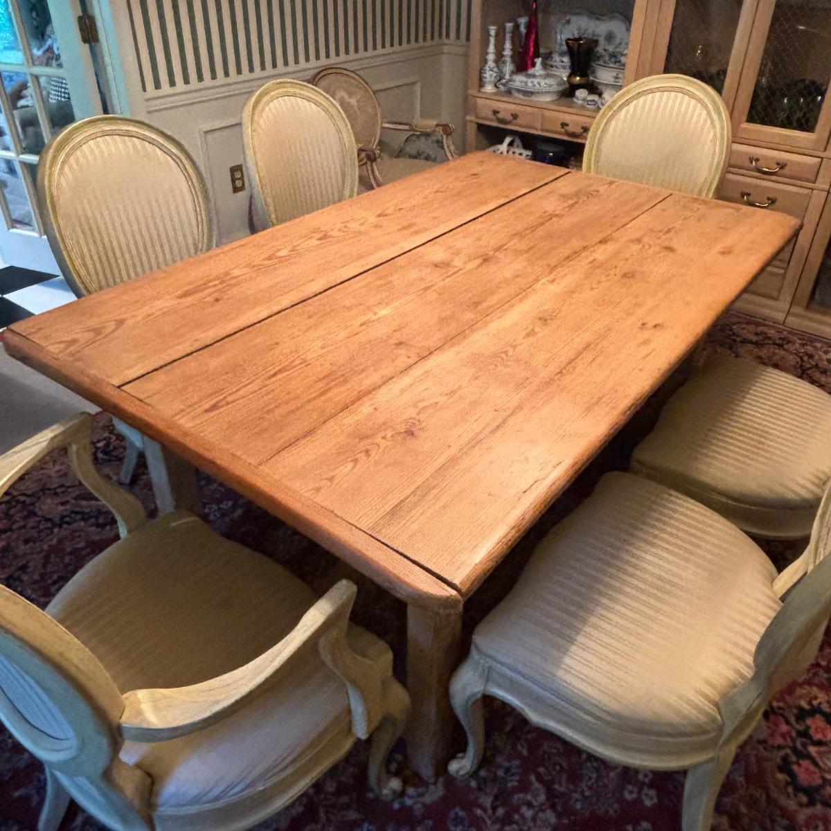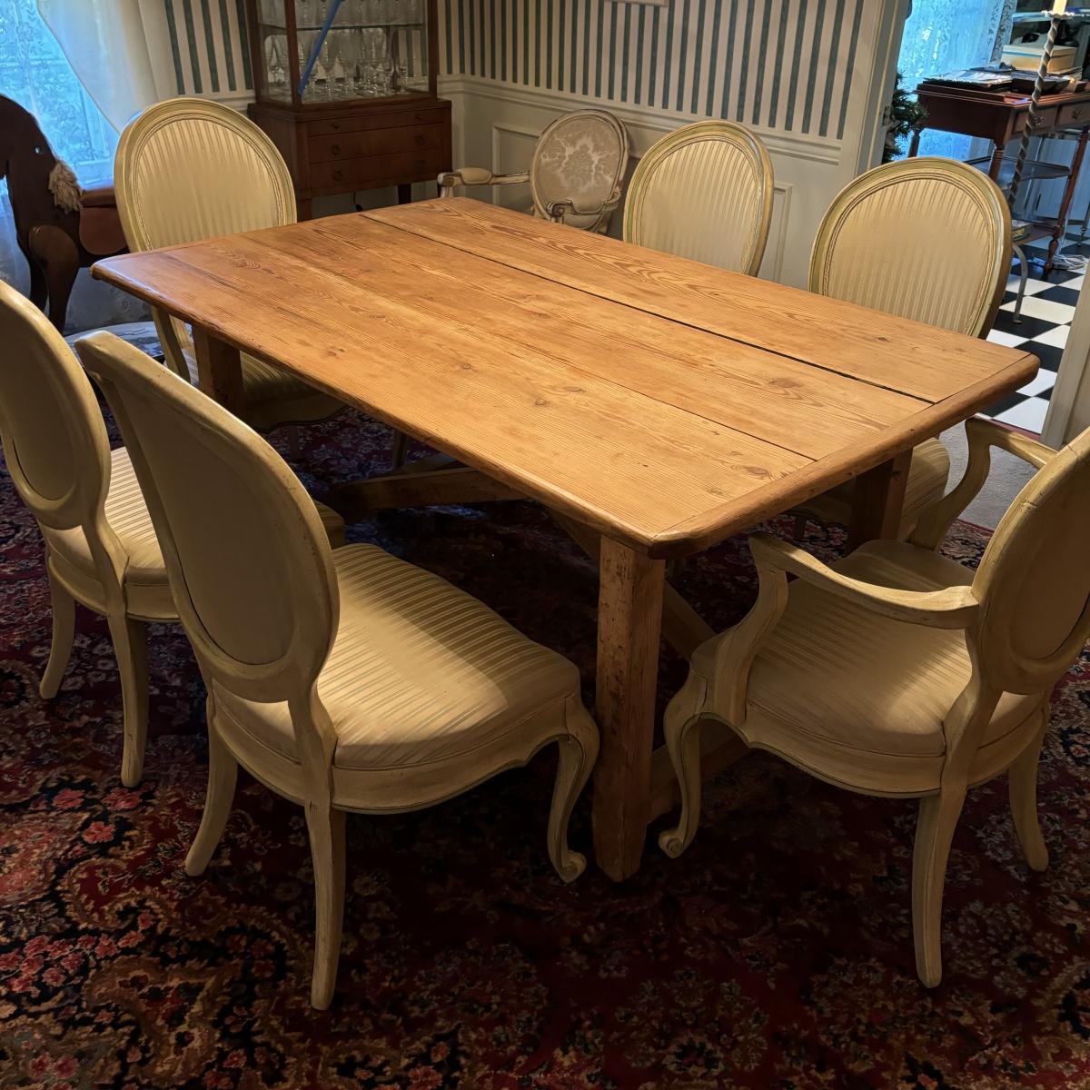 LOT 28: Rustic Farmhouse Table w/French Country Upholstered Cottage Chairs