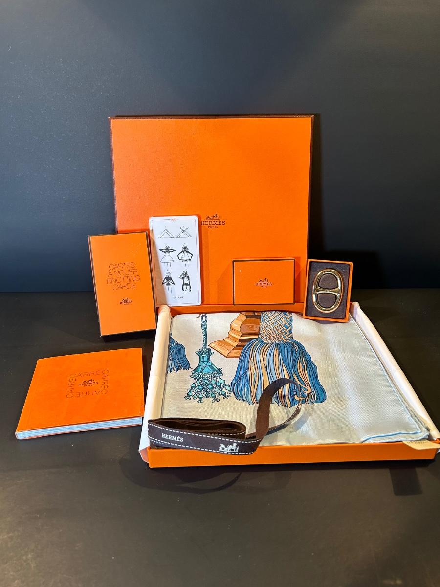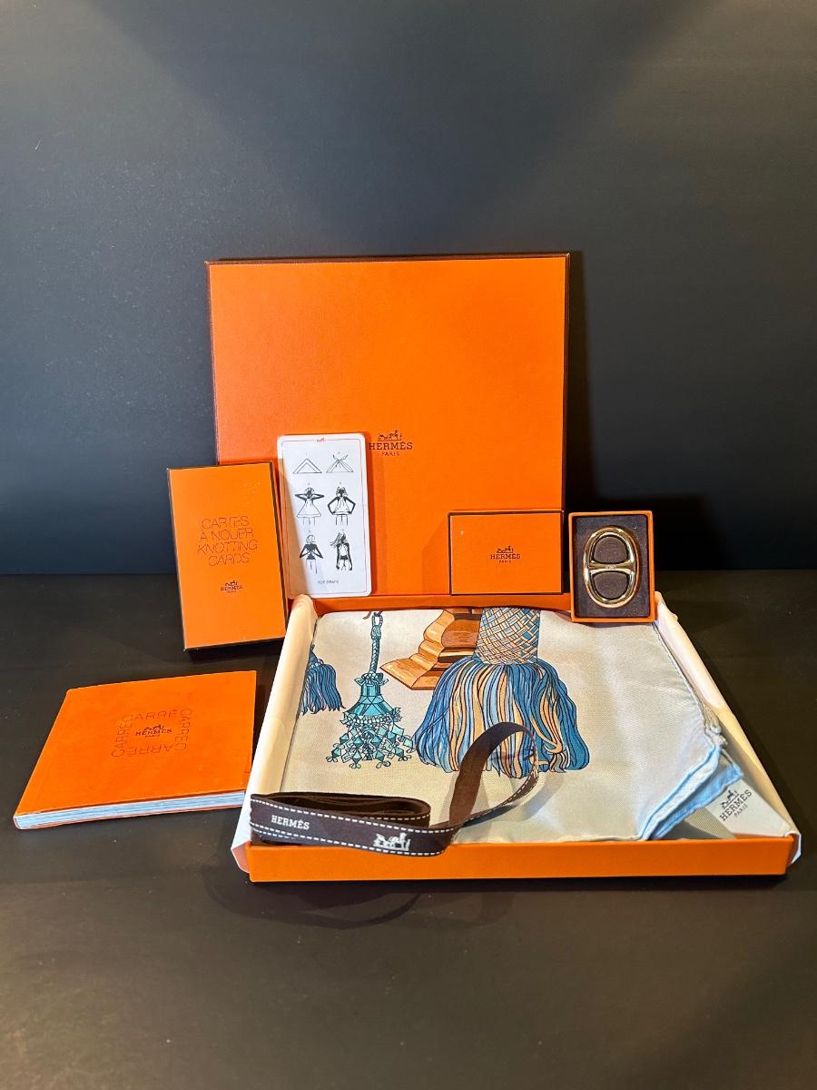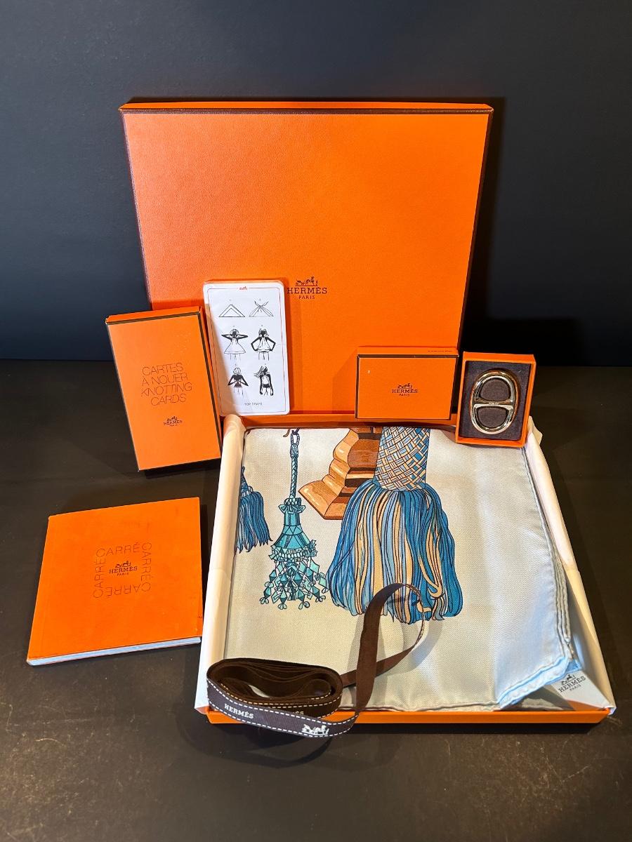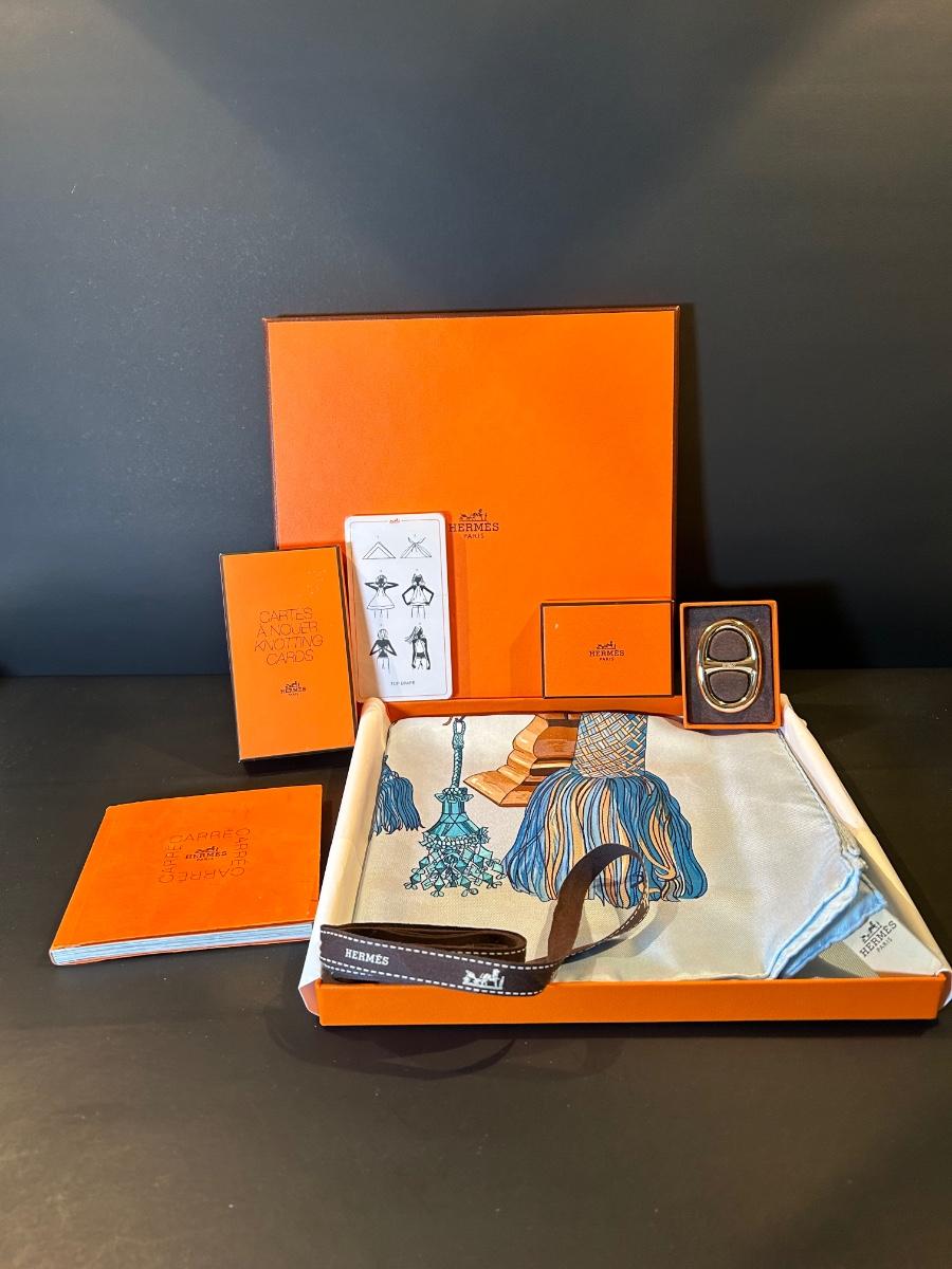 LOT 50BR: Hermes Silk Scarf & Hermes Gold Scarf Clip - Includes Hermes Boxes, Style Cards and Book