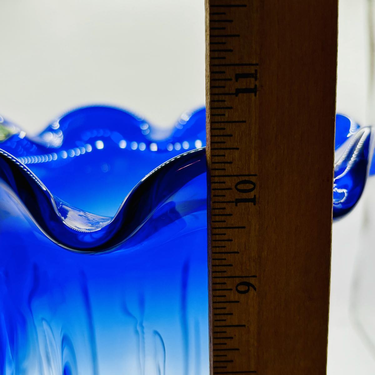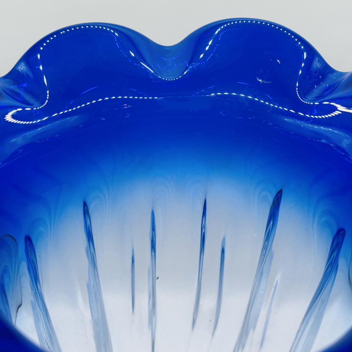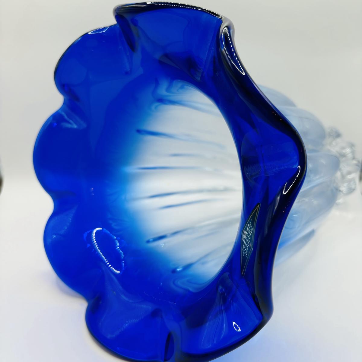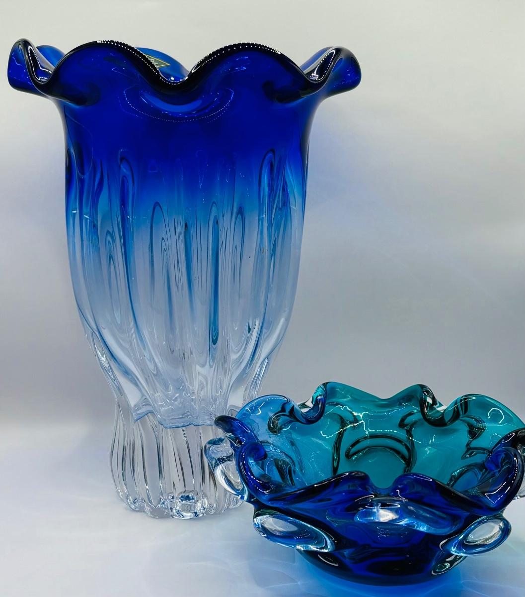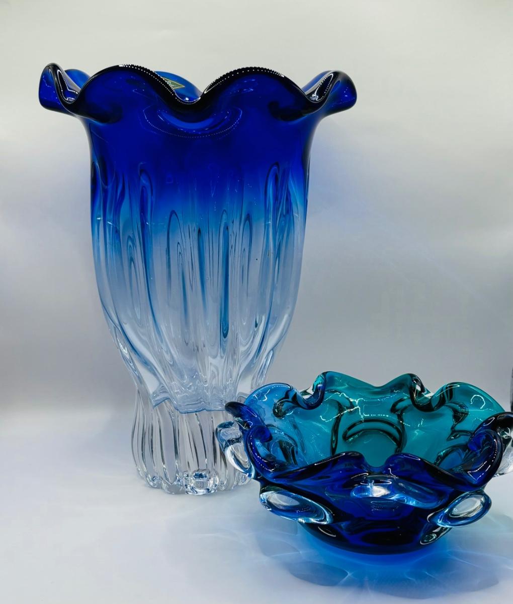 LOT 55: Beautiful Blue to Clear Shannon Crystal Vase & Vintage Murano Style Blue & Green Glass Bowl w/ Wavy Petals