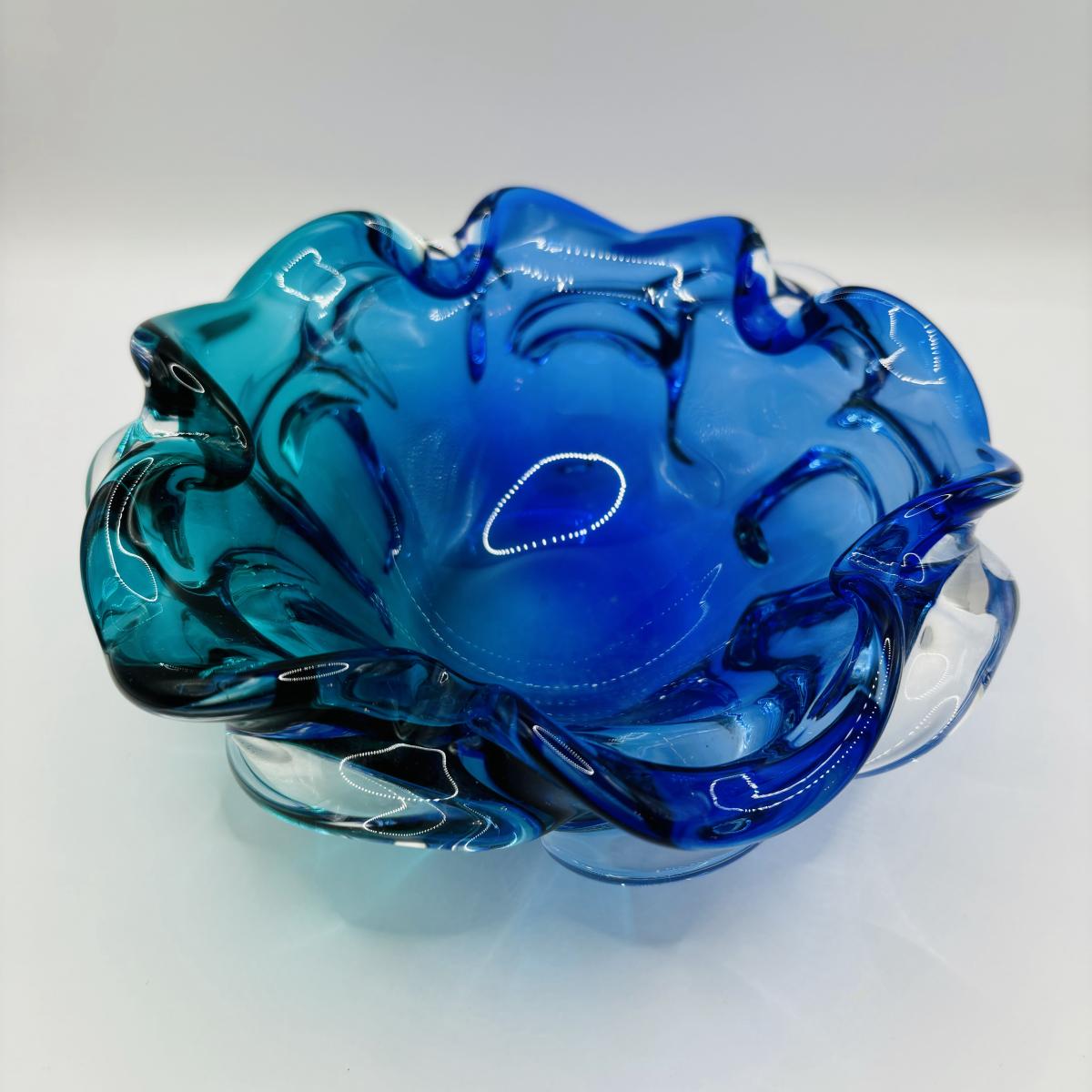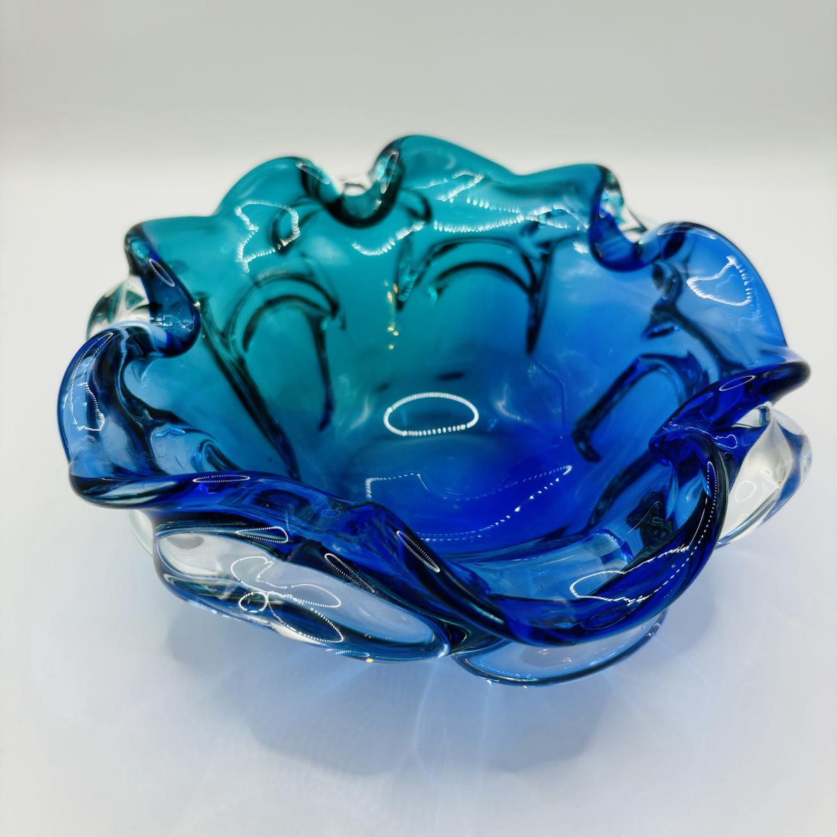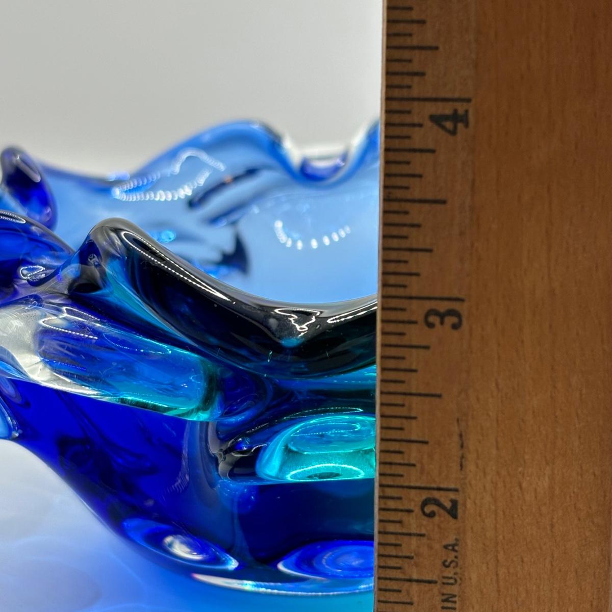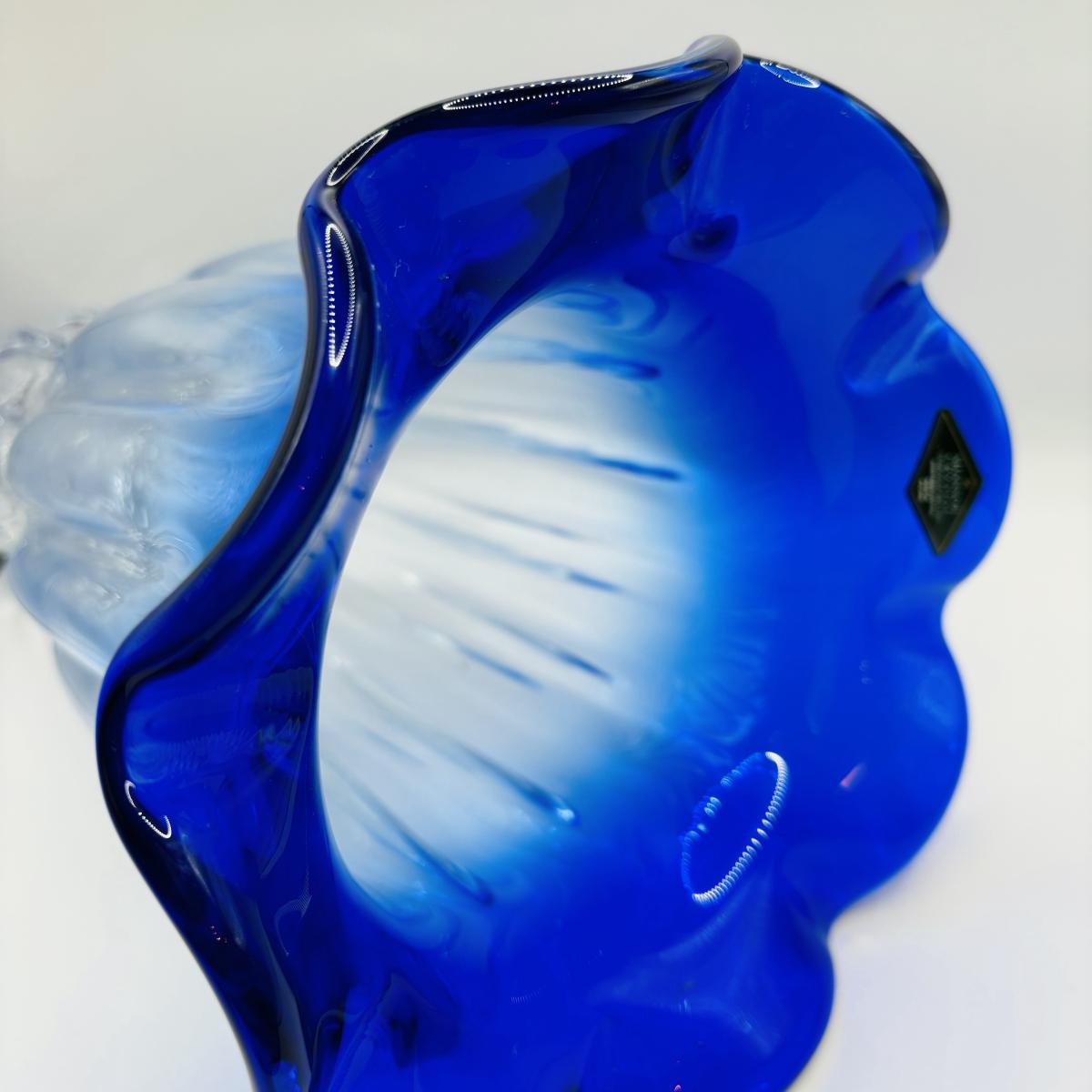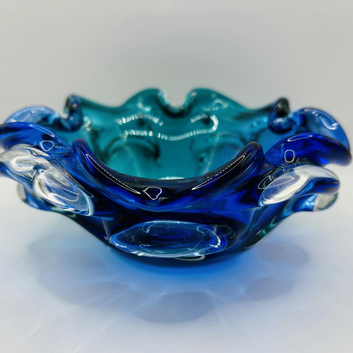 LOT 55: Beautiful Blue to Clear Shannon Crystal Vase & Vintage Murano Style Blue & Green Glass Bowl w/ Wavy Petals