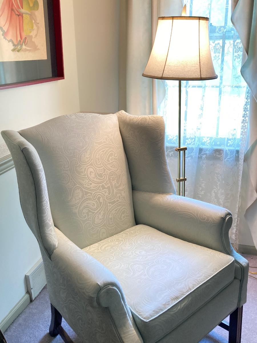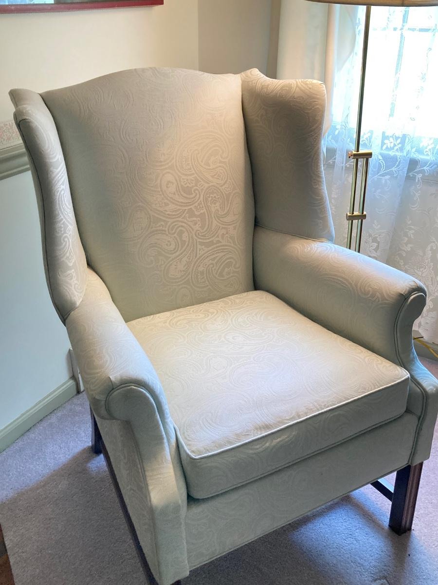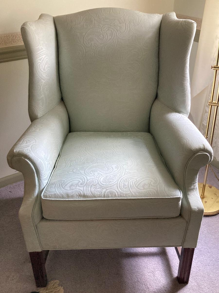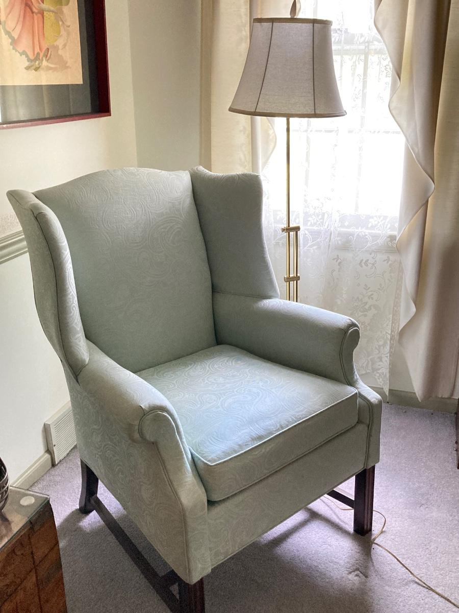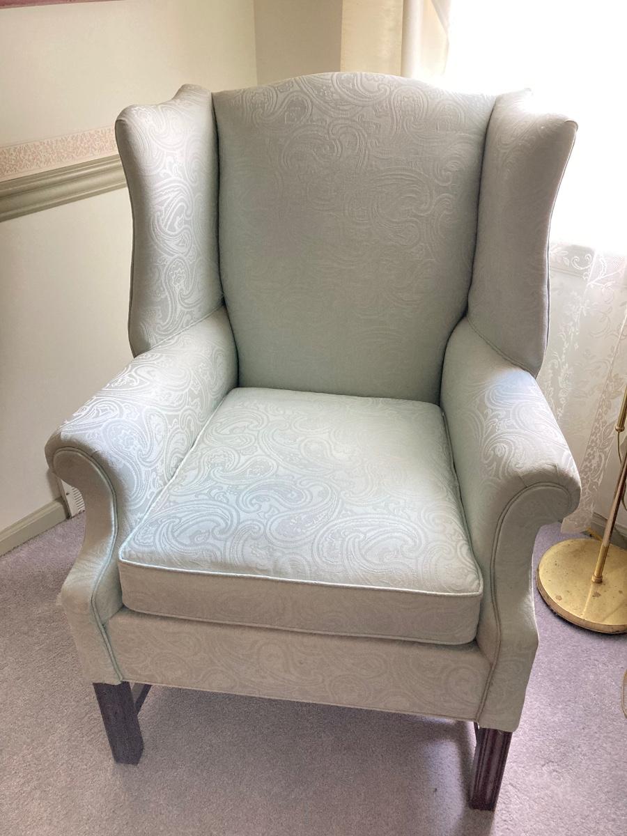 LOT 84: Beautiful High Back Paisley Upholstered Armchair and Brass Floor Lamp