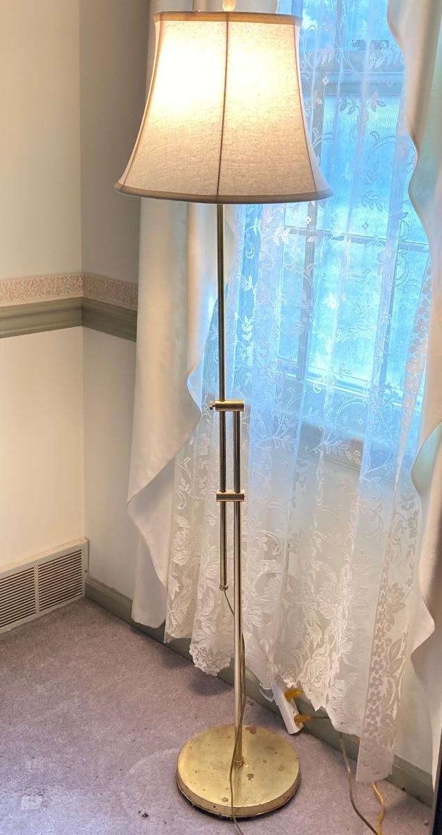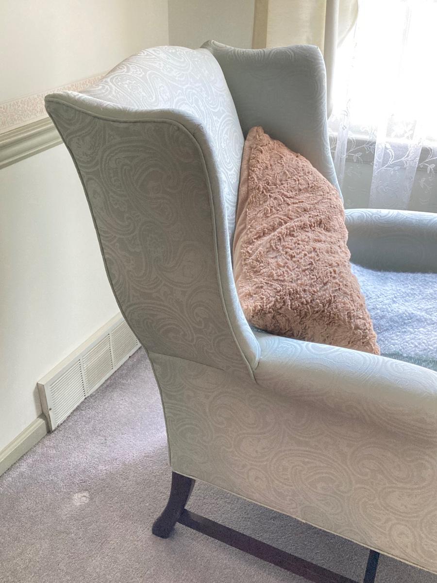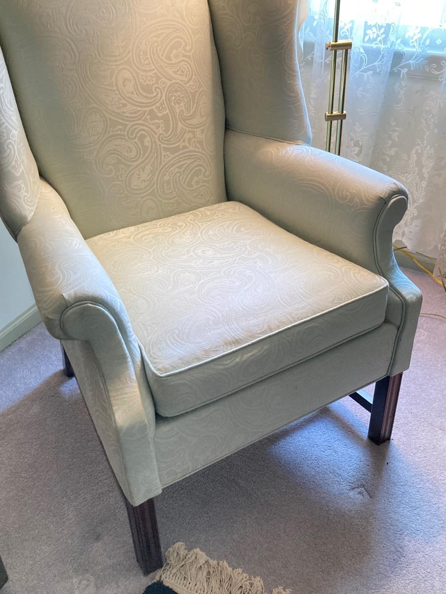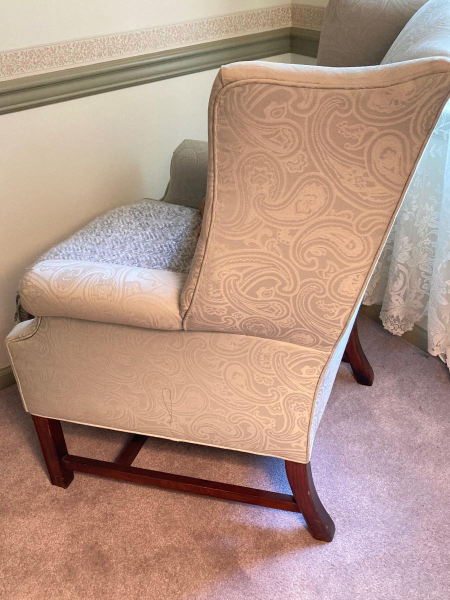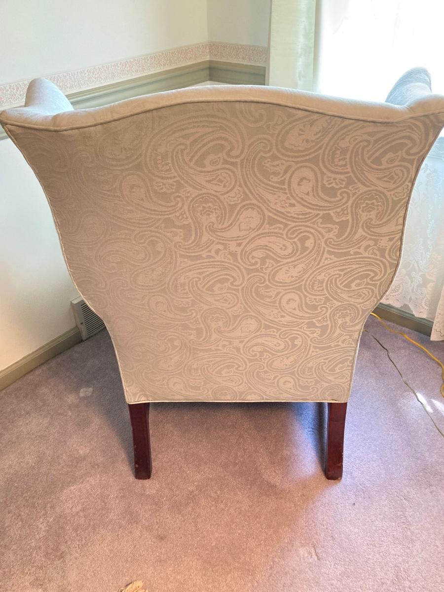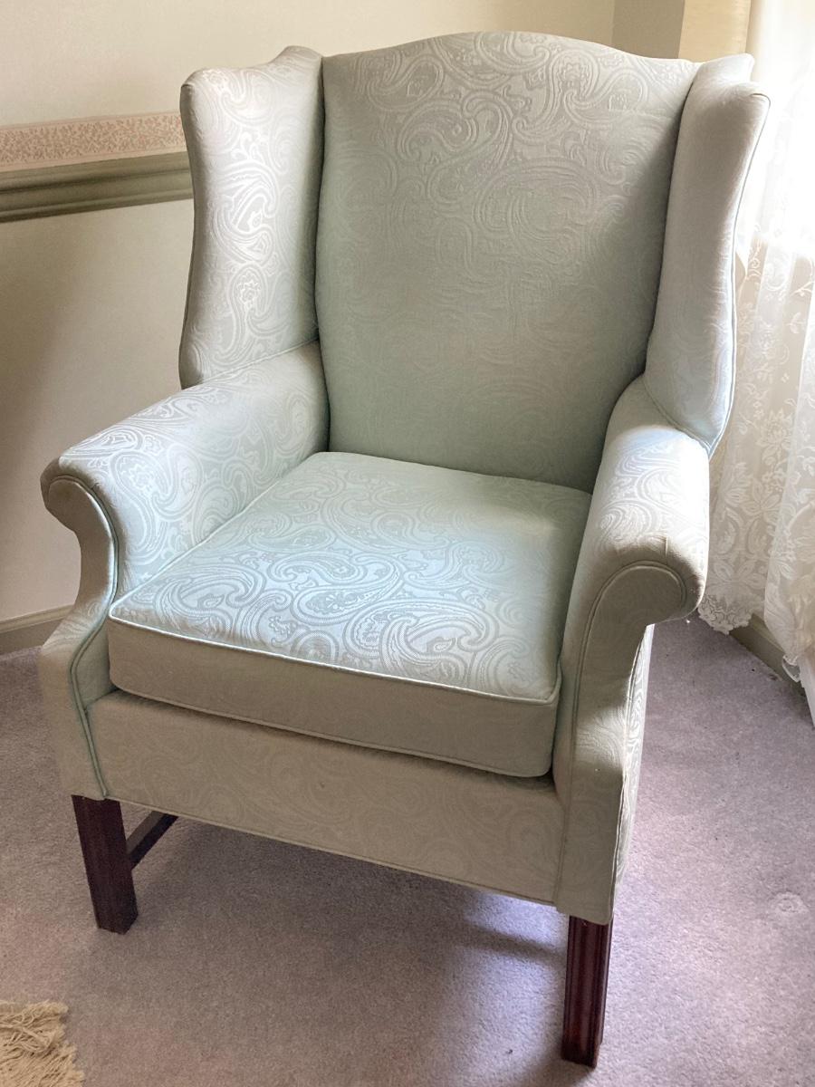 LOT 84: Beautiful High Back Paisley Upholstered Armchair and Brass Floor Lamp
