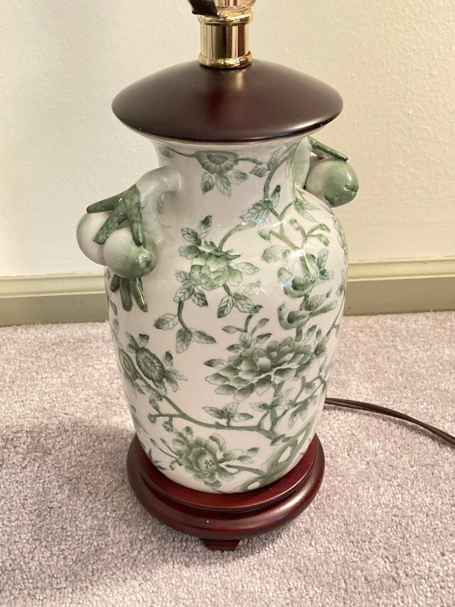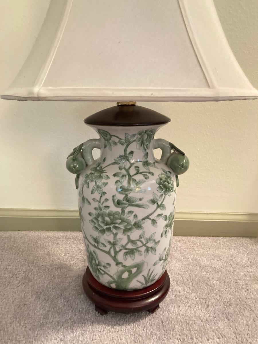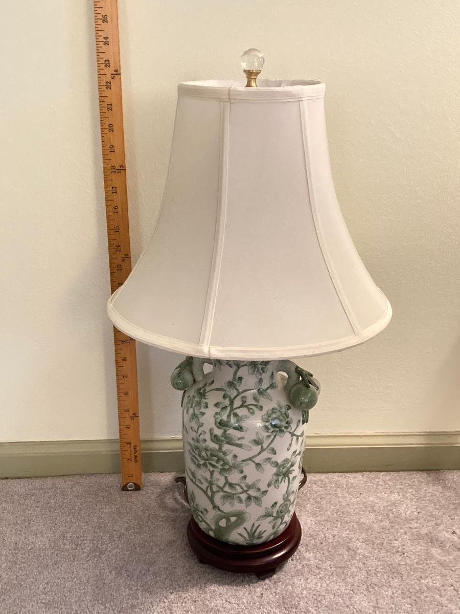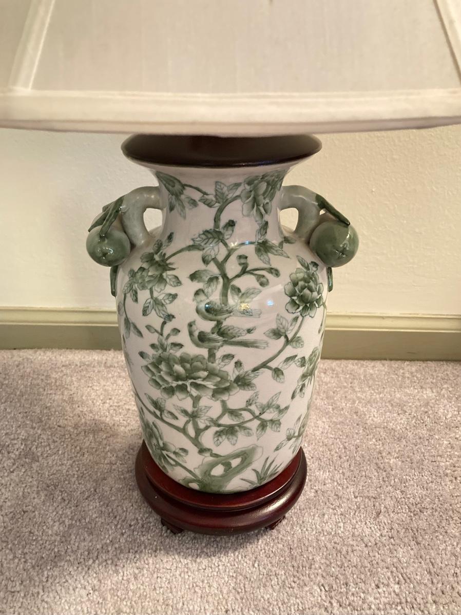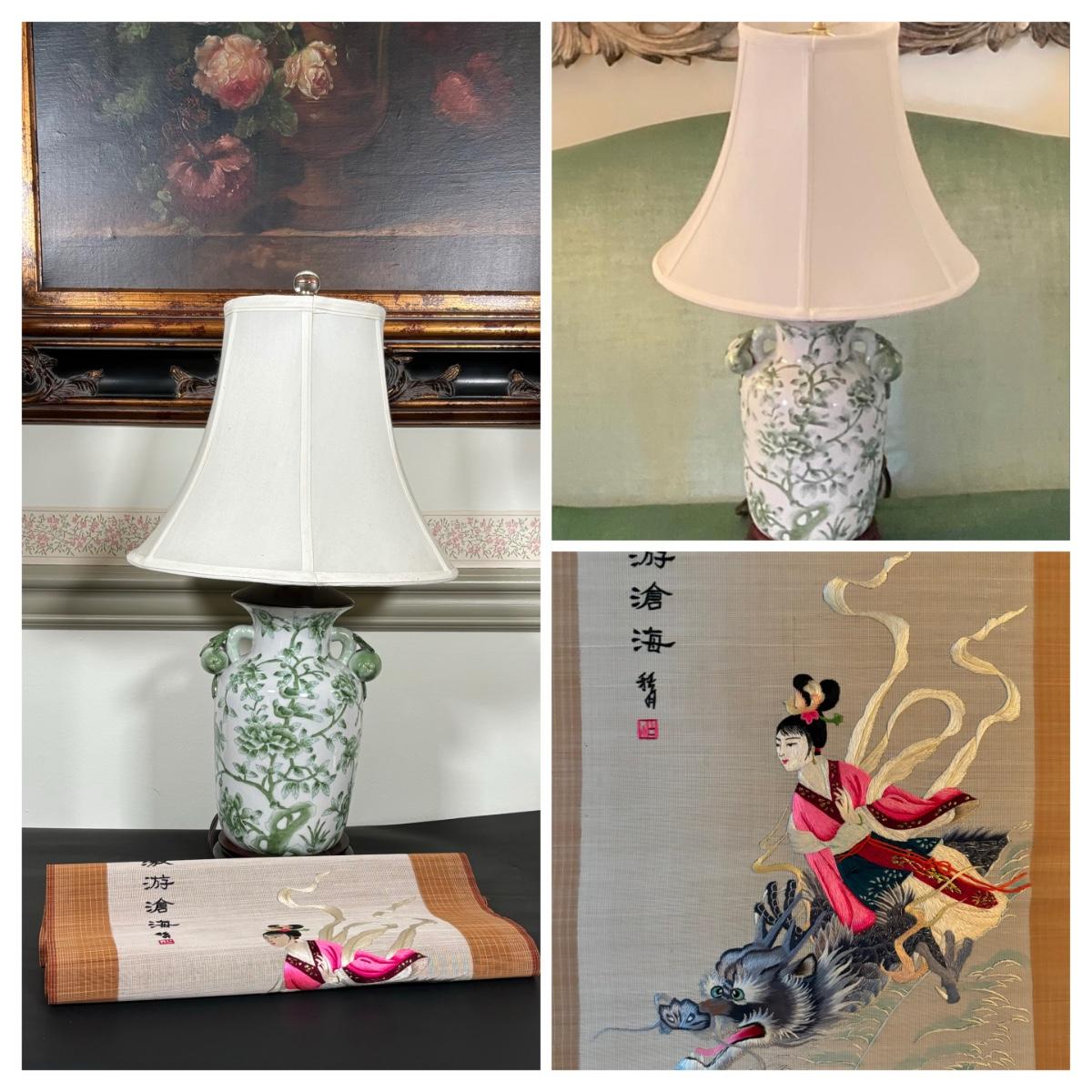 LOT 96: Green Fern Style Porcelain Lamp and Asian Dragon / Lady Art Scroll