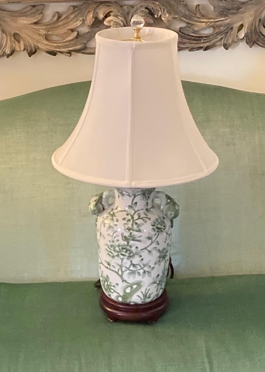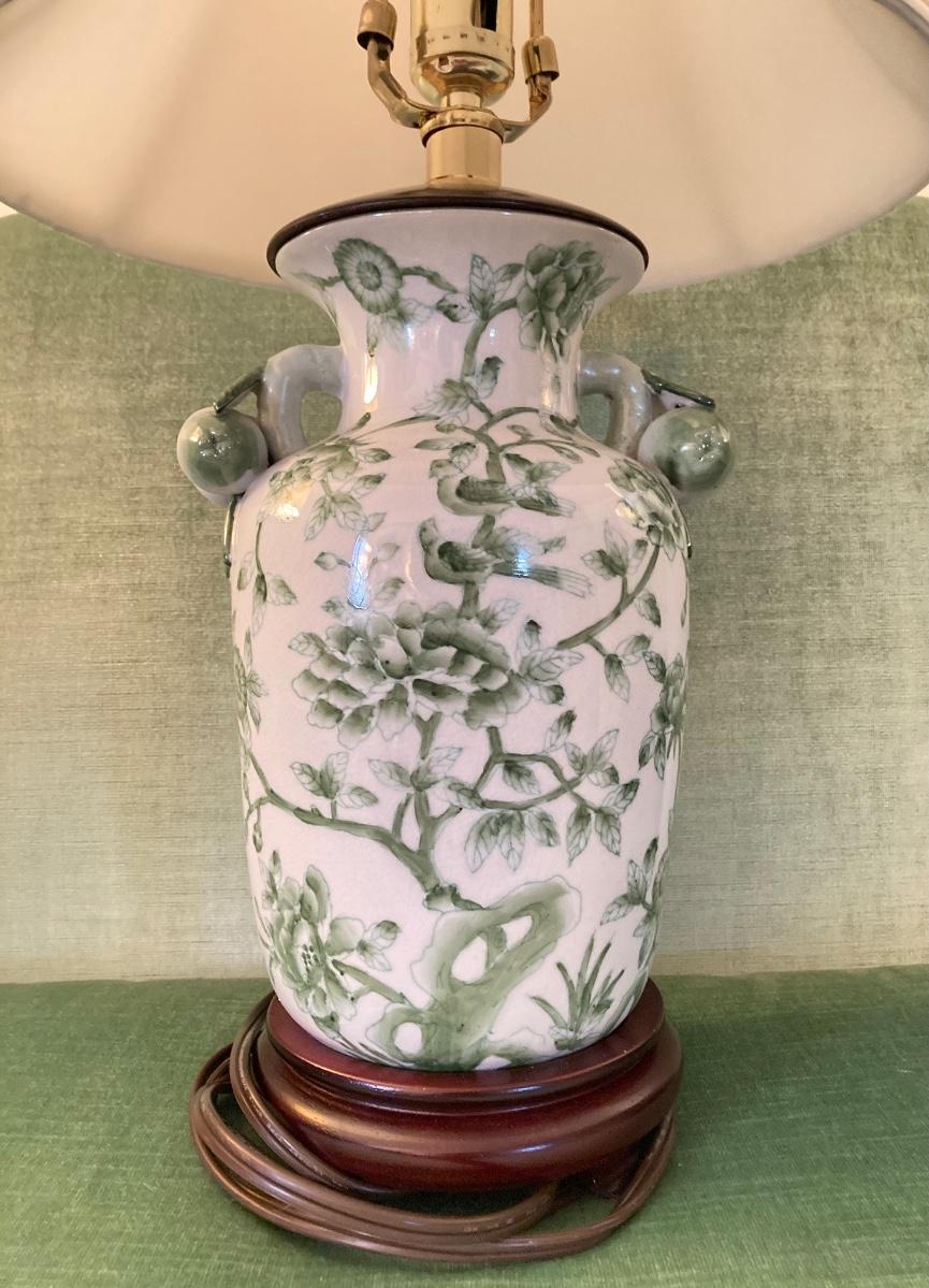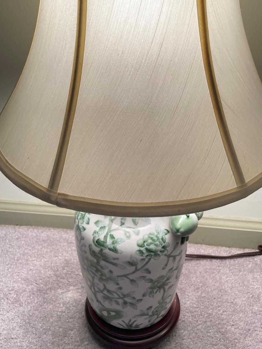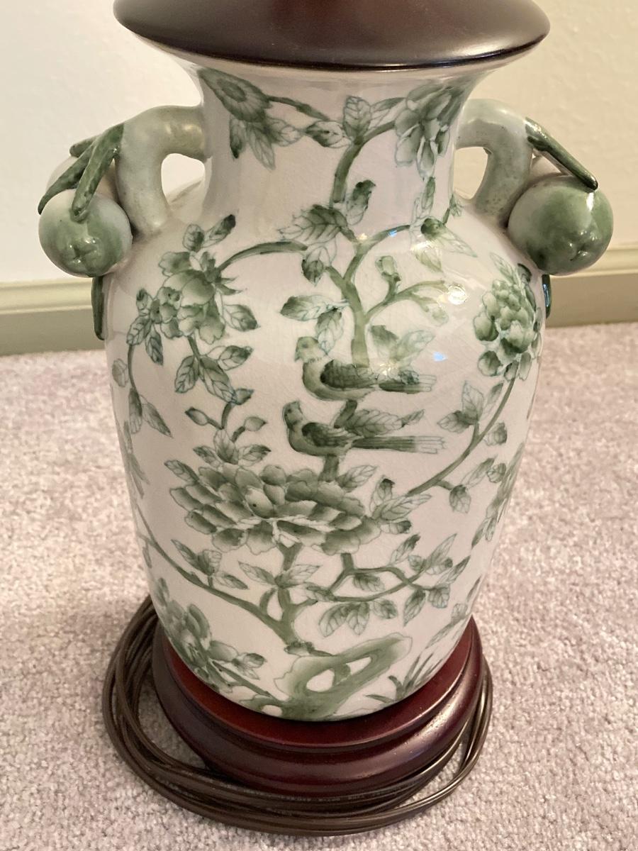 LOT 96: Green Fern Style Porcelain Lamp and Asian Dragon / Lady Art Scroll