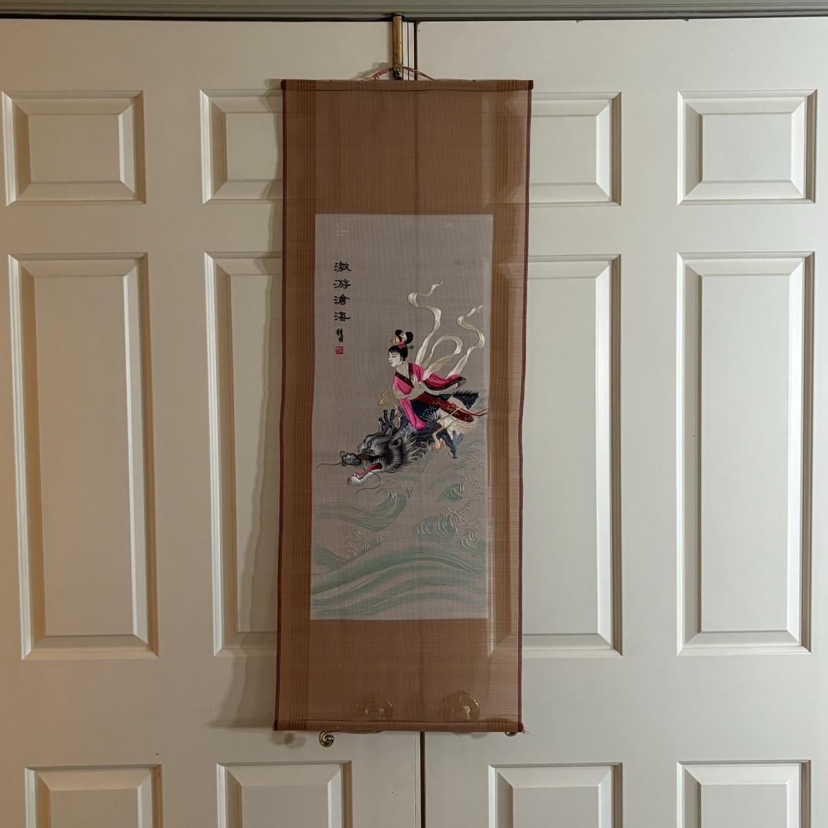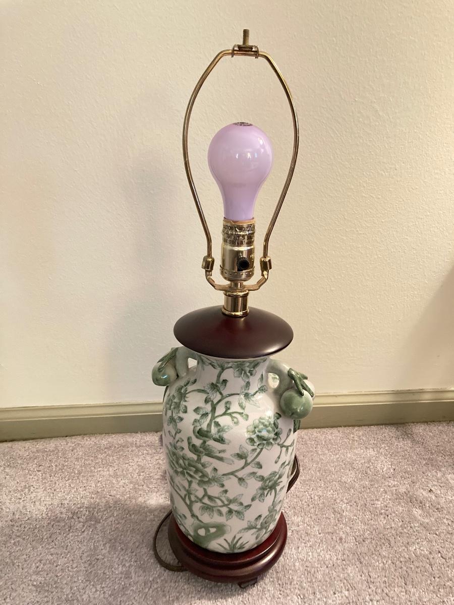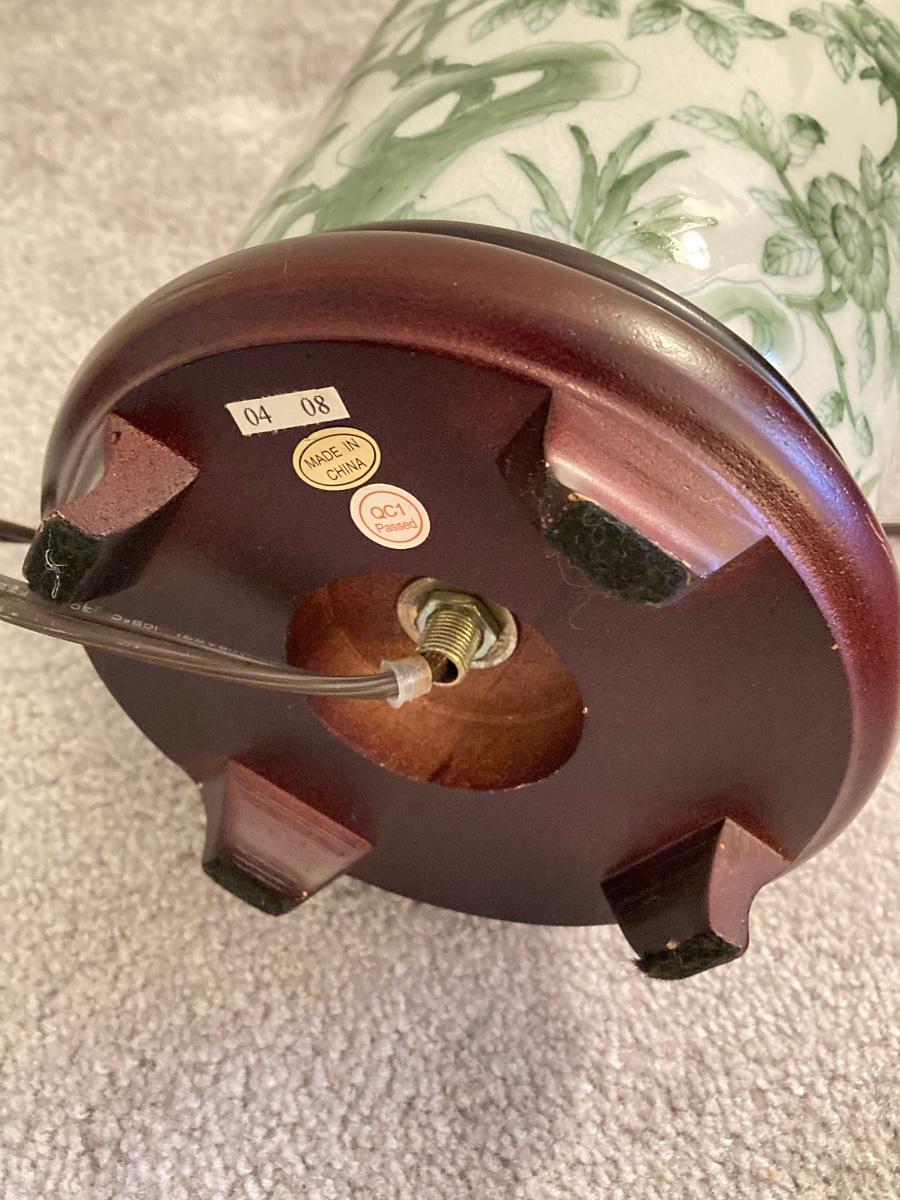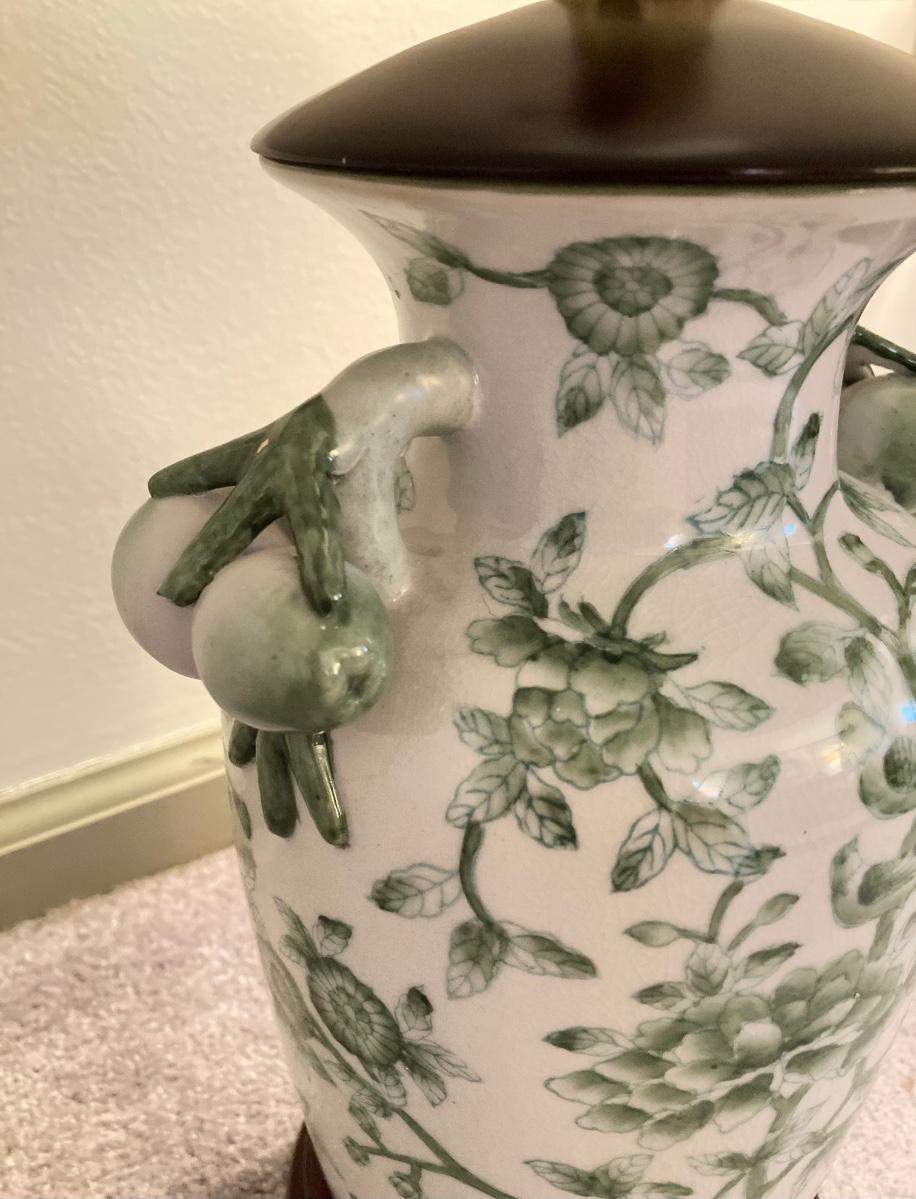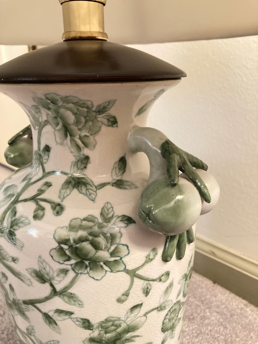 LOT 96: Green Fern Style Porcelain Lamp and Asian Dragon / Lady Art Scroll