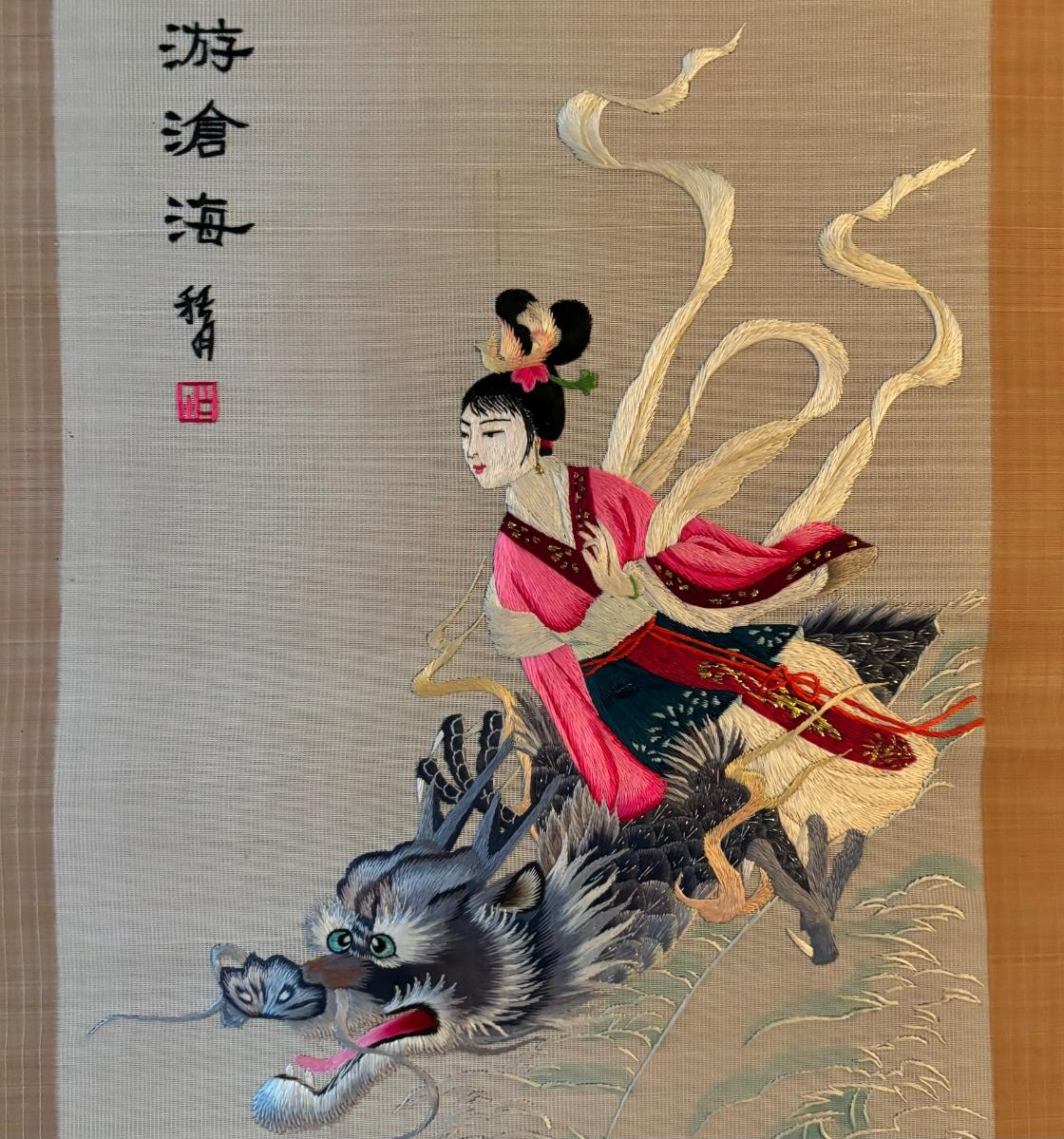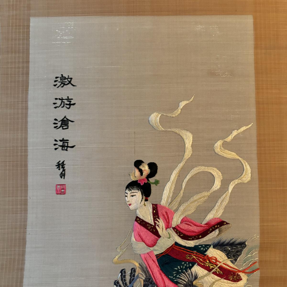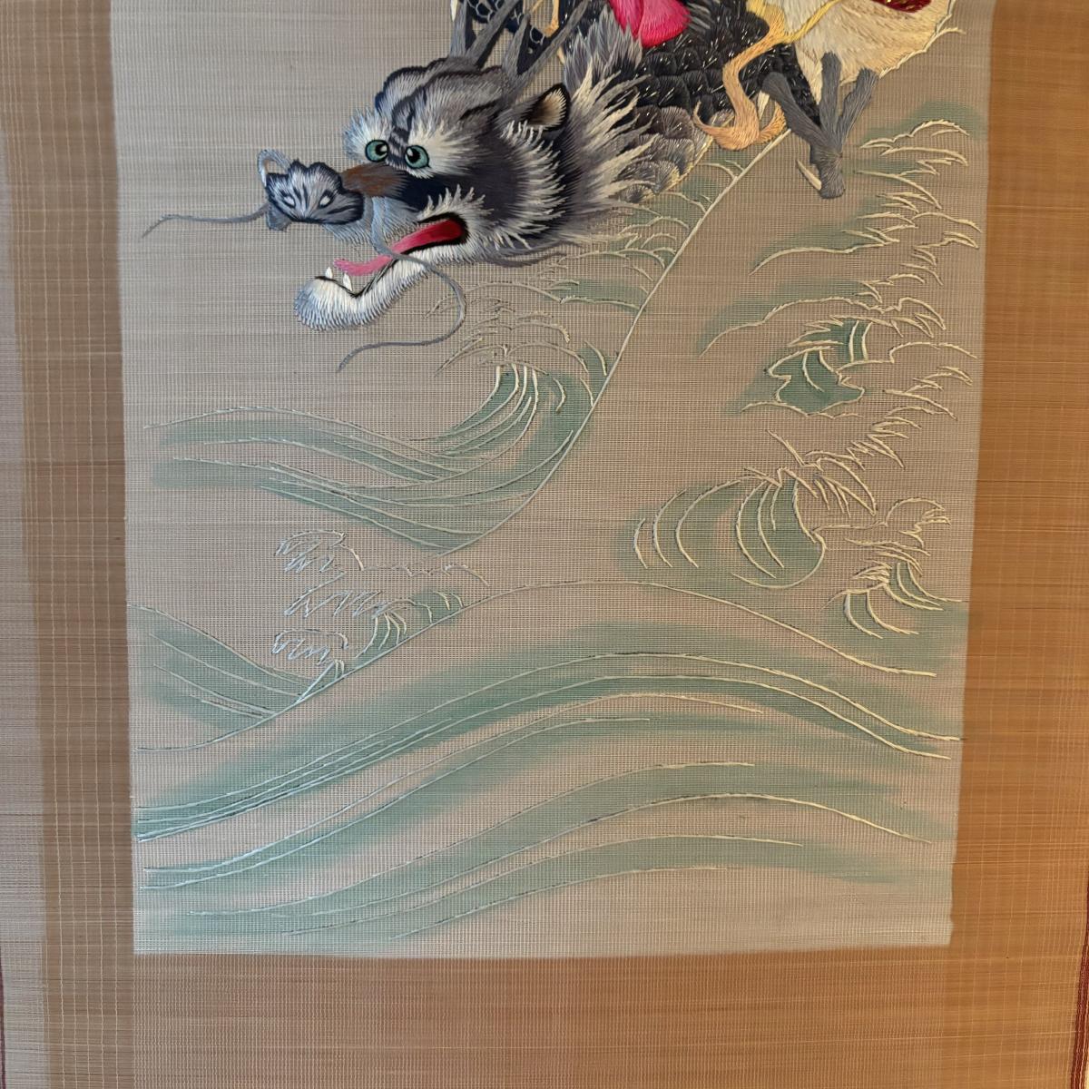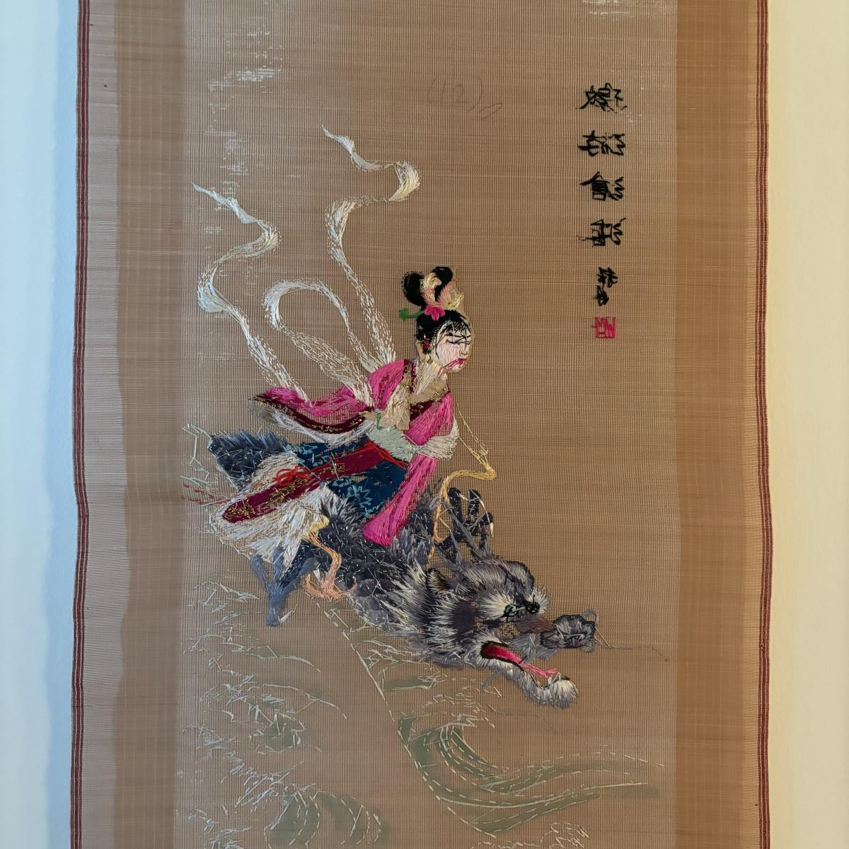 LOT 96: Green Fern Style Porcelain Lamp and Asian Dragon / Lady Art Scroll
