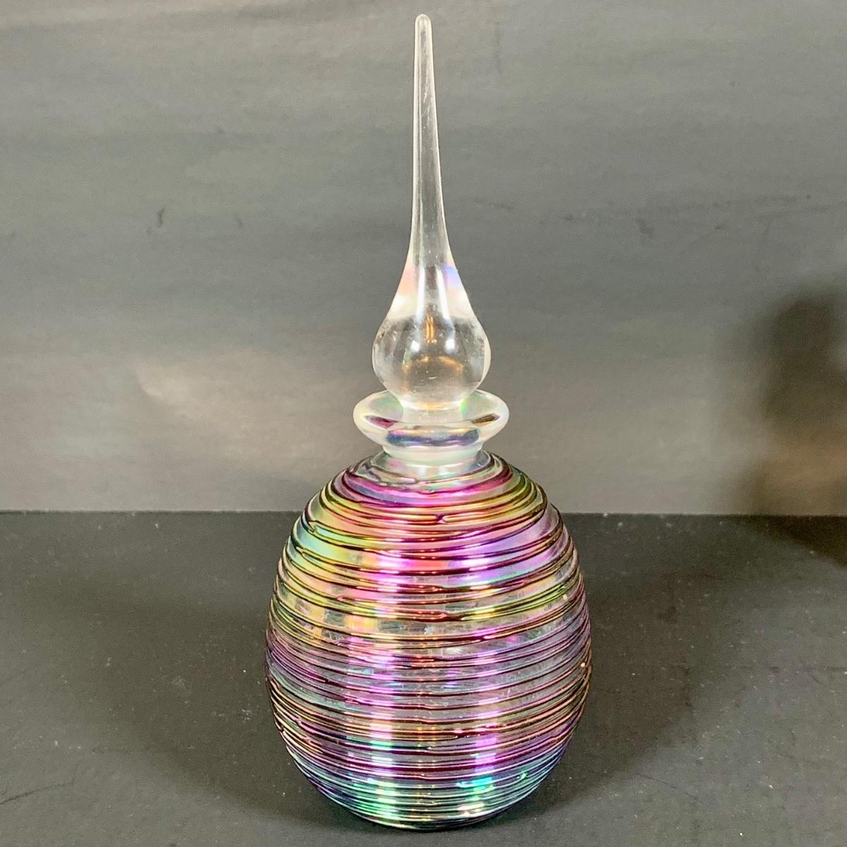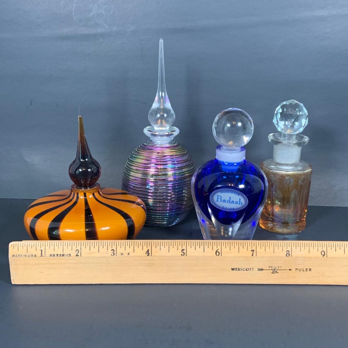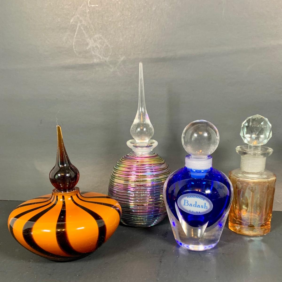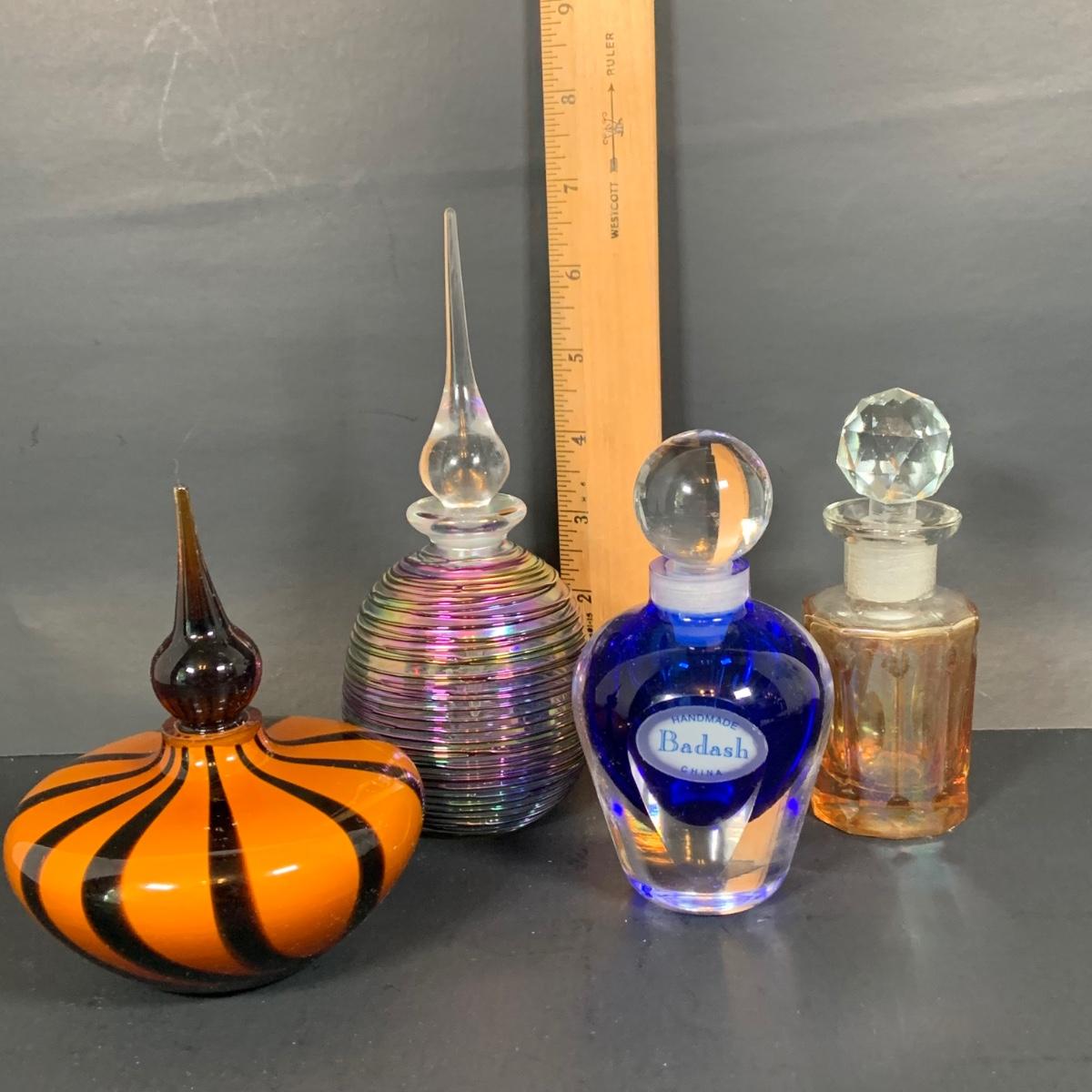 LOT:113: Beautiful Collection of Blown Glass Perfume Bottles- Two Handmade Badash Perfume Bottles, Iridesent Art Glass Bottle and Amber Czech Glass Bottle