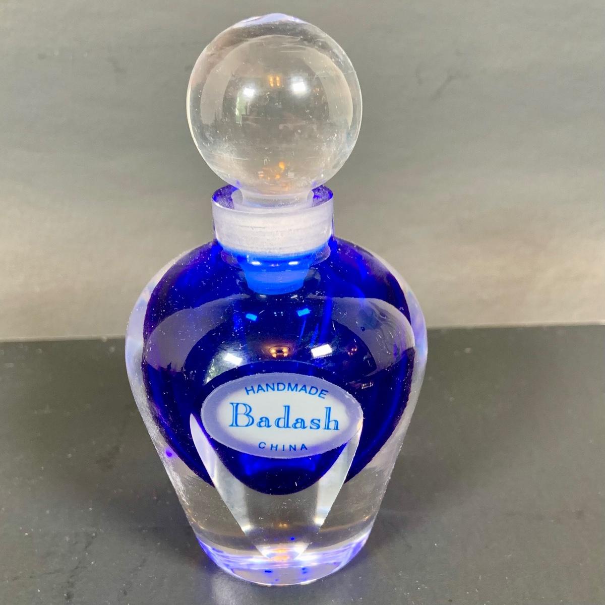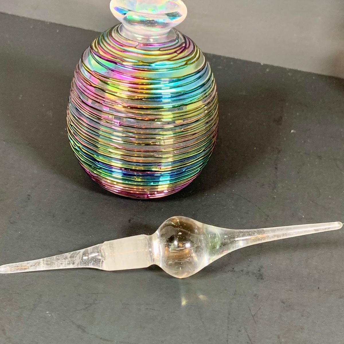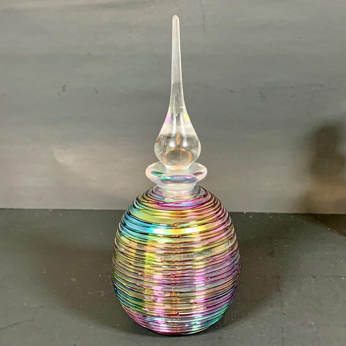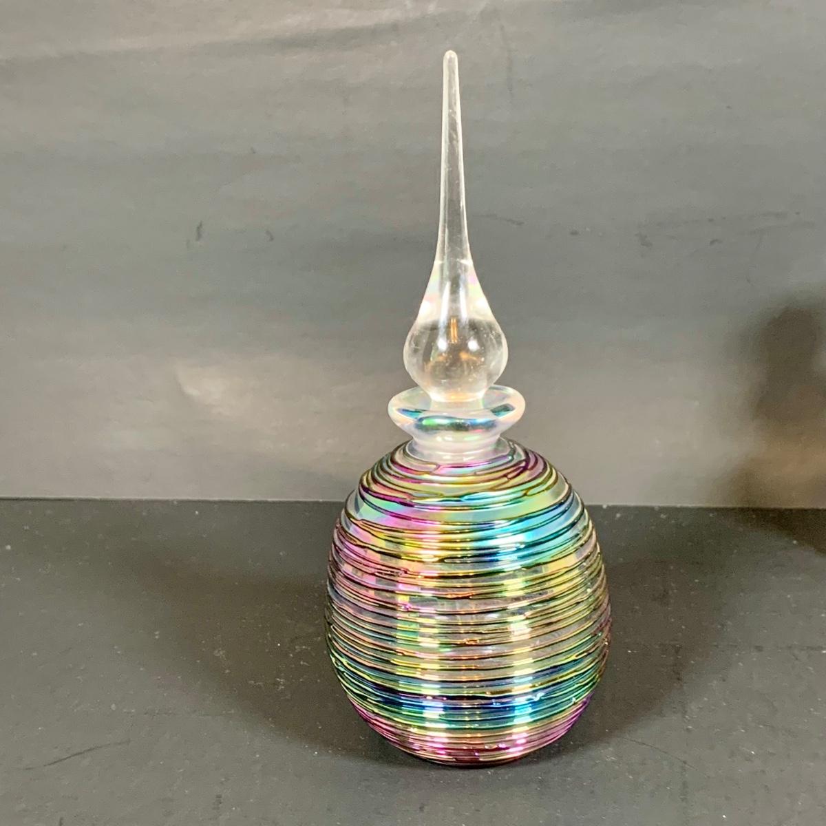 LOT:113: Beautiful Collection of Blown Glass Perfume Bottles- Two Handmade Badash Perfume Bottles, Iridesent Art Glass Bottle and Amber Czech Glass Bottle