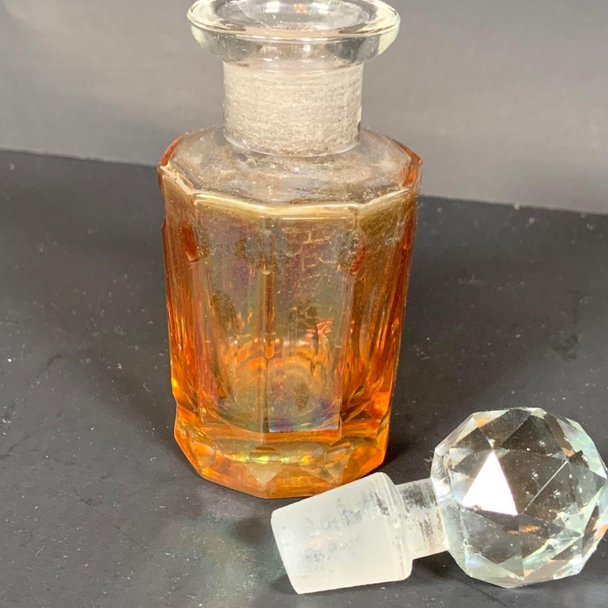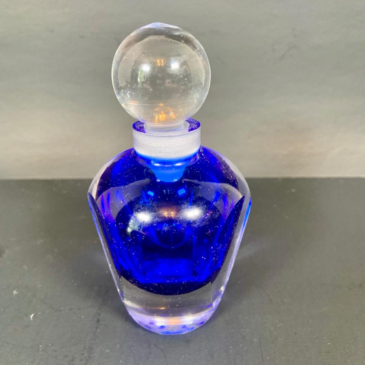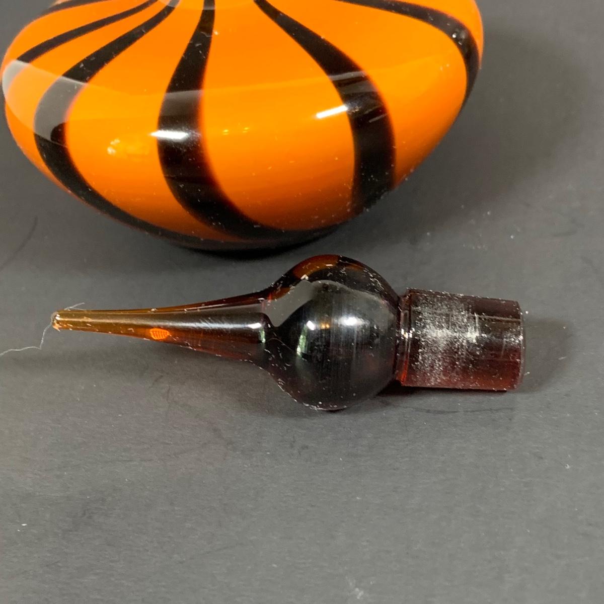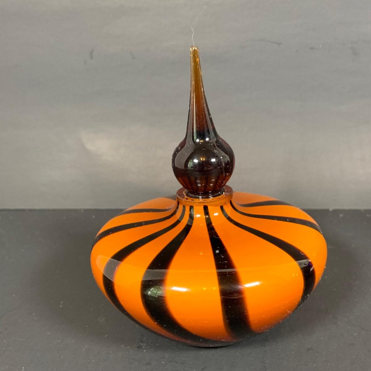 LOT:113: Beautiful Collection of Blown Glass Perfume Bottles- Two Handmade Badash Perfume Bottles, Iridesent Art Glass Bottle and Amber Czech Glass Bottle