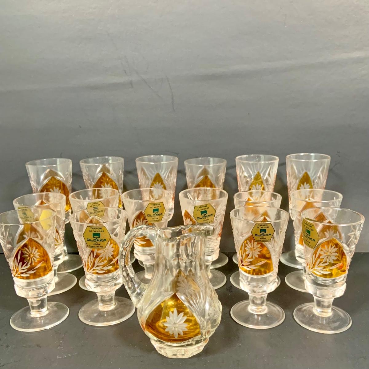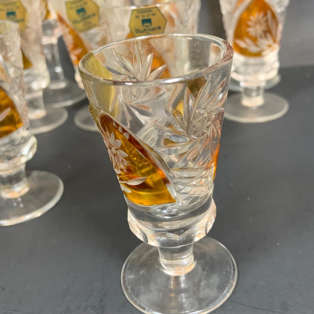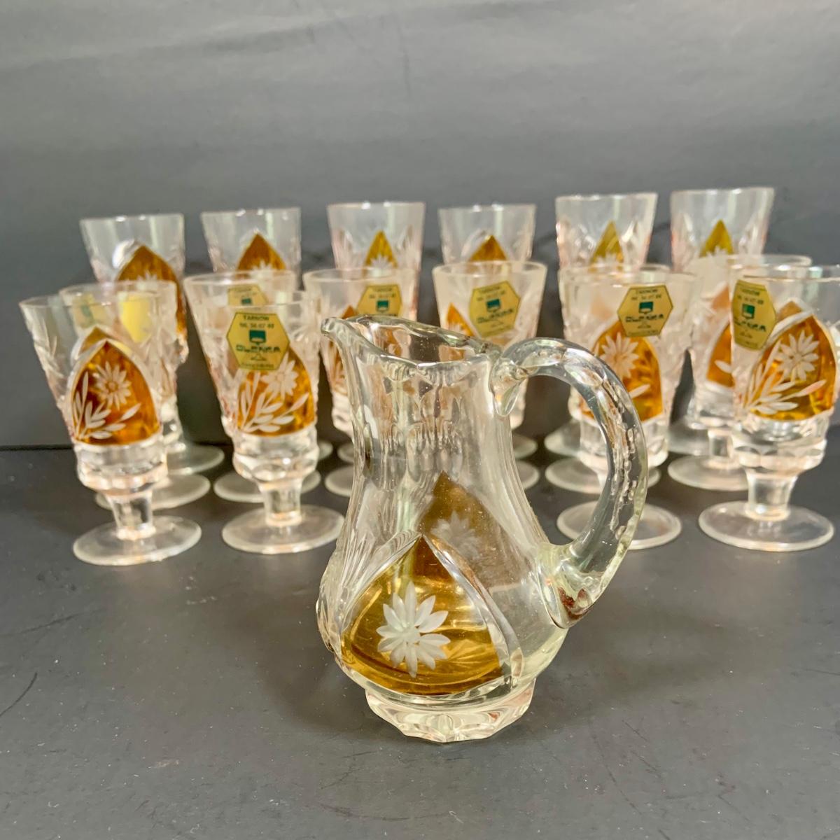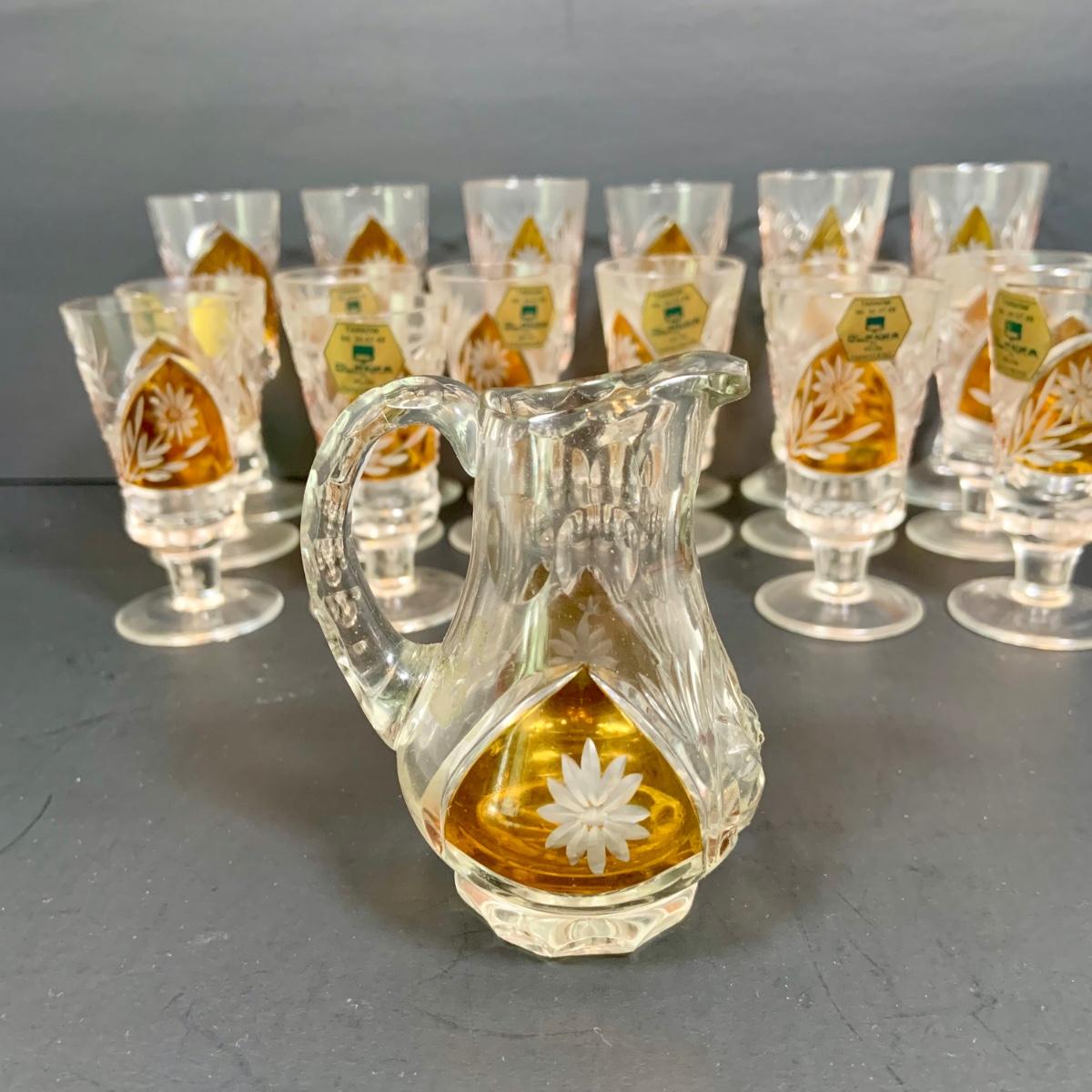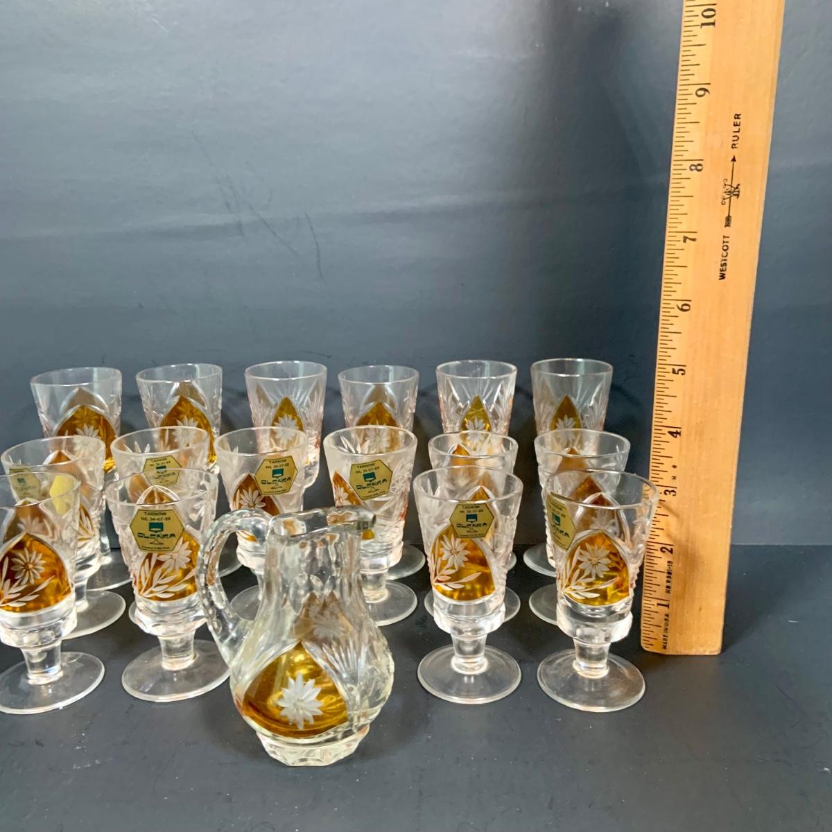 LOT:116: Set of Olenka Amber Cut Glass Crystal Schnapps Glasses and Miniature Pitcher