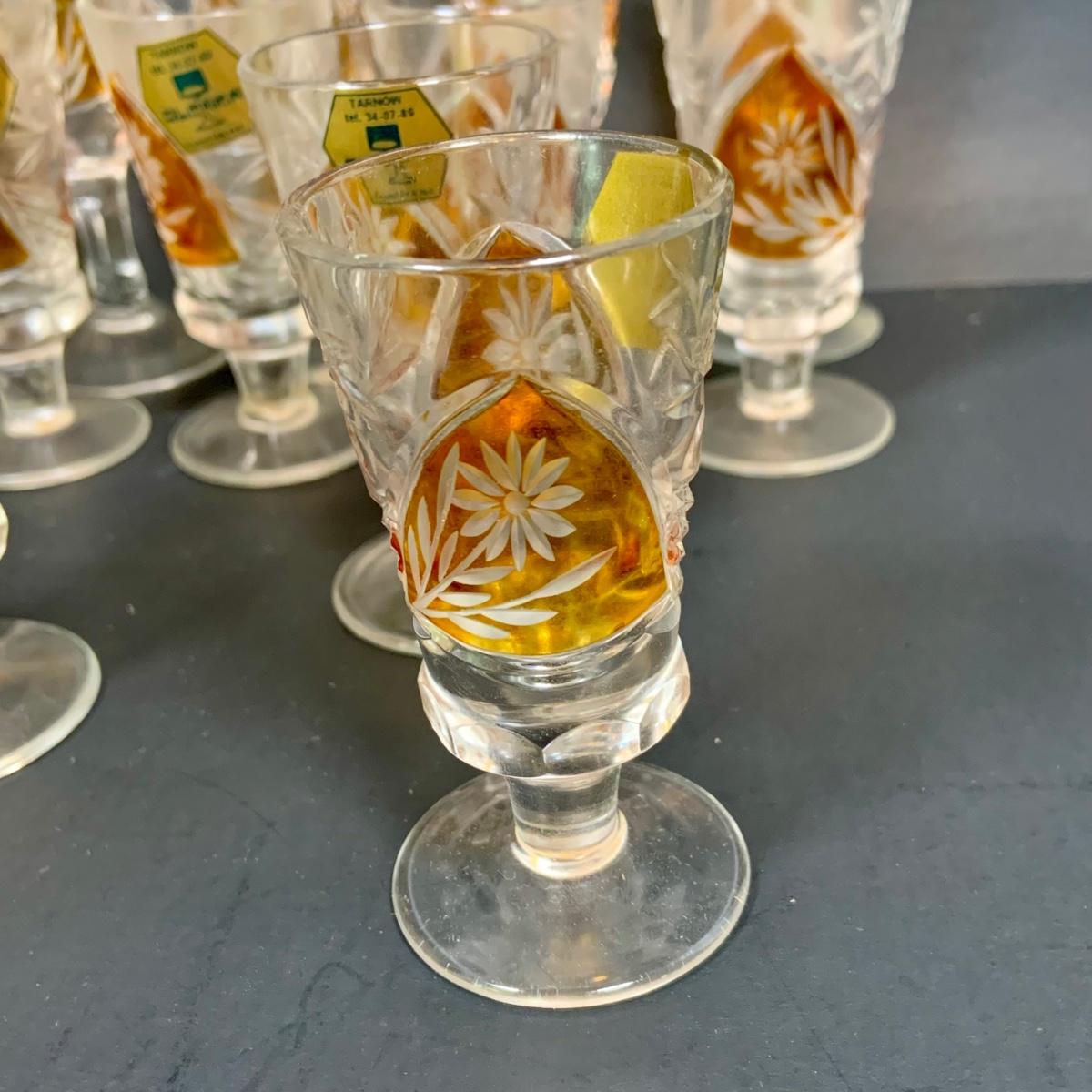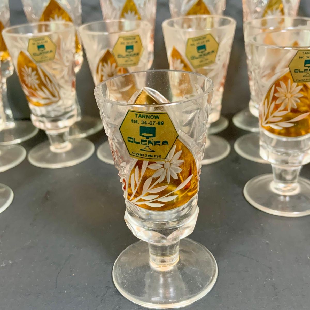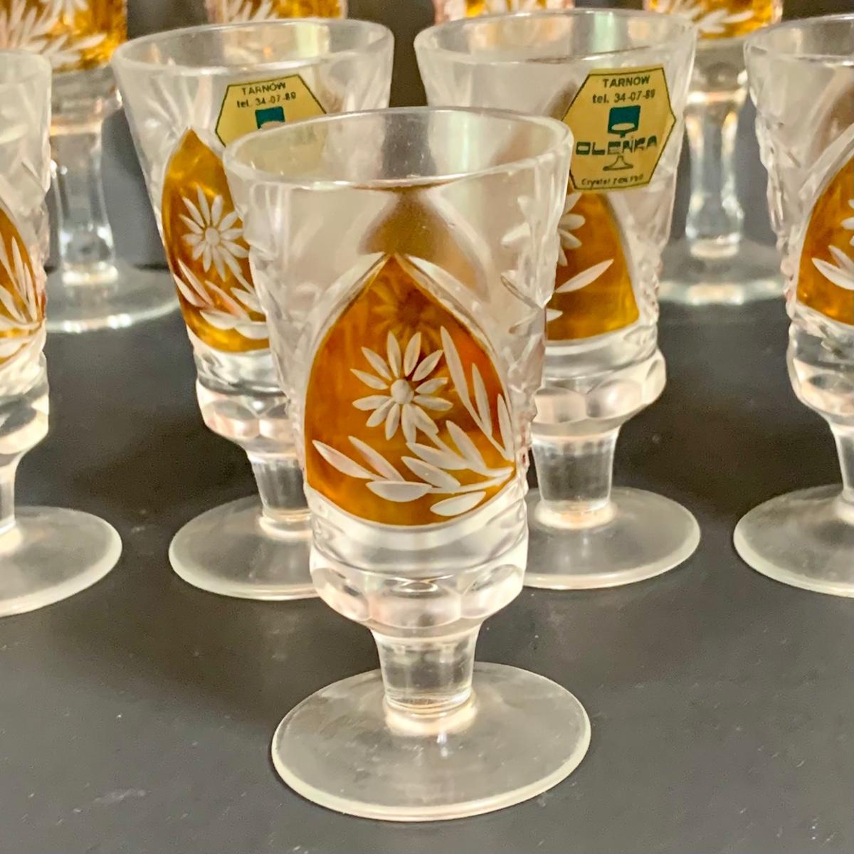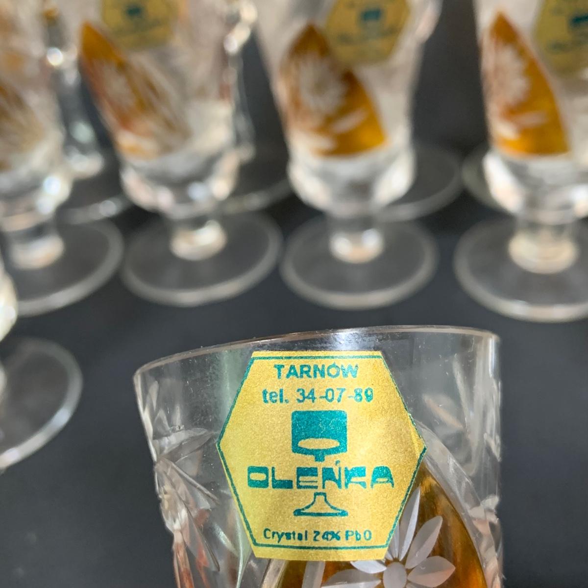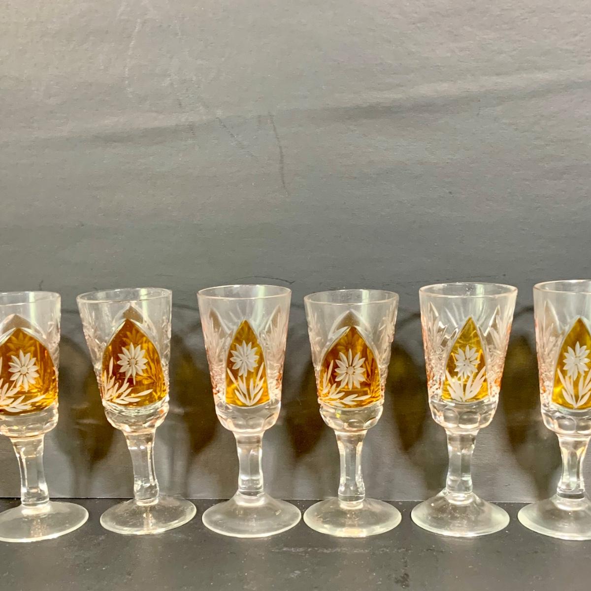 LOT:116: Set of Olenka Amber Cut Glass Crystal Schnapps Glasses and Miniature Pitcher