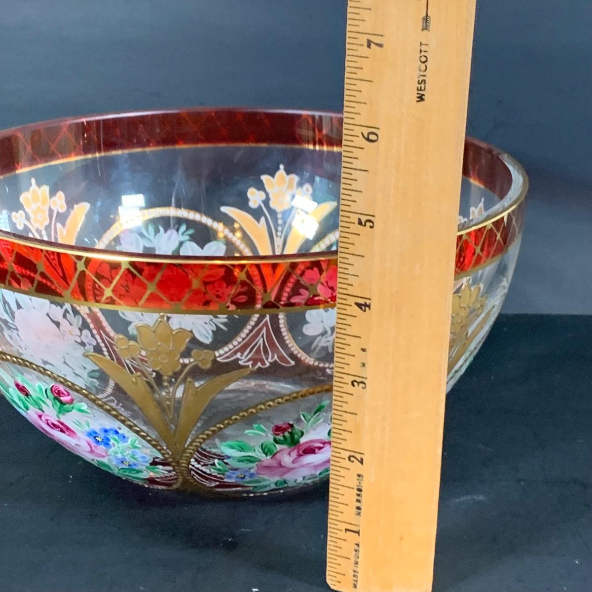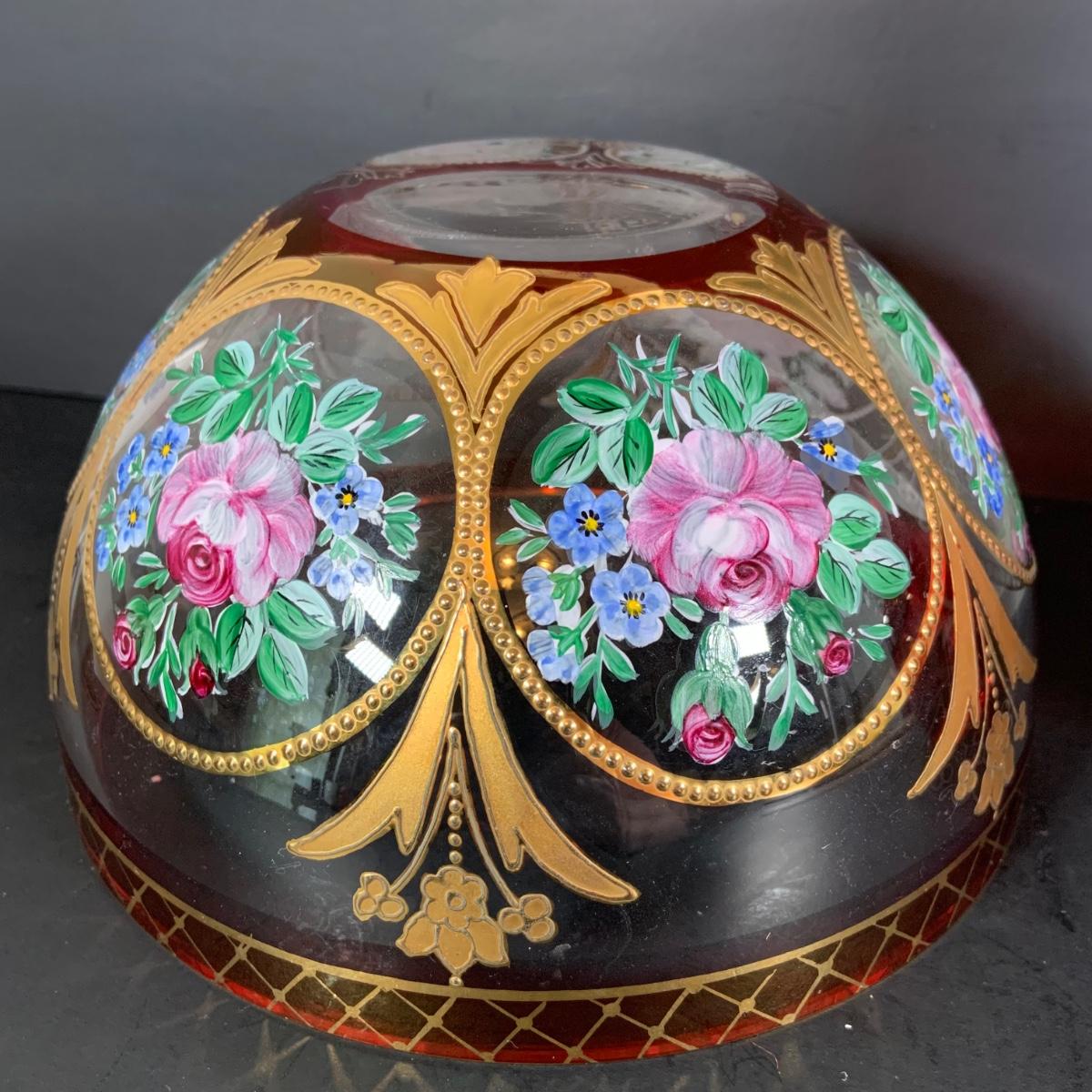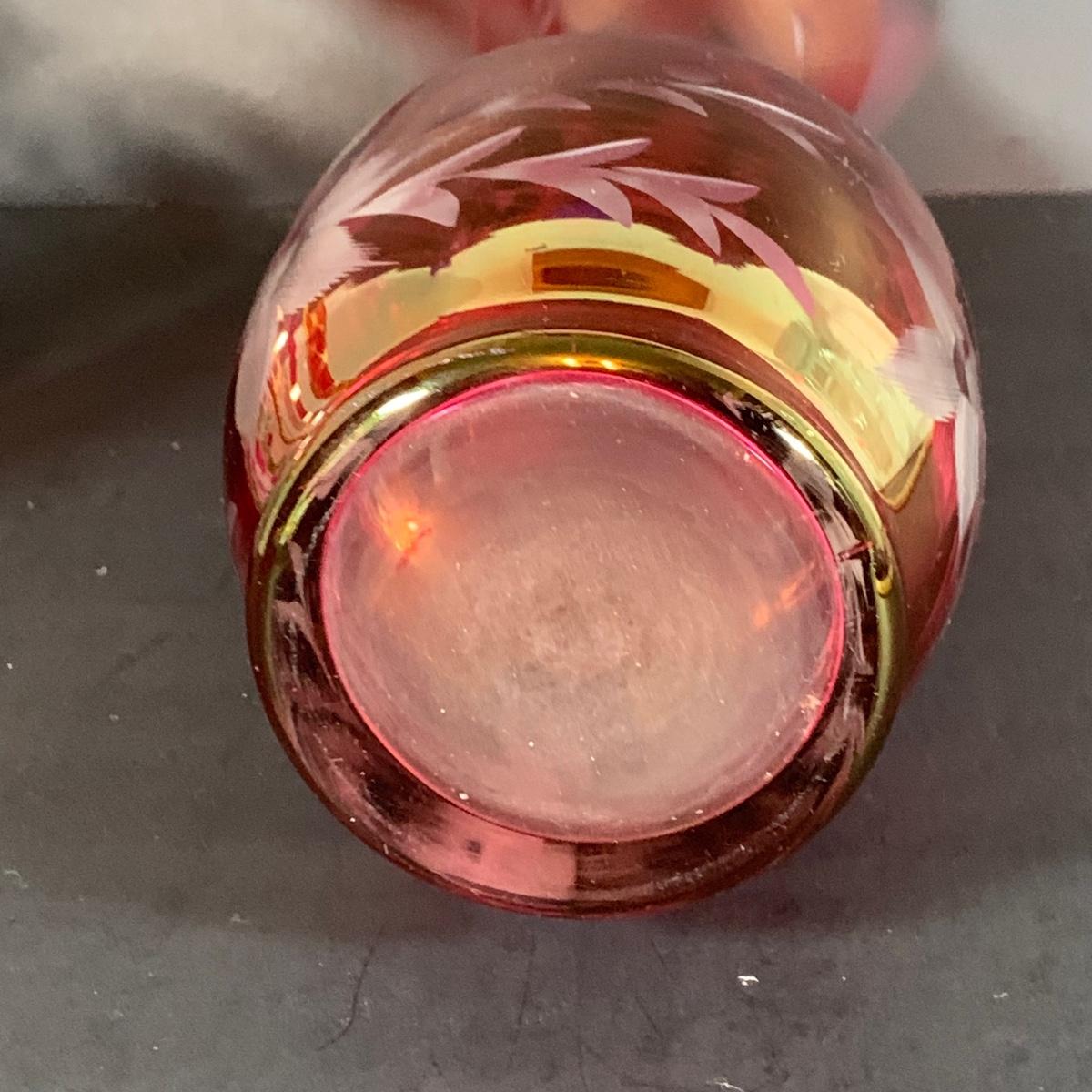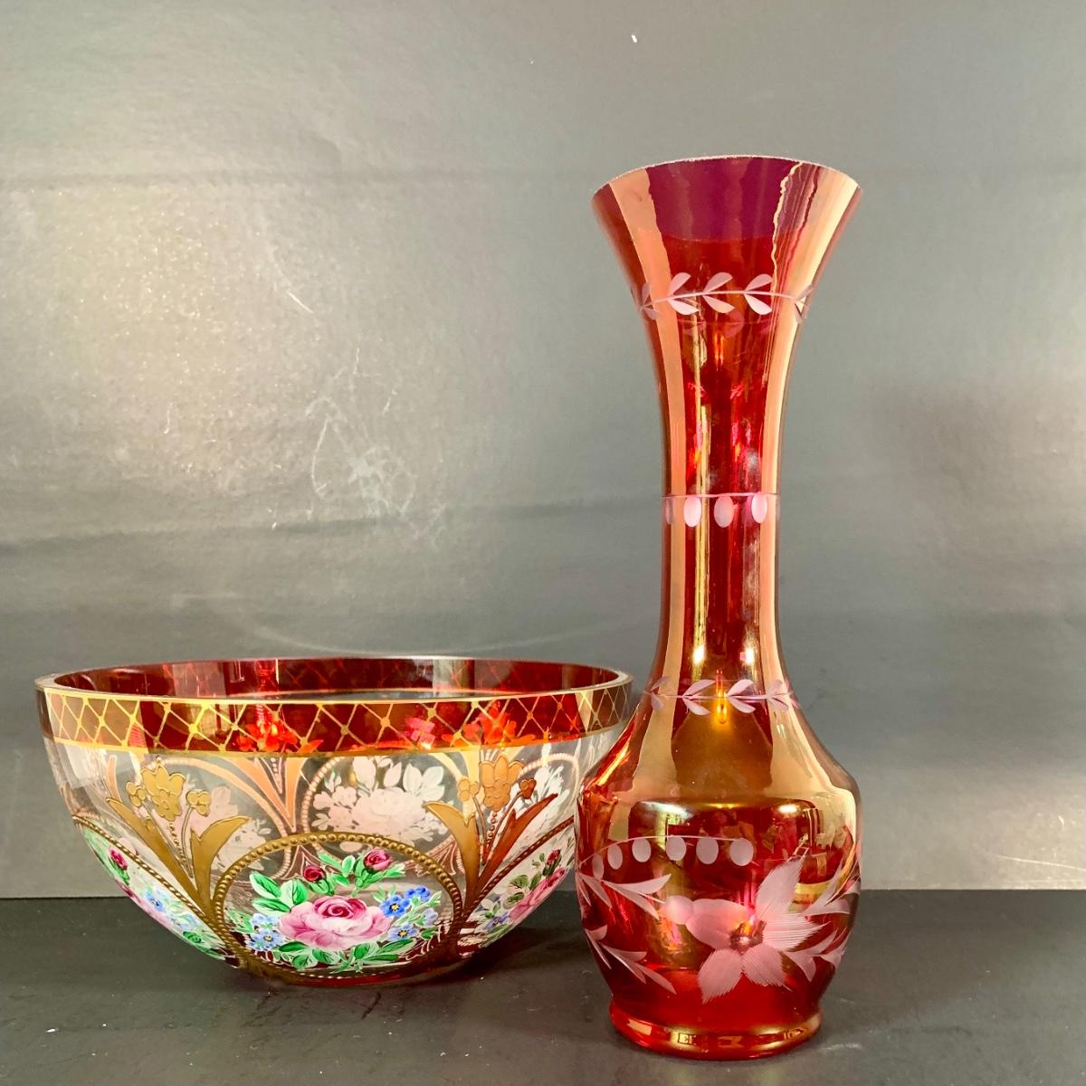 LOT:128: Floral and Gold Painted Bowl with Cranberry Glass Rim and an Etched Cranberry Glass Vase