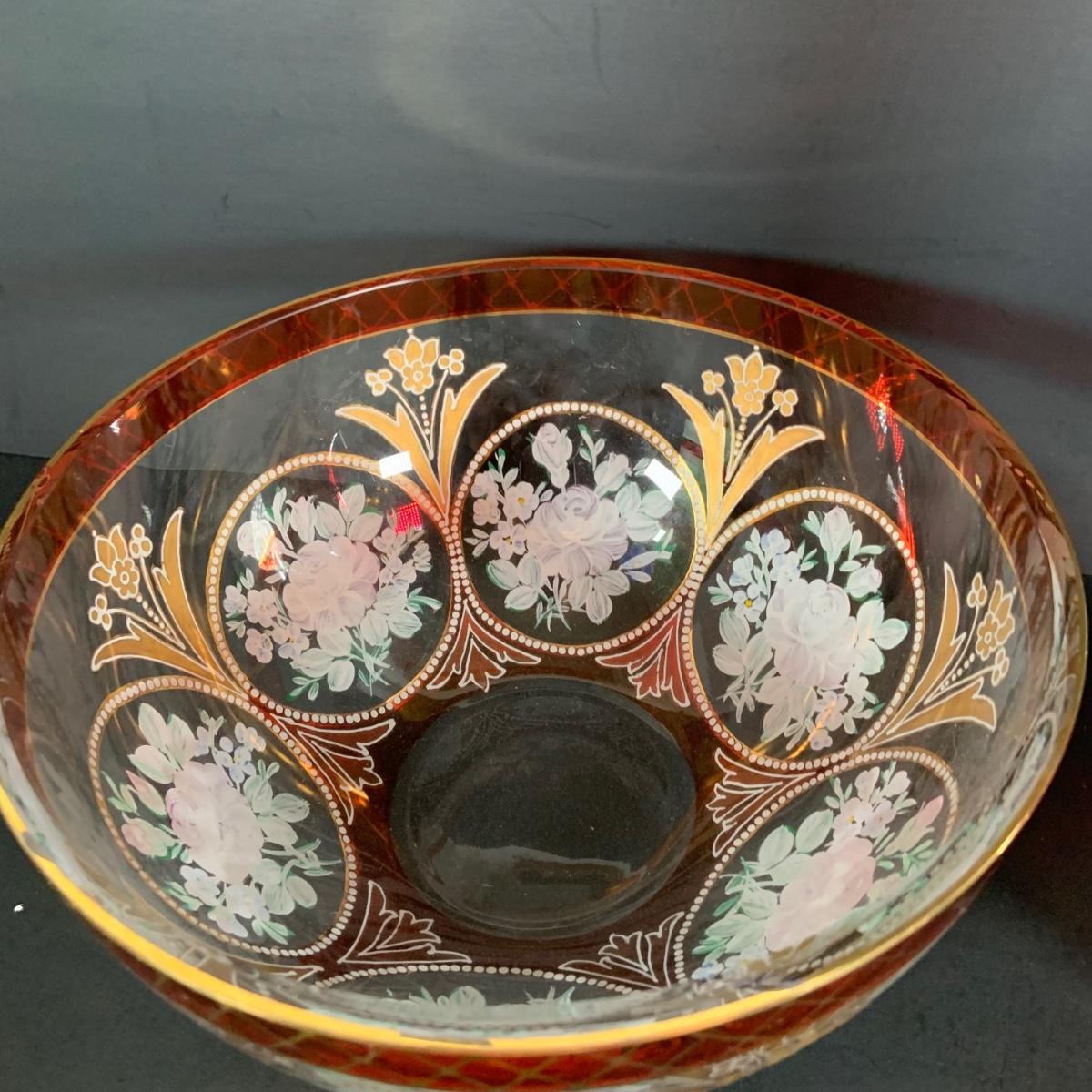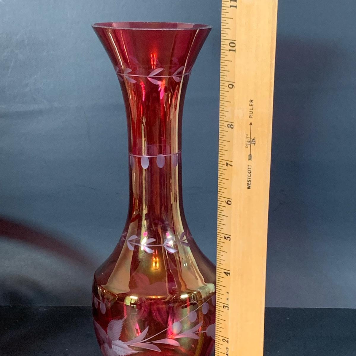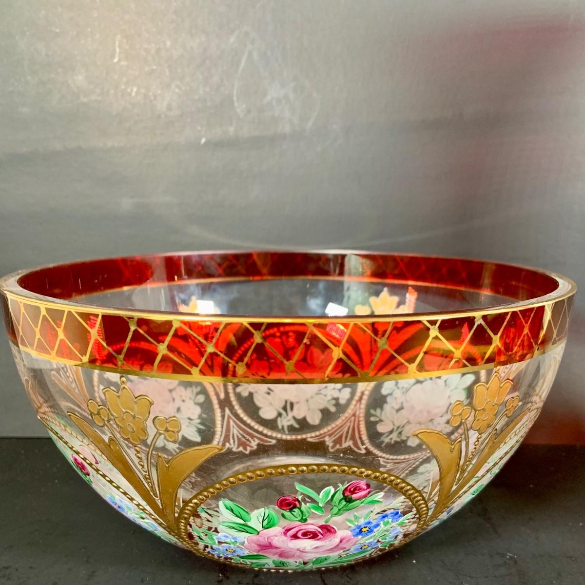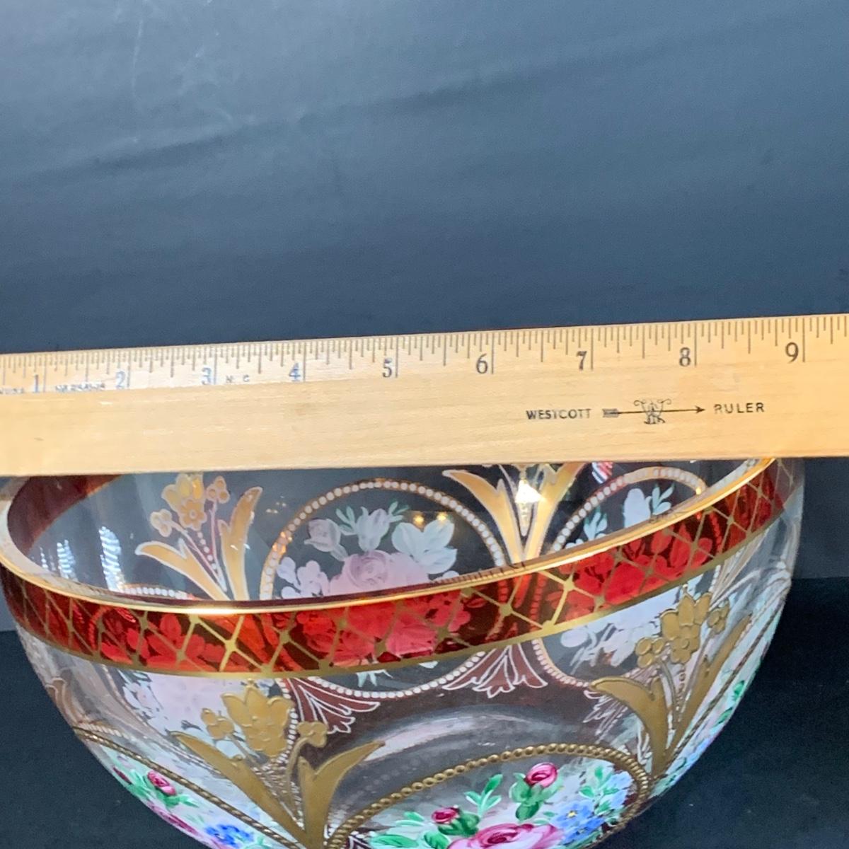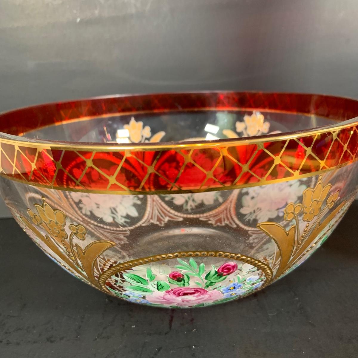 LOT:128: Floral and Gold Painted Bowl with Cranberry Glass Rim and an Etched Cranberry Glass Vase