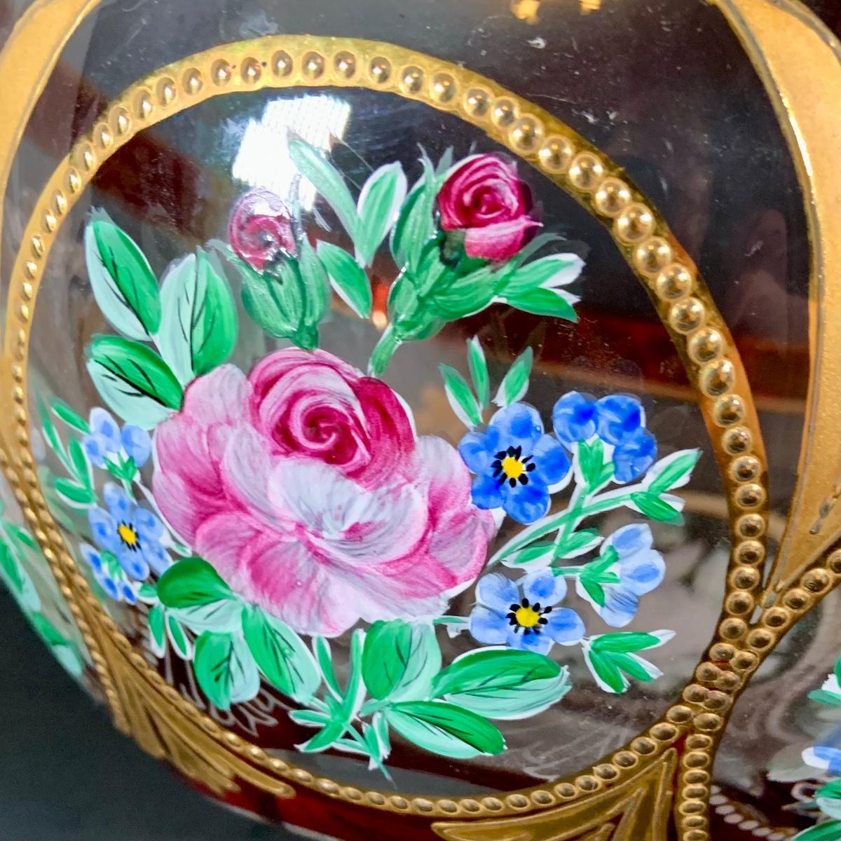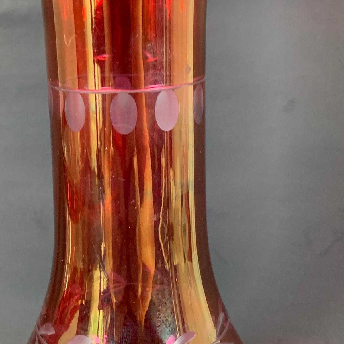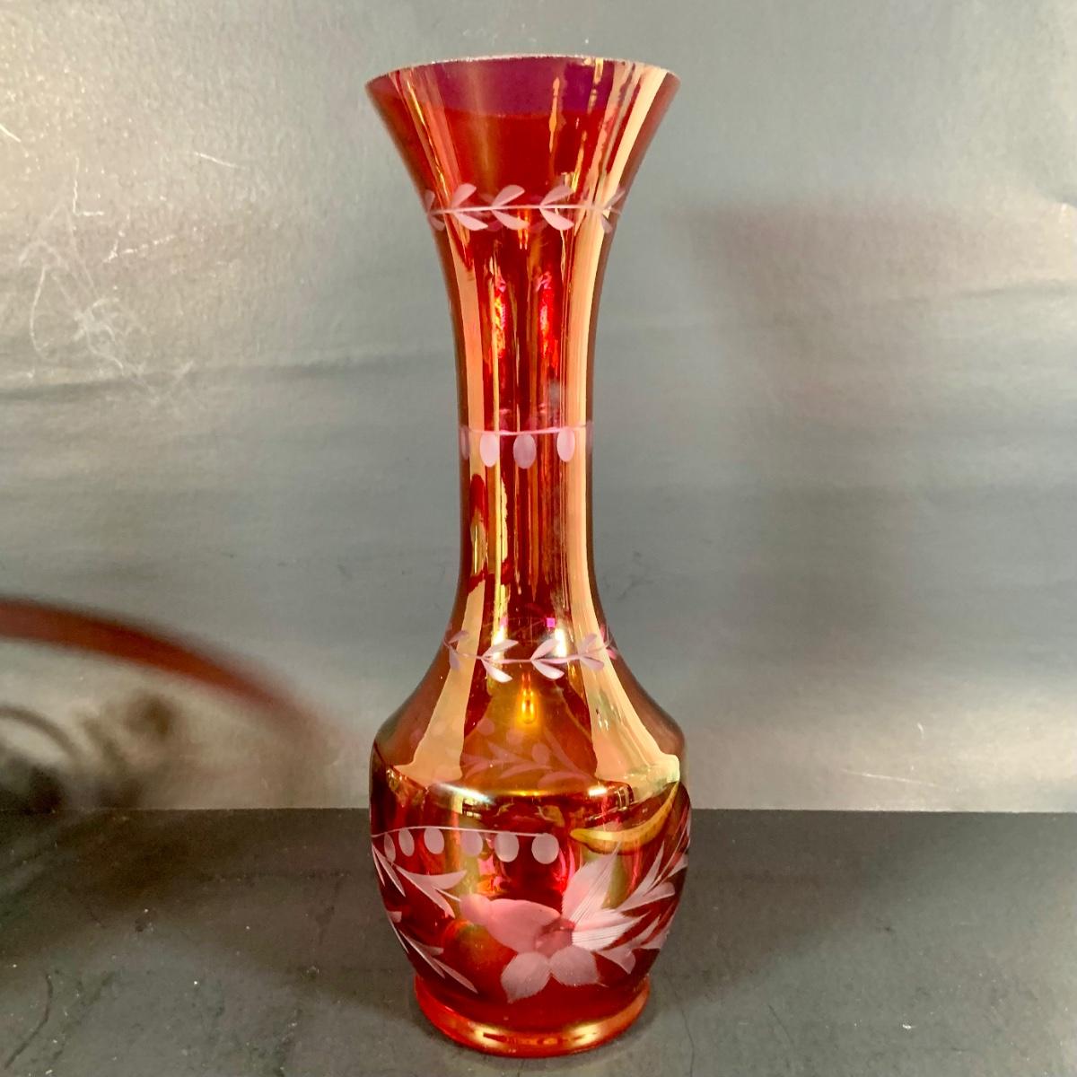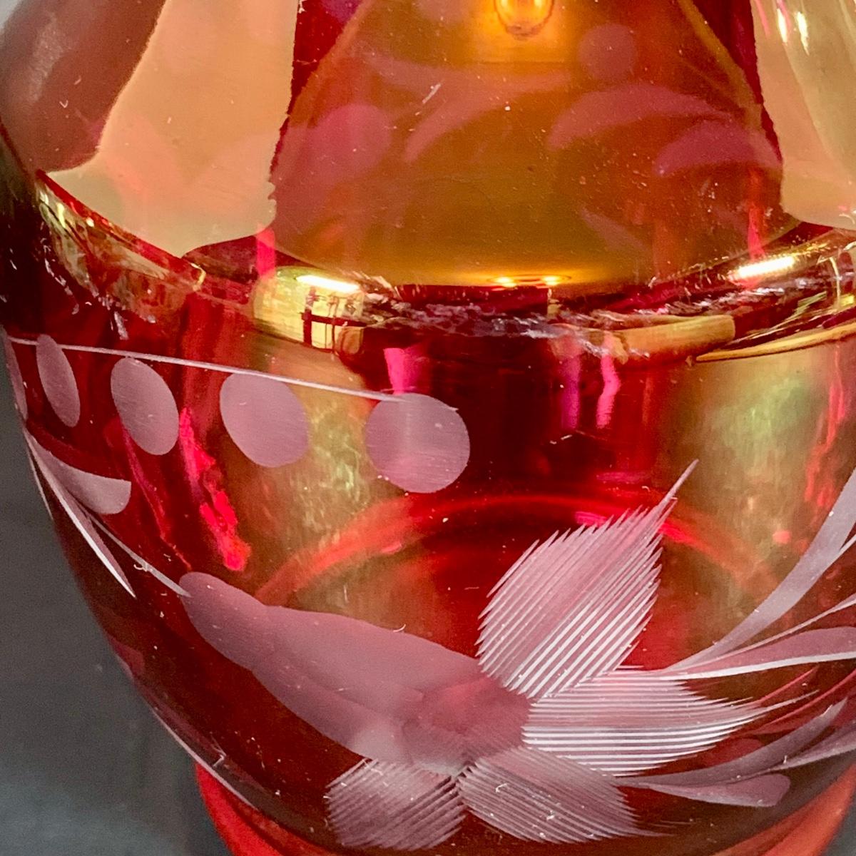 LOT:128: Floral and Gold Painted Bowl with Cranberry Glass Rim and an Etched Cranberry Glass Vase