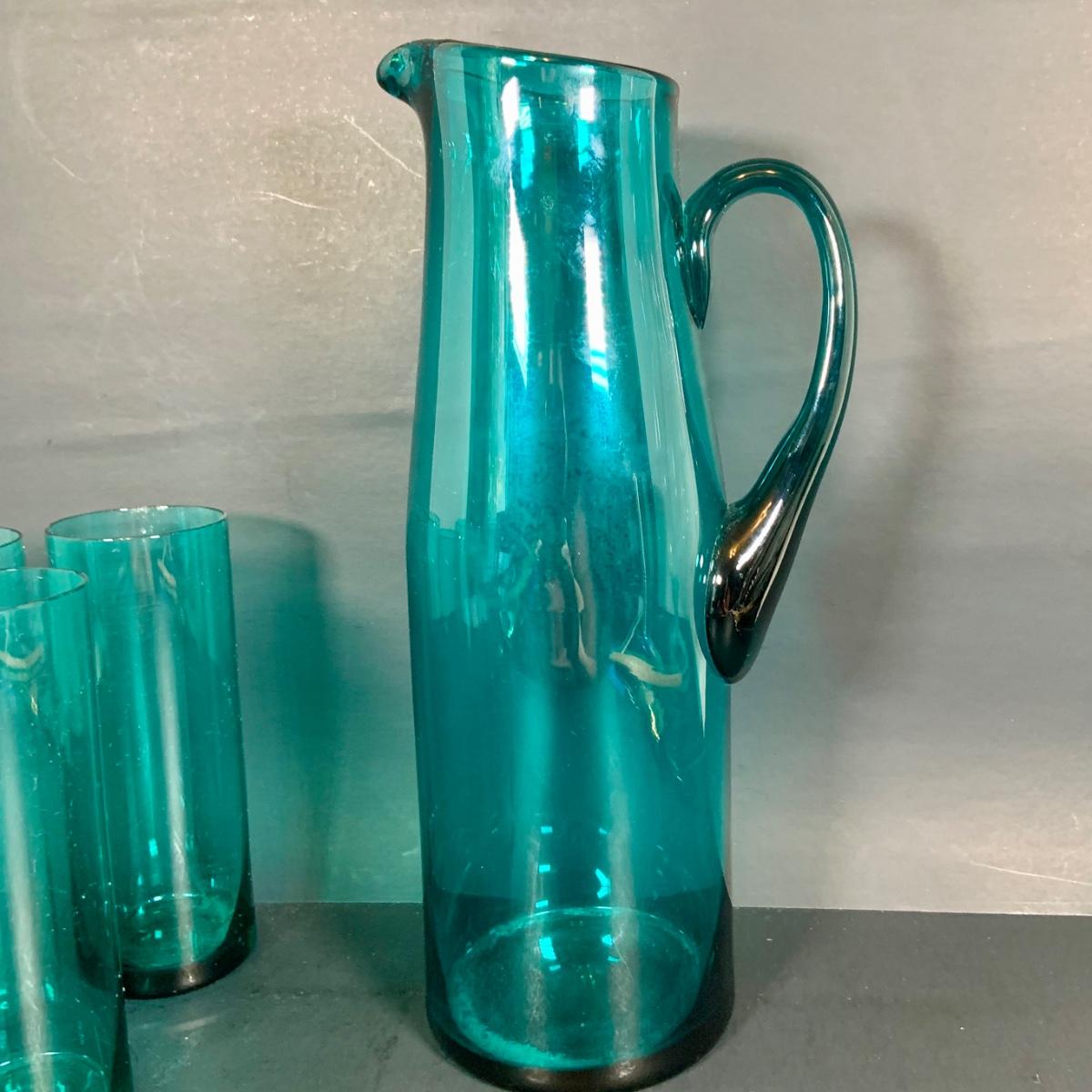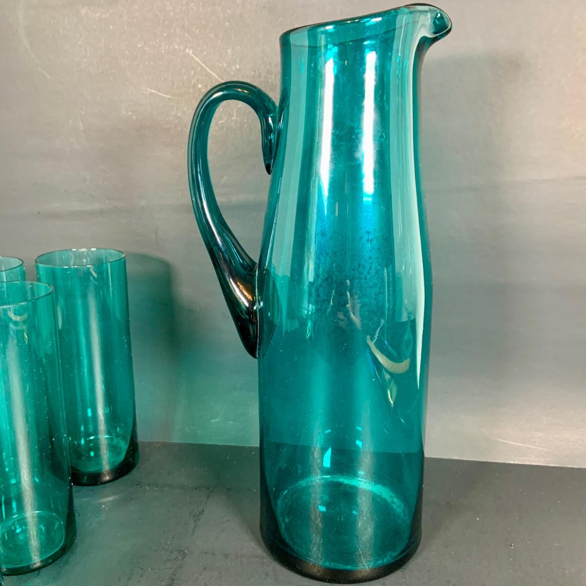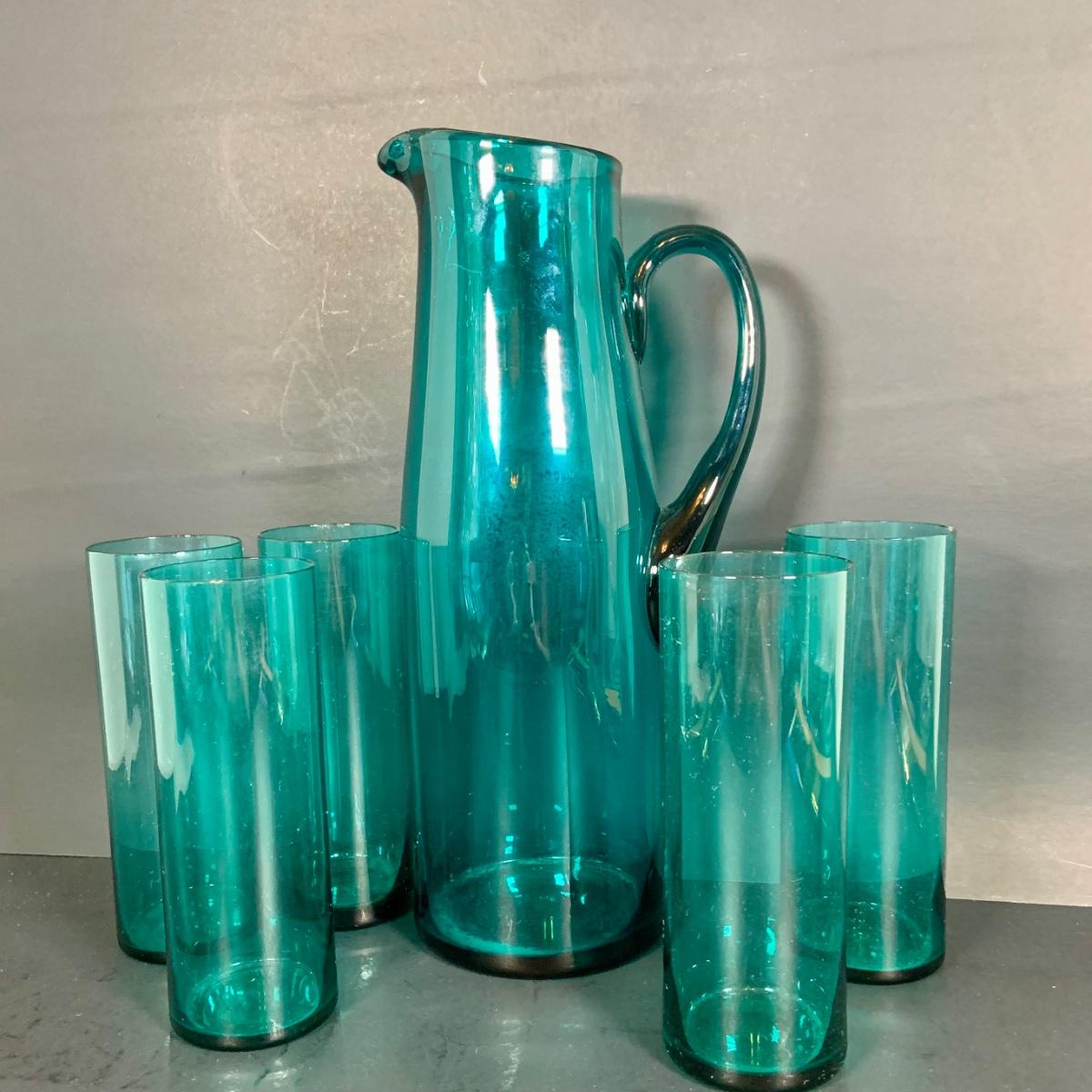LOT:130: Tall Green Art Glass Pitcher and Glasses