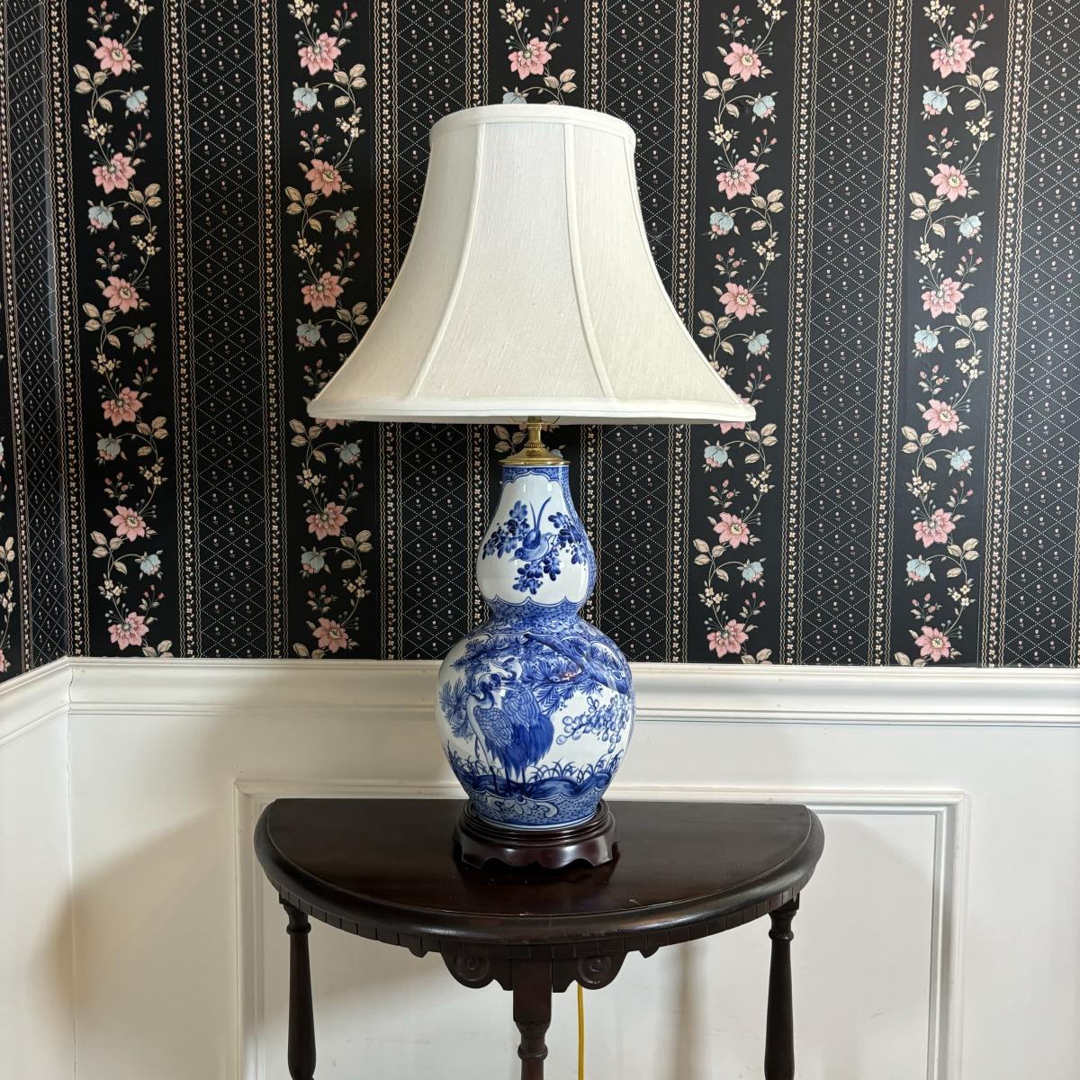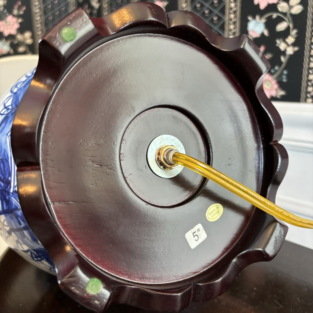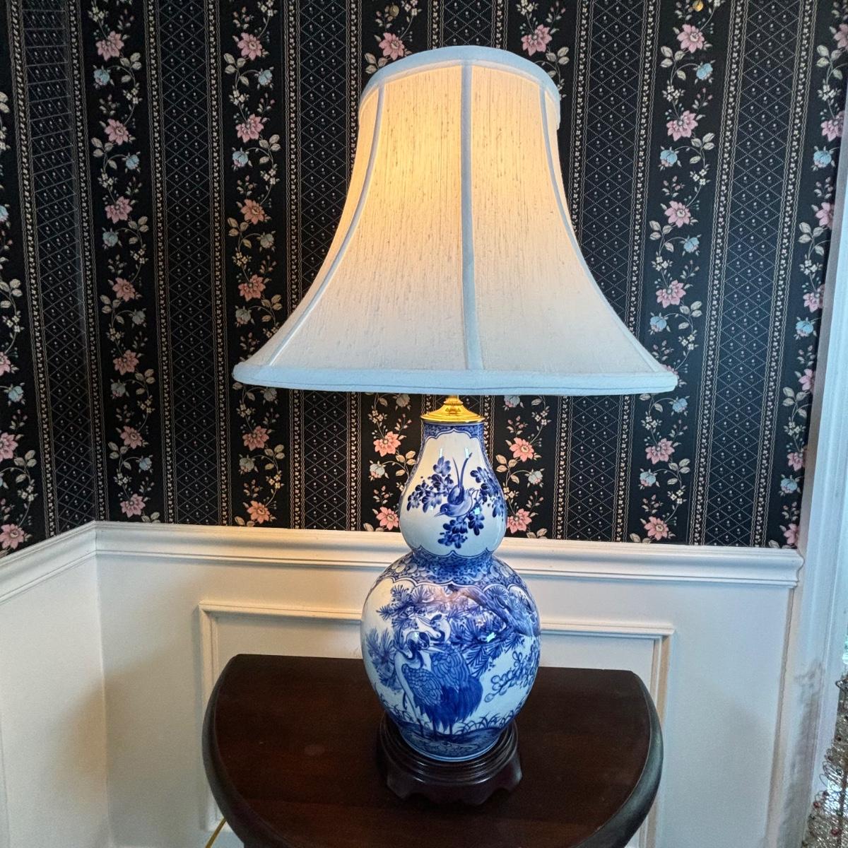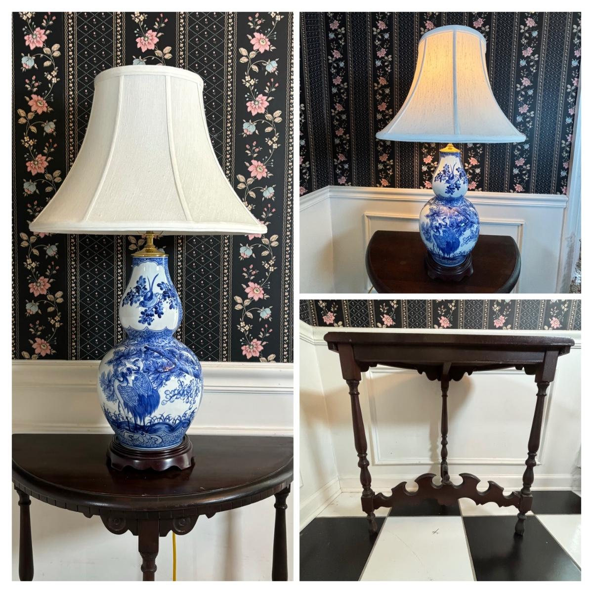 LOT 133: Wooden Side Table along with a Blue & White Floral/Bird Ceramic Lamp