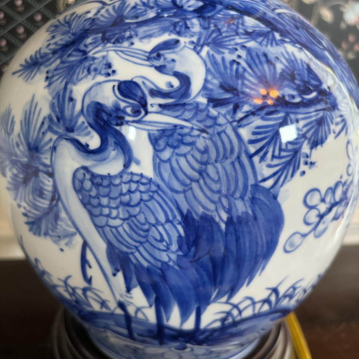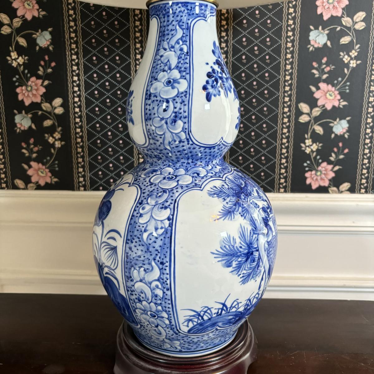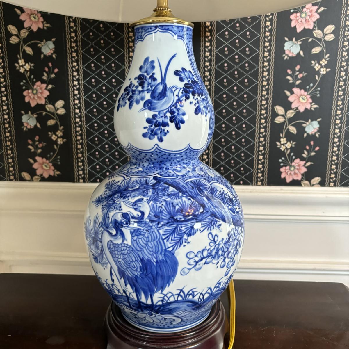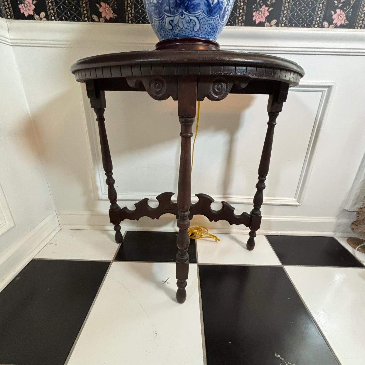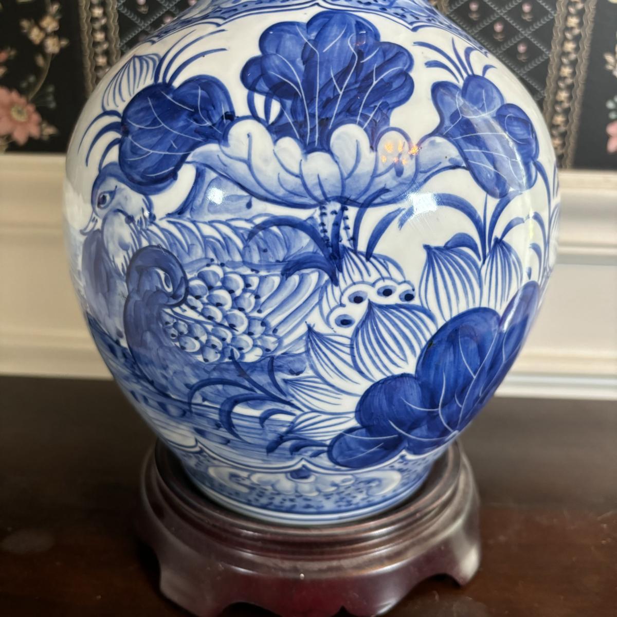 LOT 133: Wooden Side Table along with a Blue & White Floral/Bird Ceramic Lamp