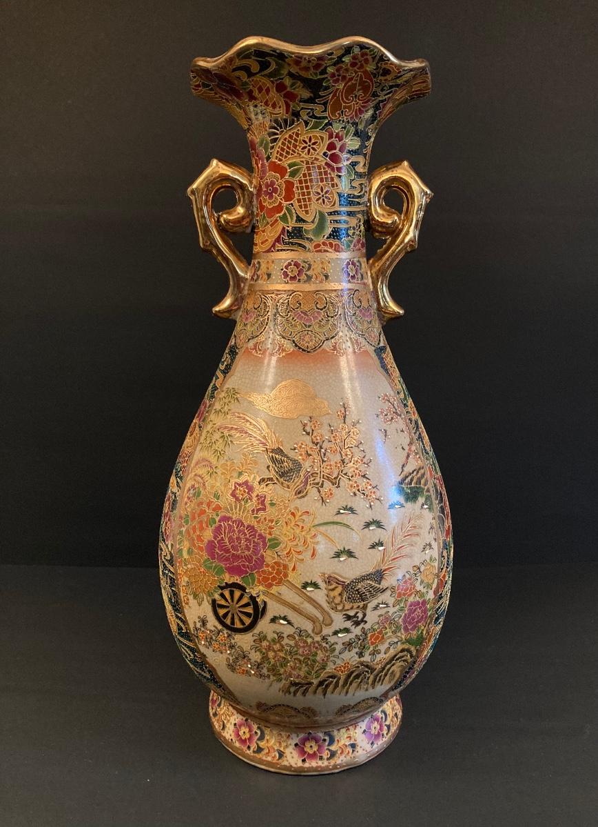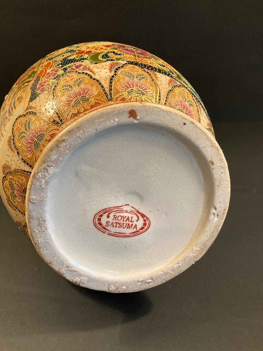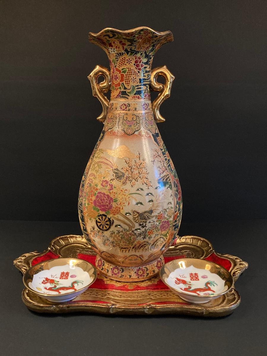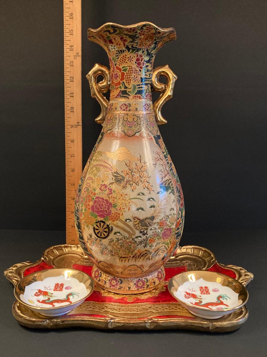 LOT 141: Gorgeous Royal Satsuma Vase, Painted Red / Gold Wood Tray and More