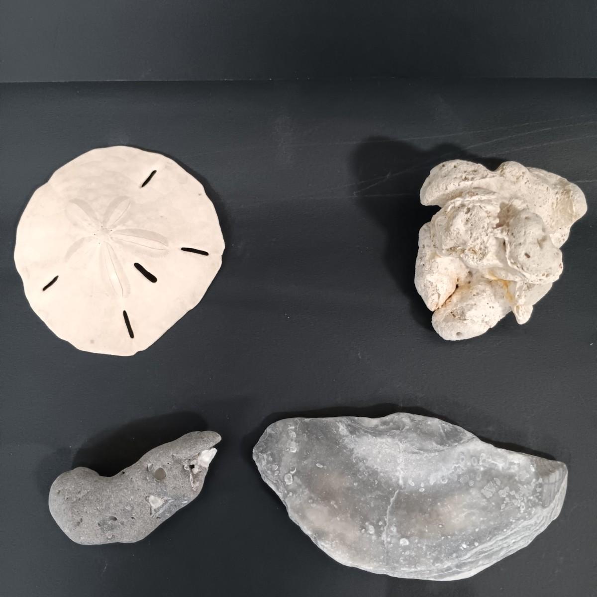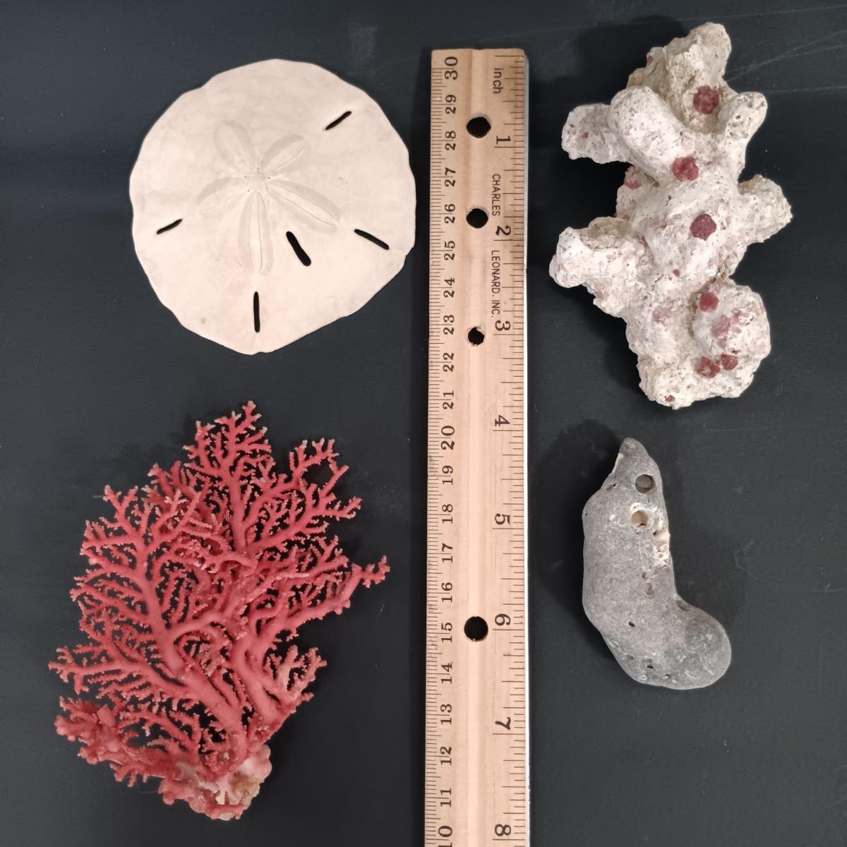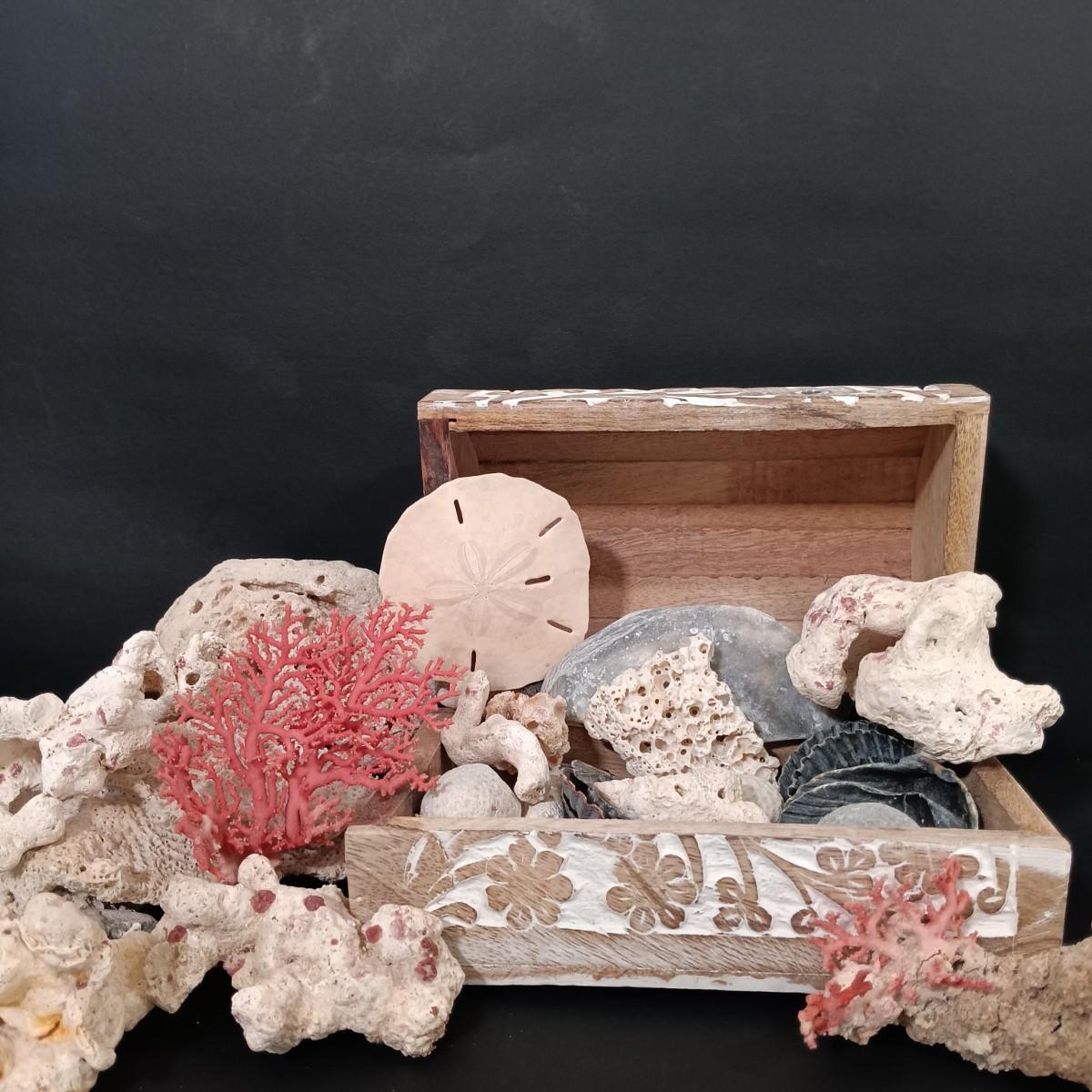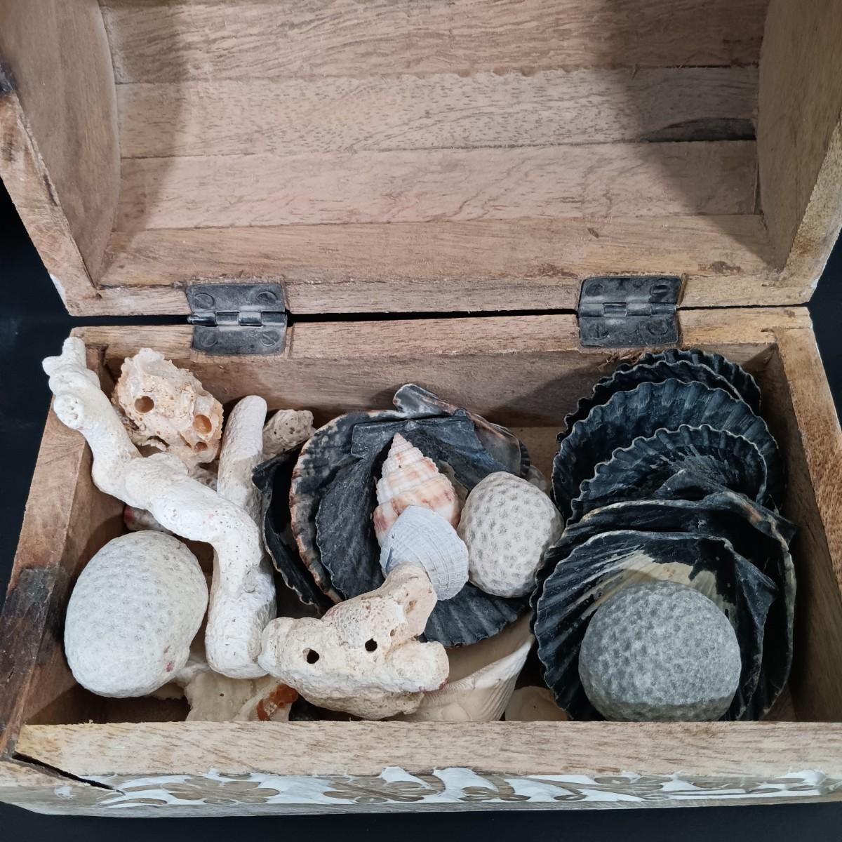 LOT 186: A Collection of Sea Shells and Coral w/ Carved Wooden Box