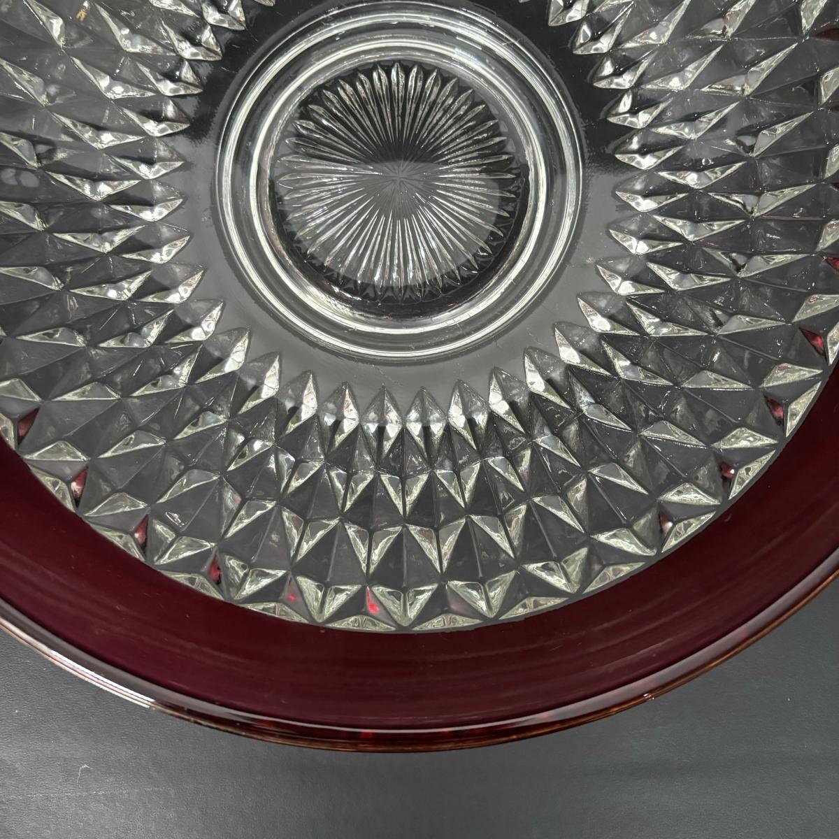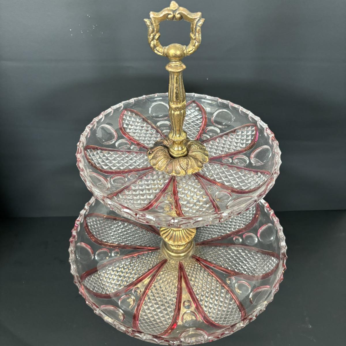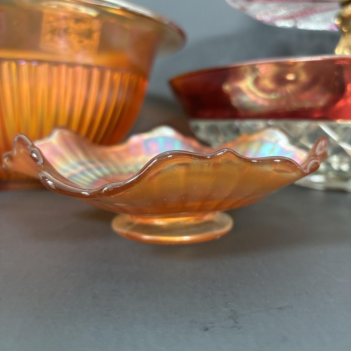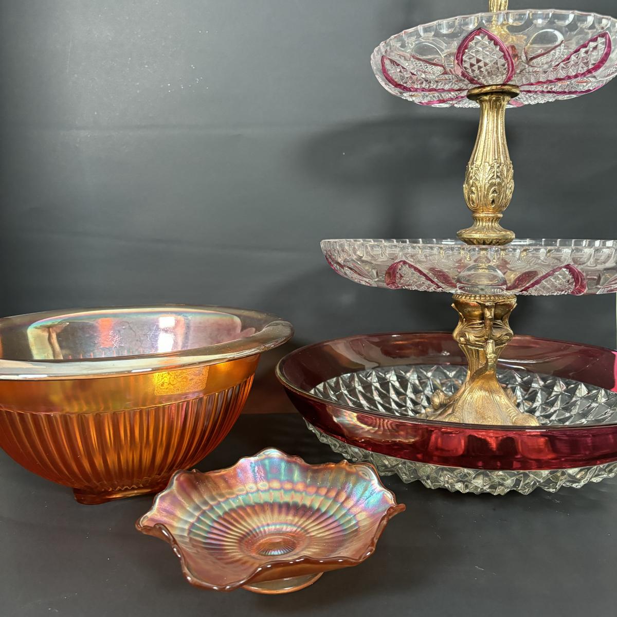 LOT 224: Vintage Ruby Red Diamond Point Bowl, Vintage Iridescent Carnival Glass, Cranberry & Clear Tiered Serving Tray