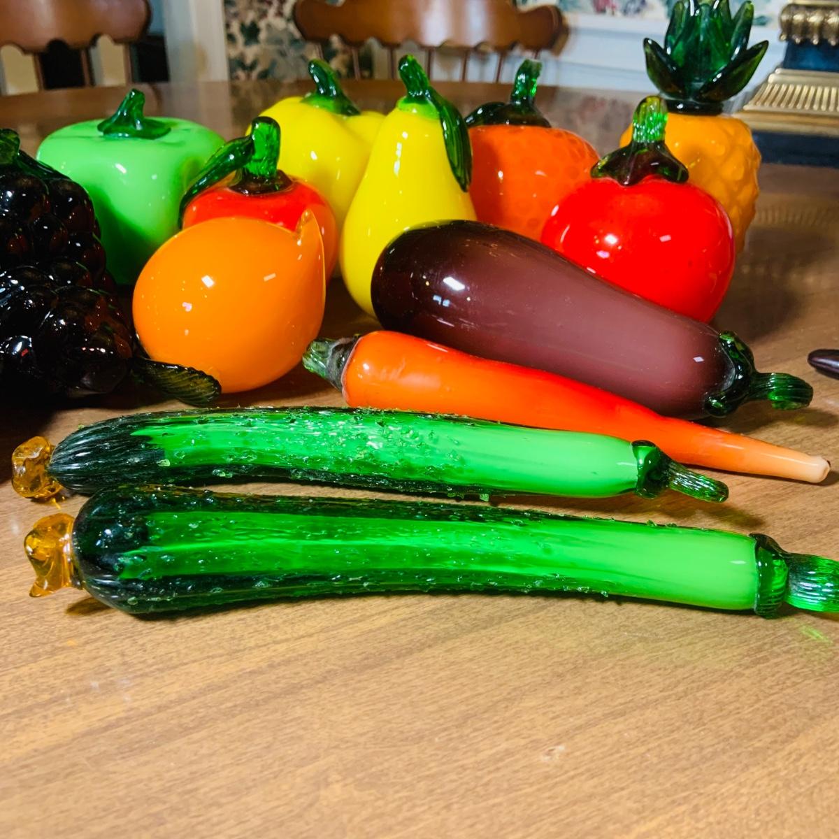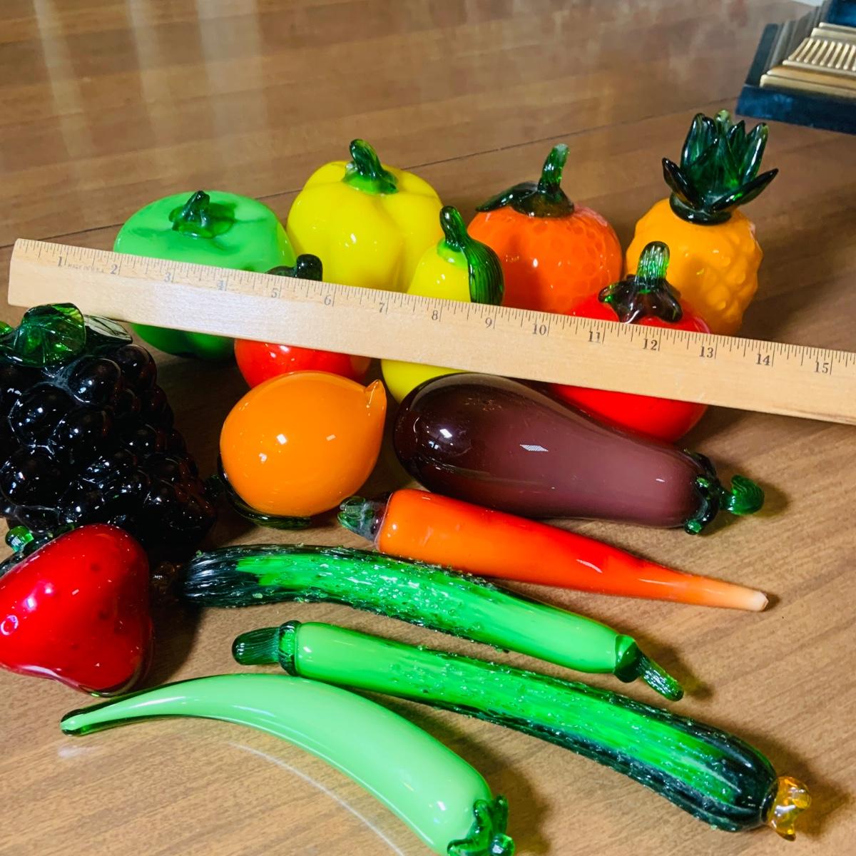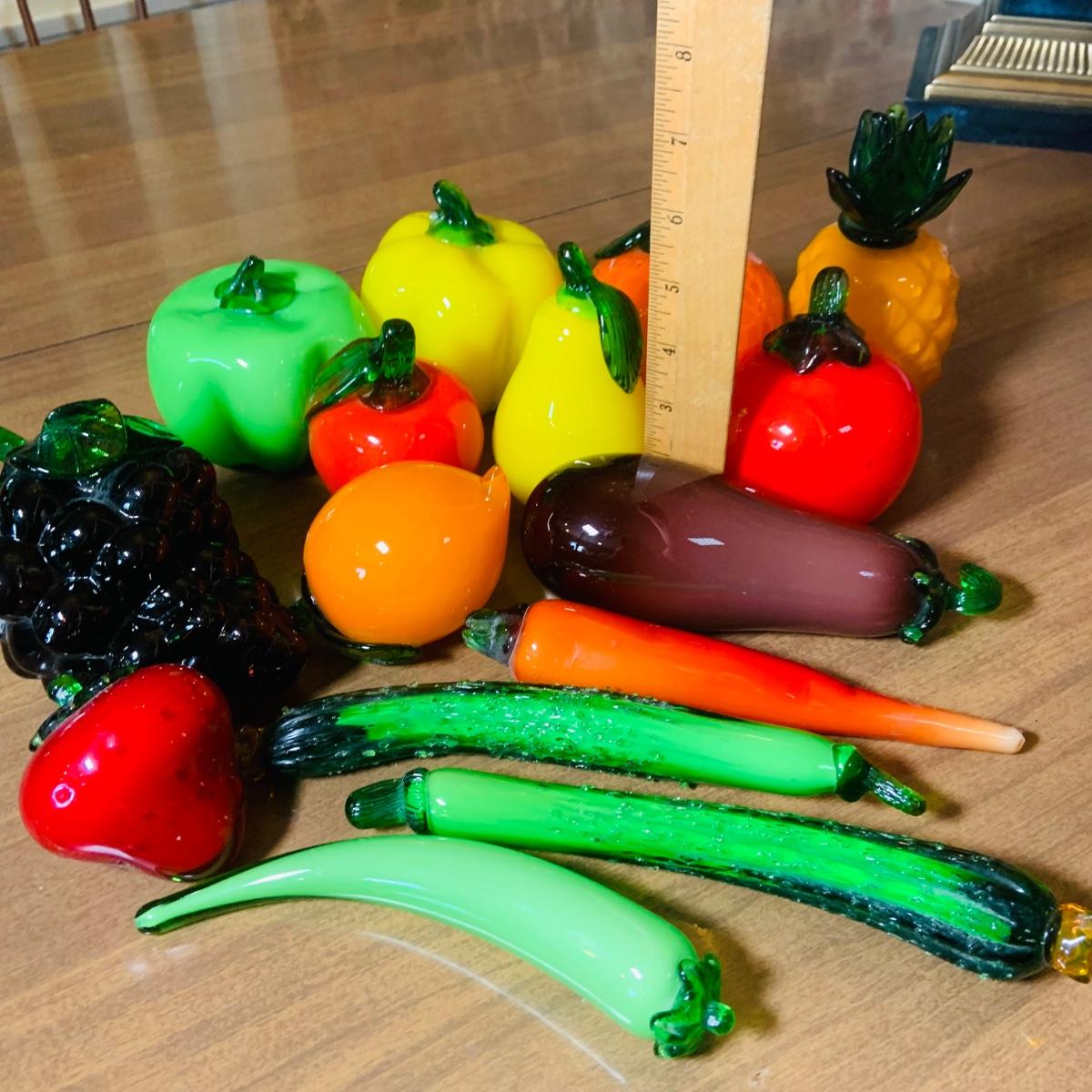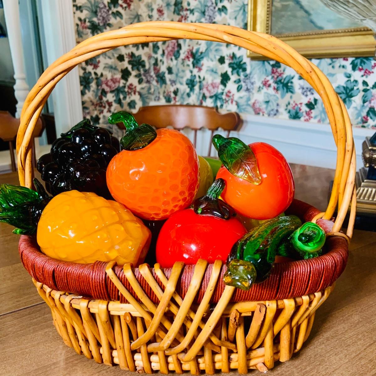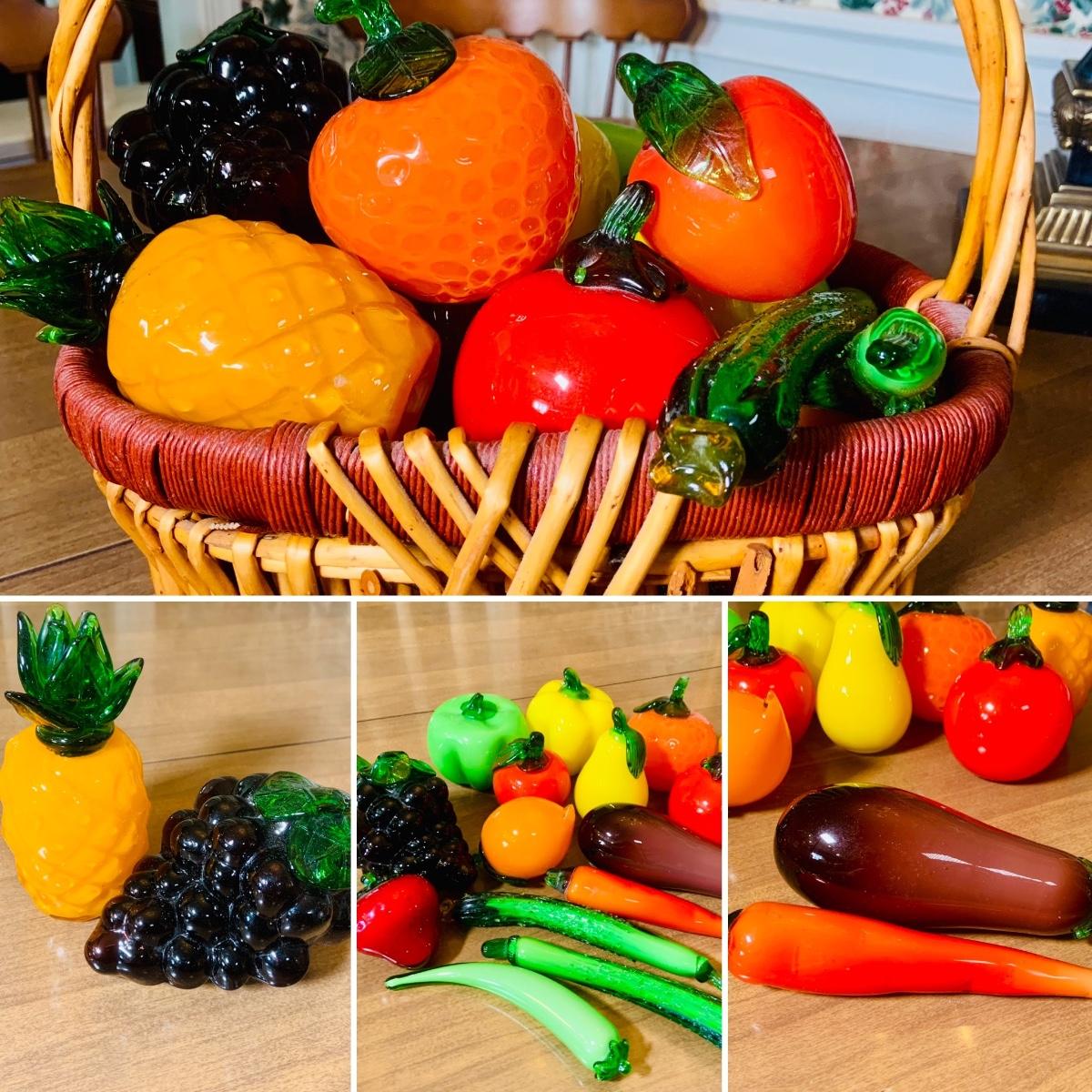 LOT:243: Large Assortment of Hand Blown Artglass Fruits and Vegetables with Basket