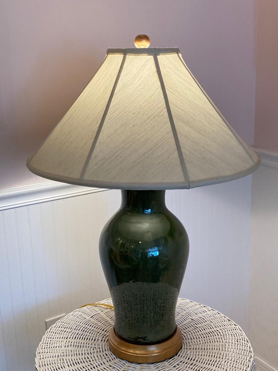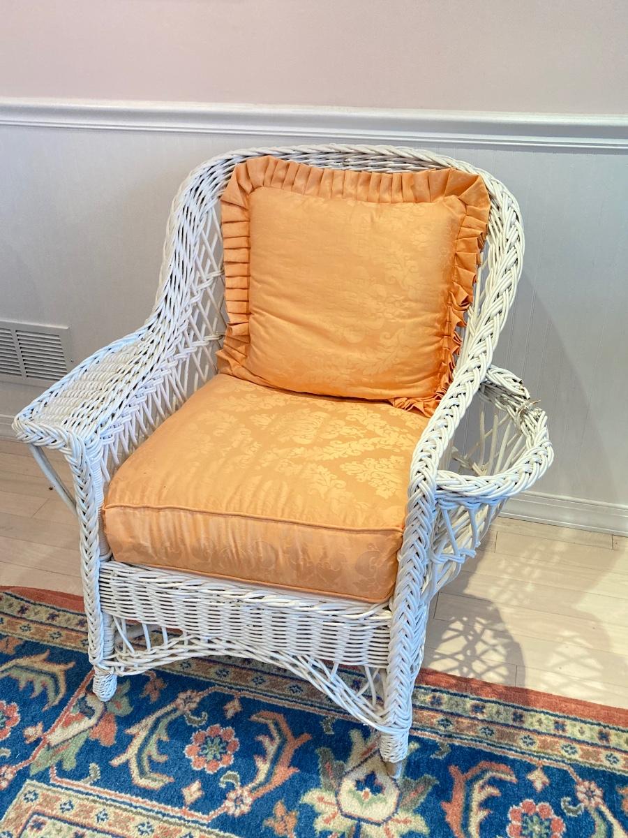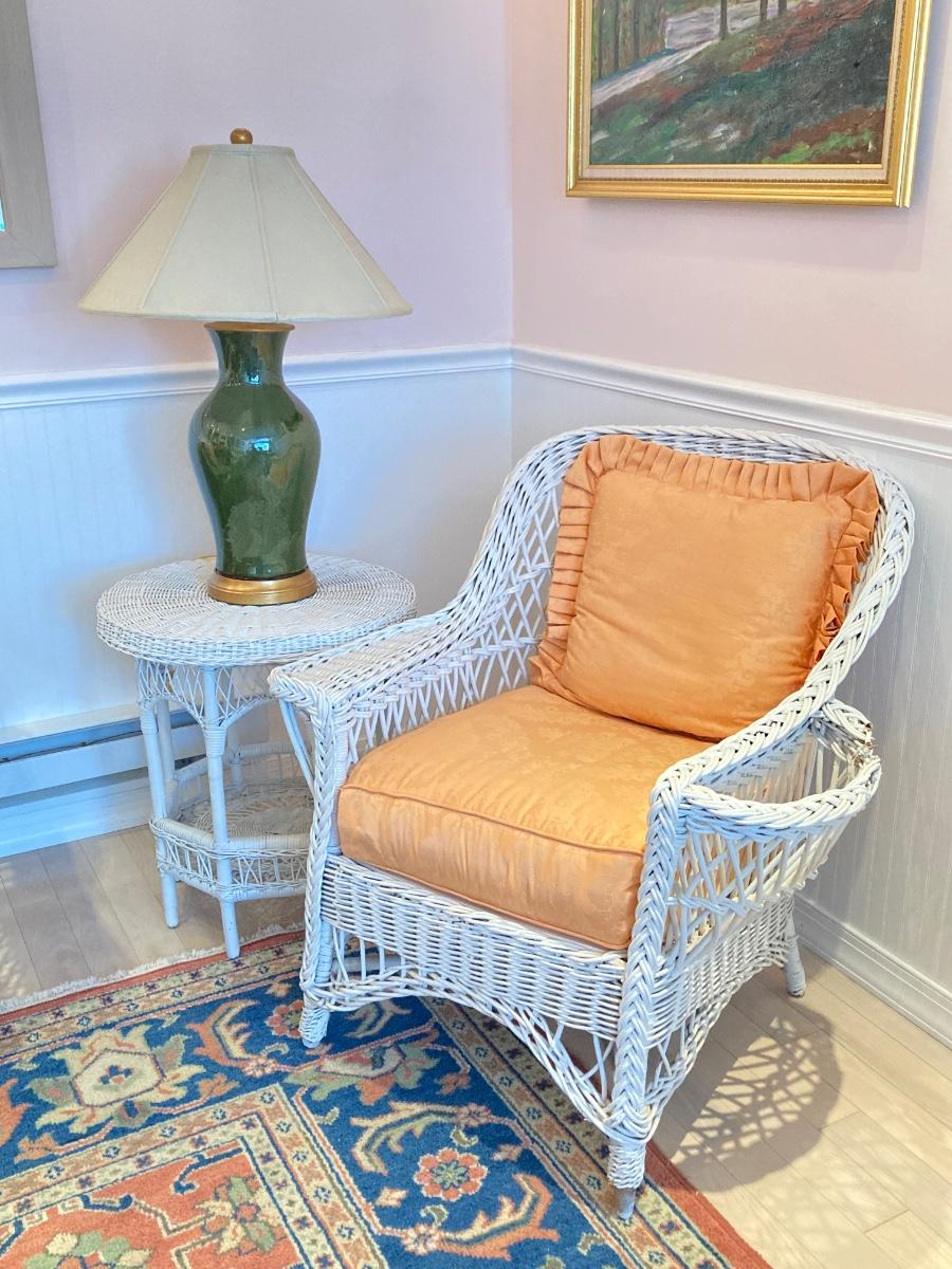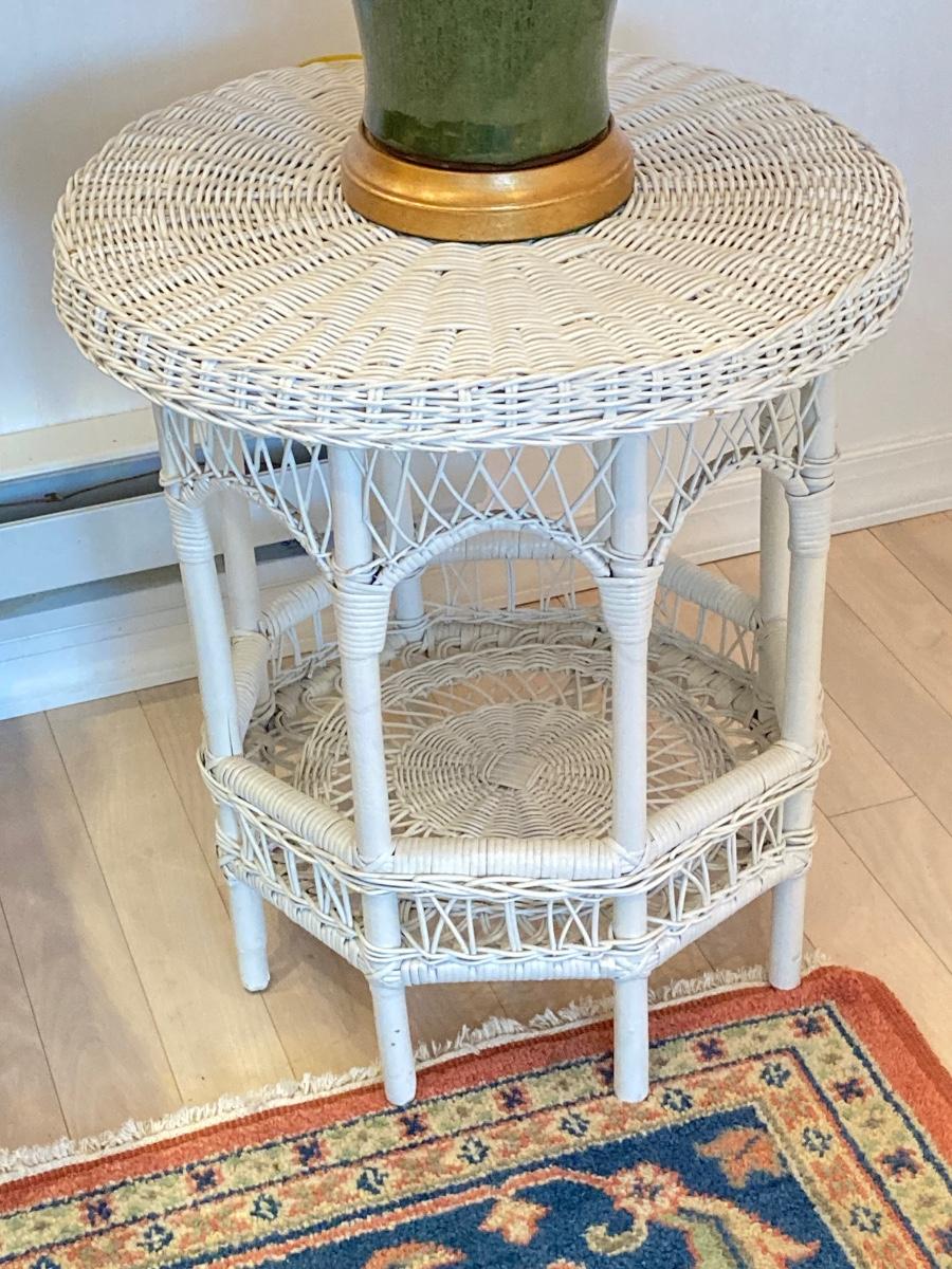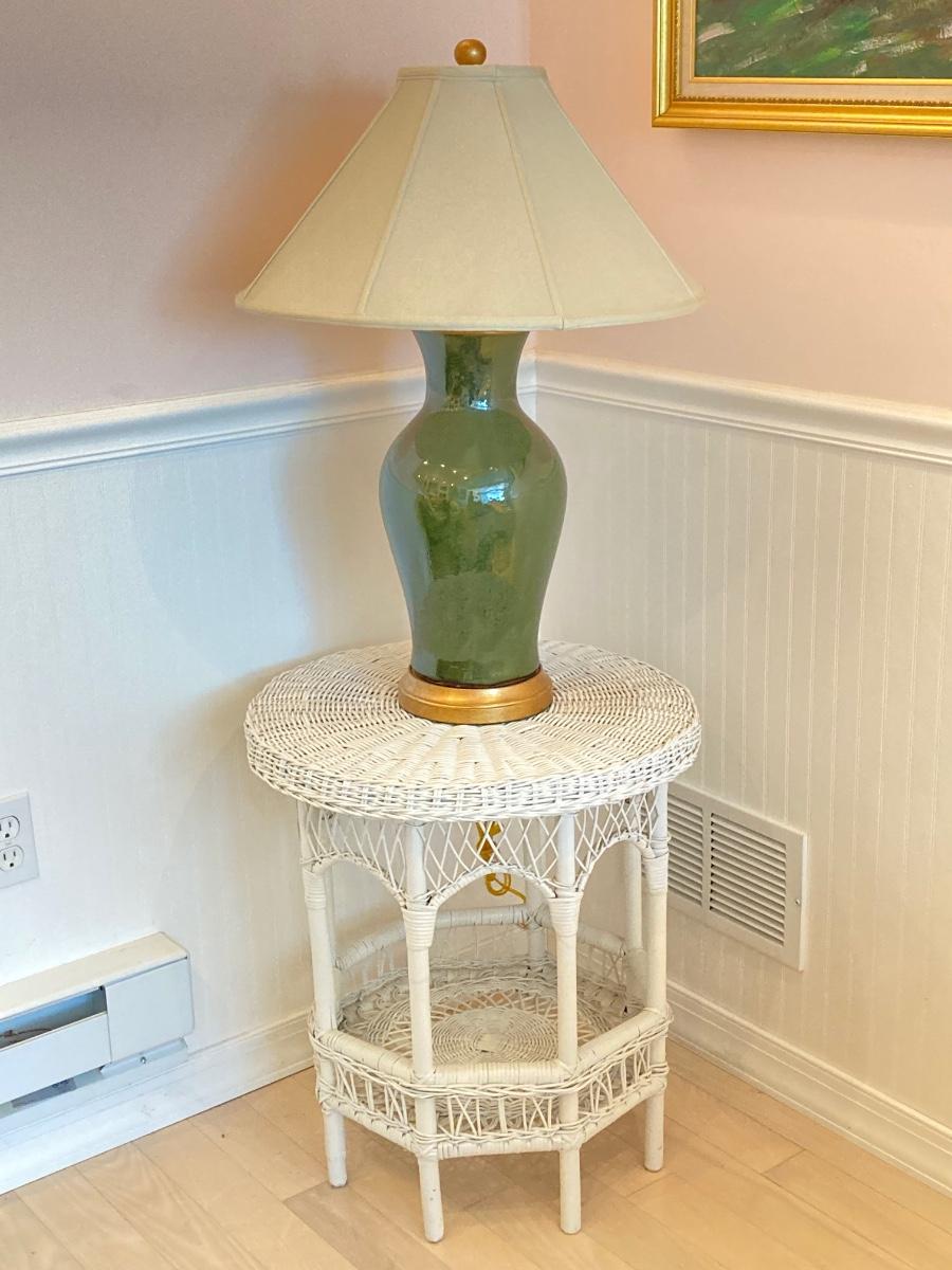 LOT 282: White Wicker Chair, Round Side Table and Green with Gold Colored Lamp