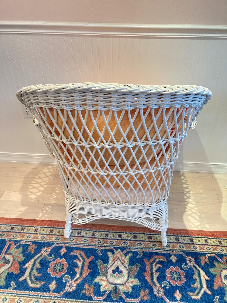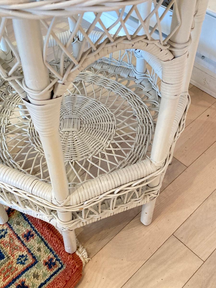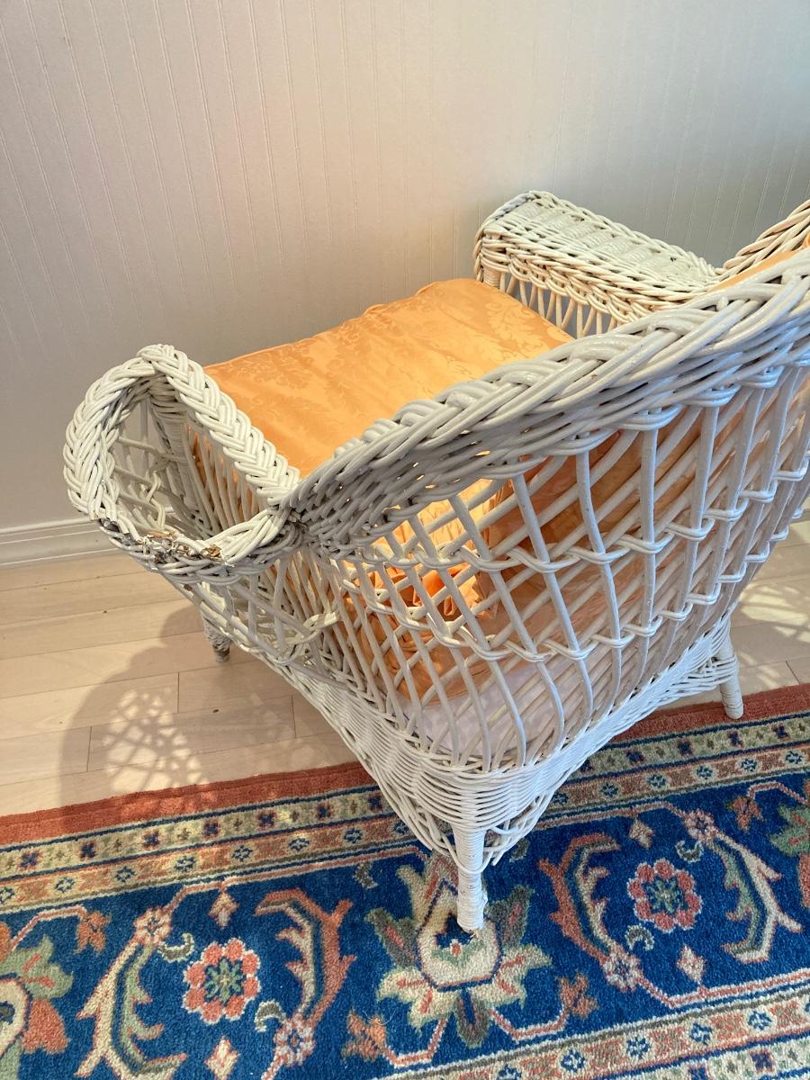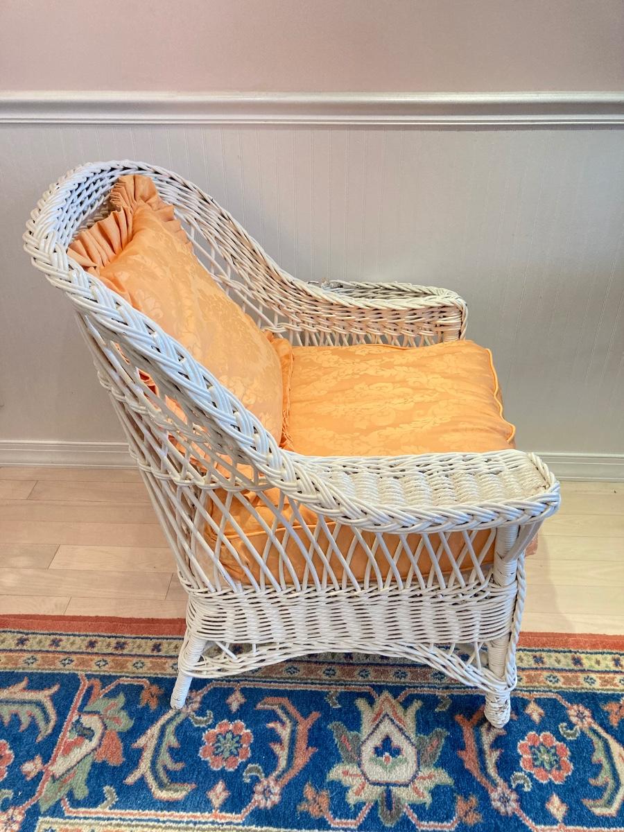 LOT 282: White Wicker Chair, Round Side Table and Green with Gold Colored Lamp