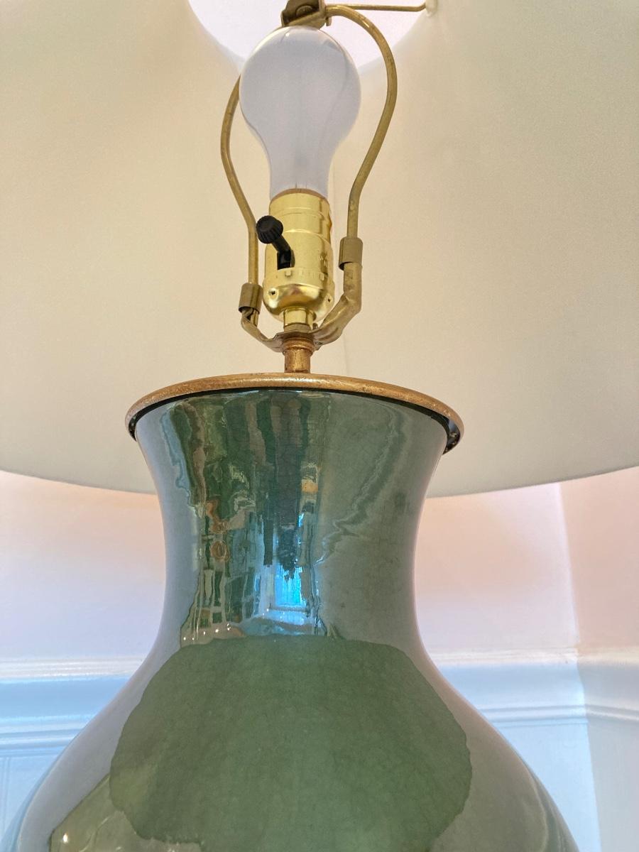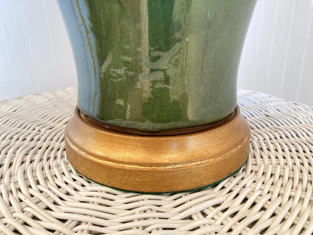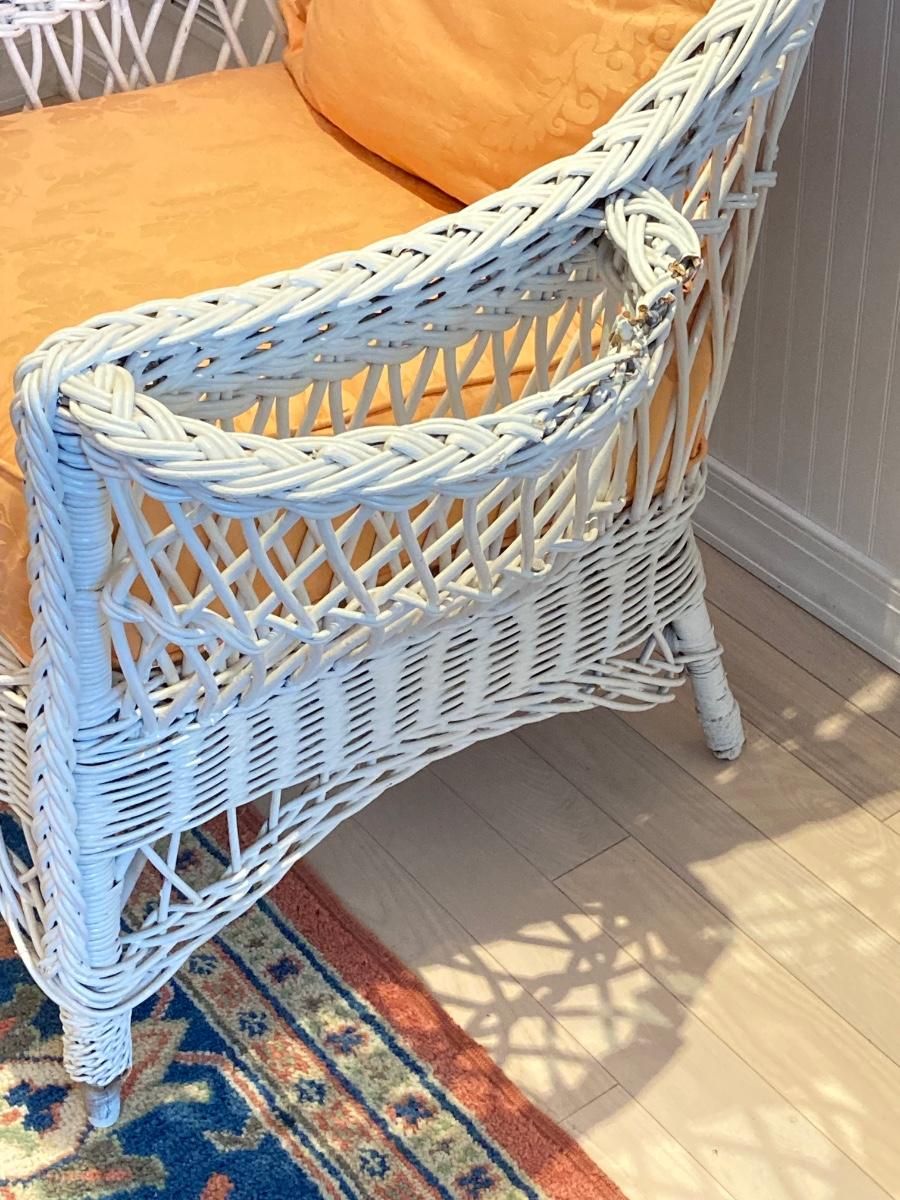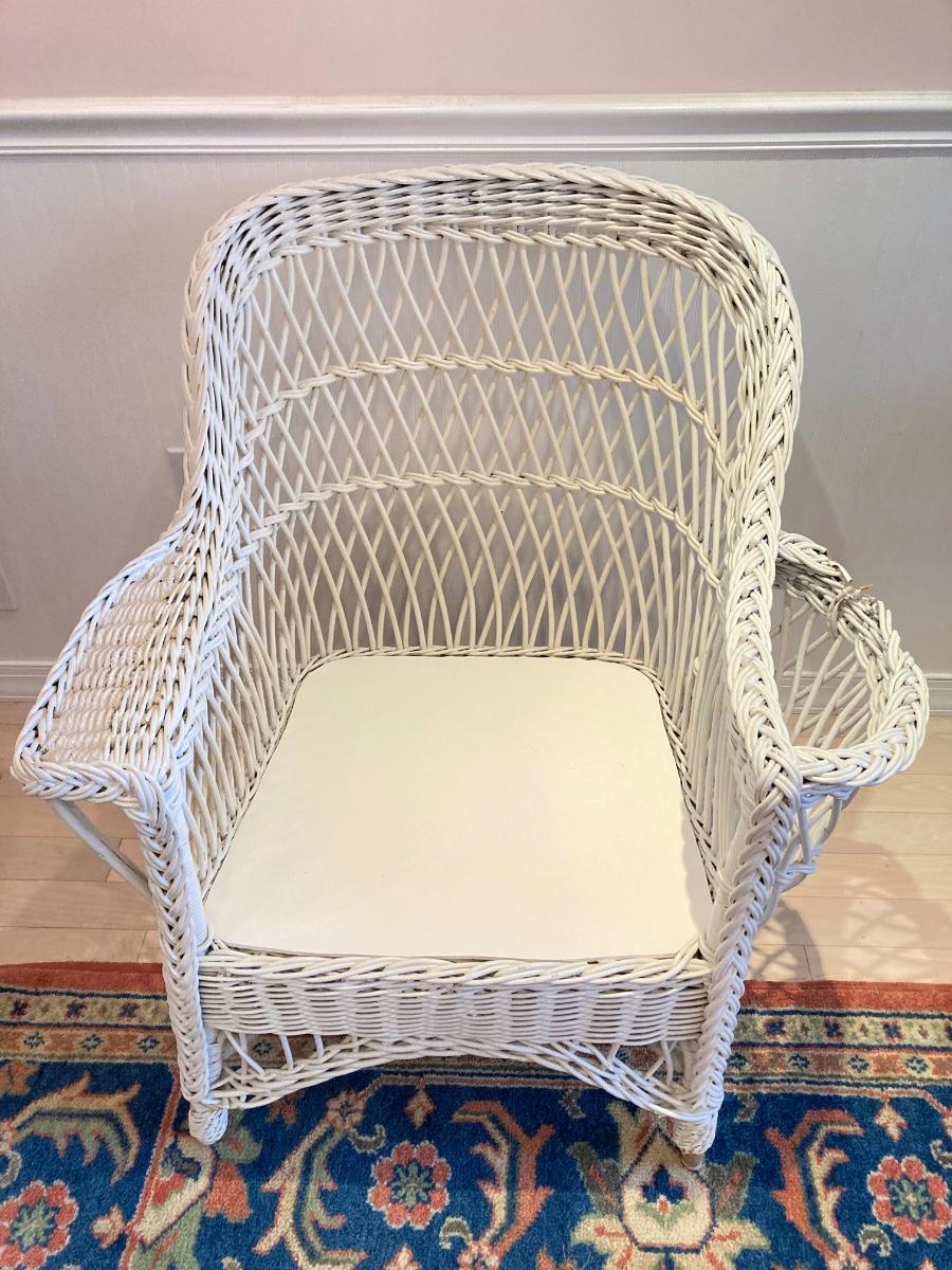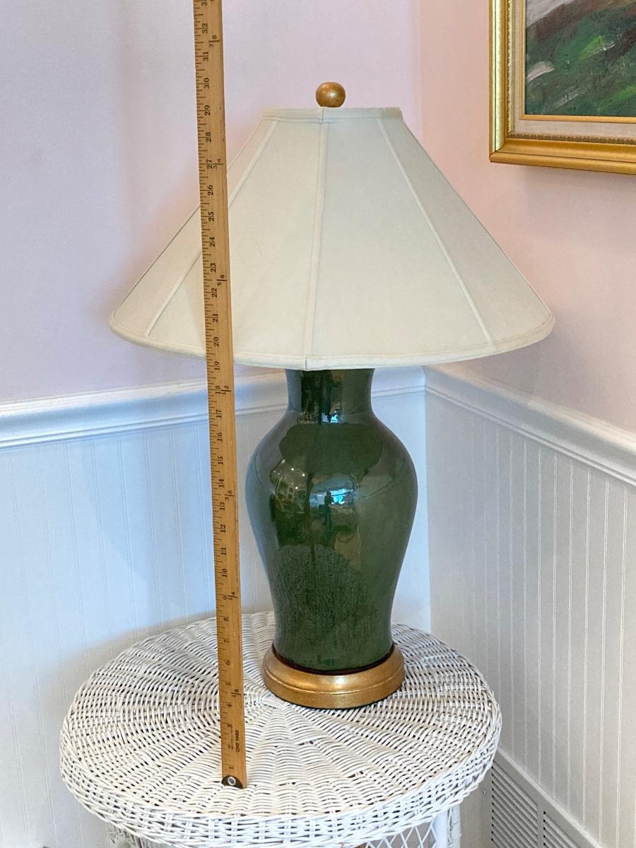 LOT 282: White Wicker Chair, Round Side Table and Green with Gold Colored Lamp