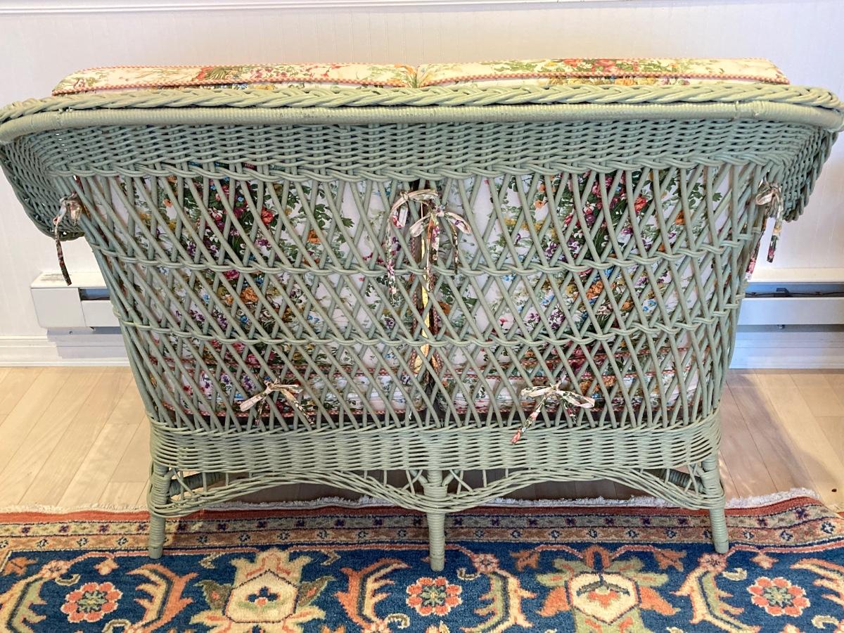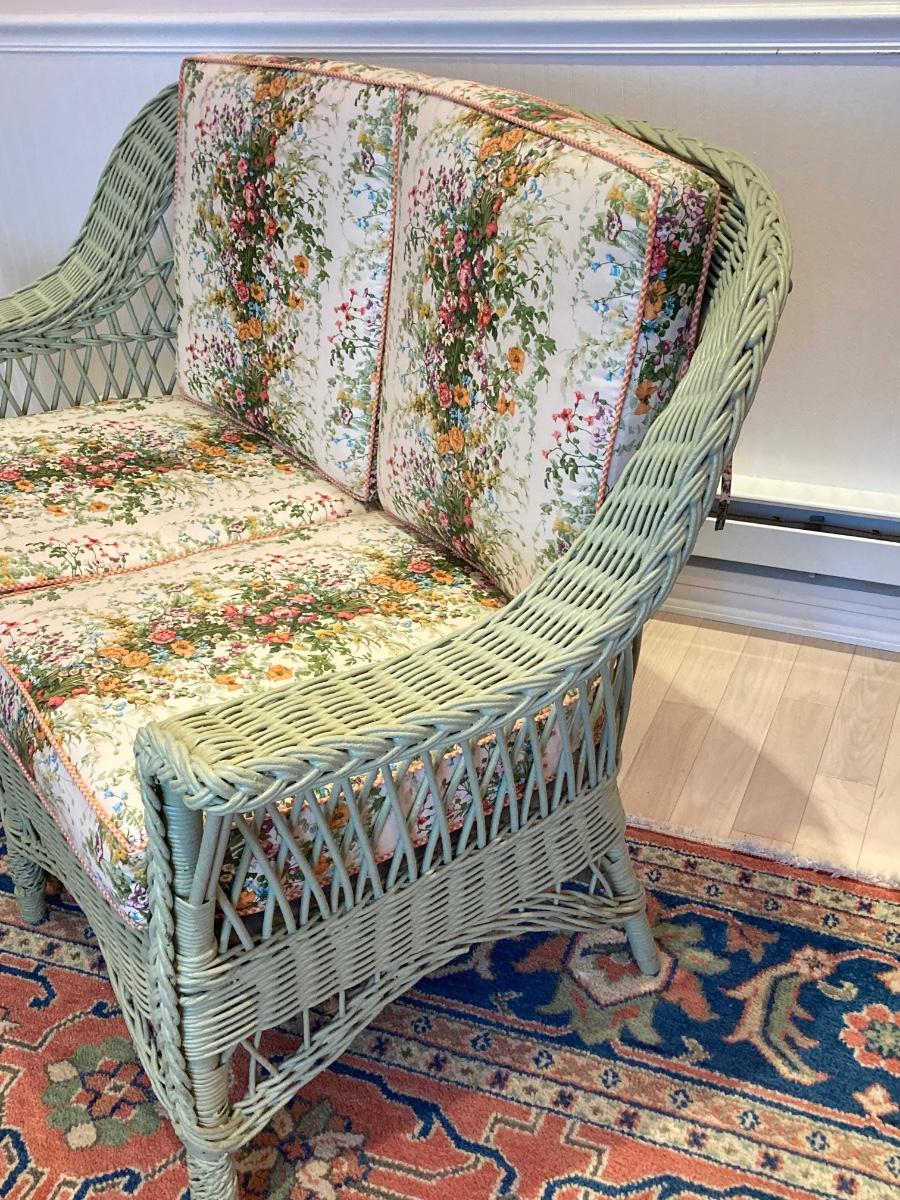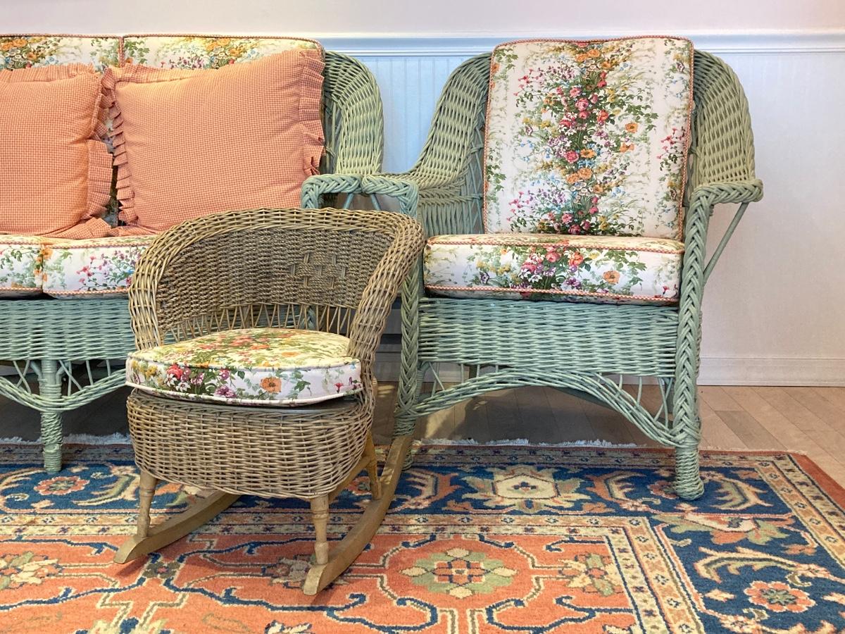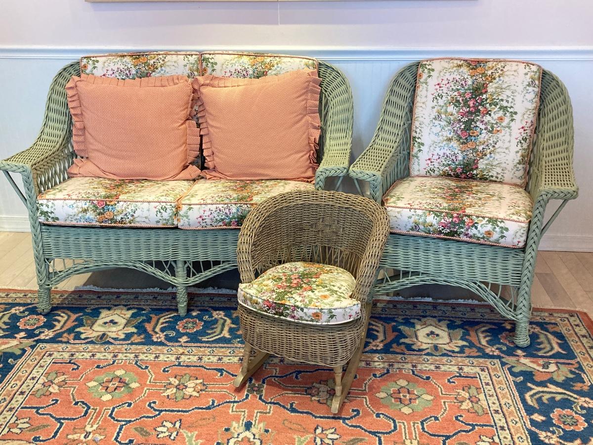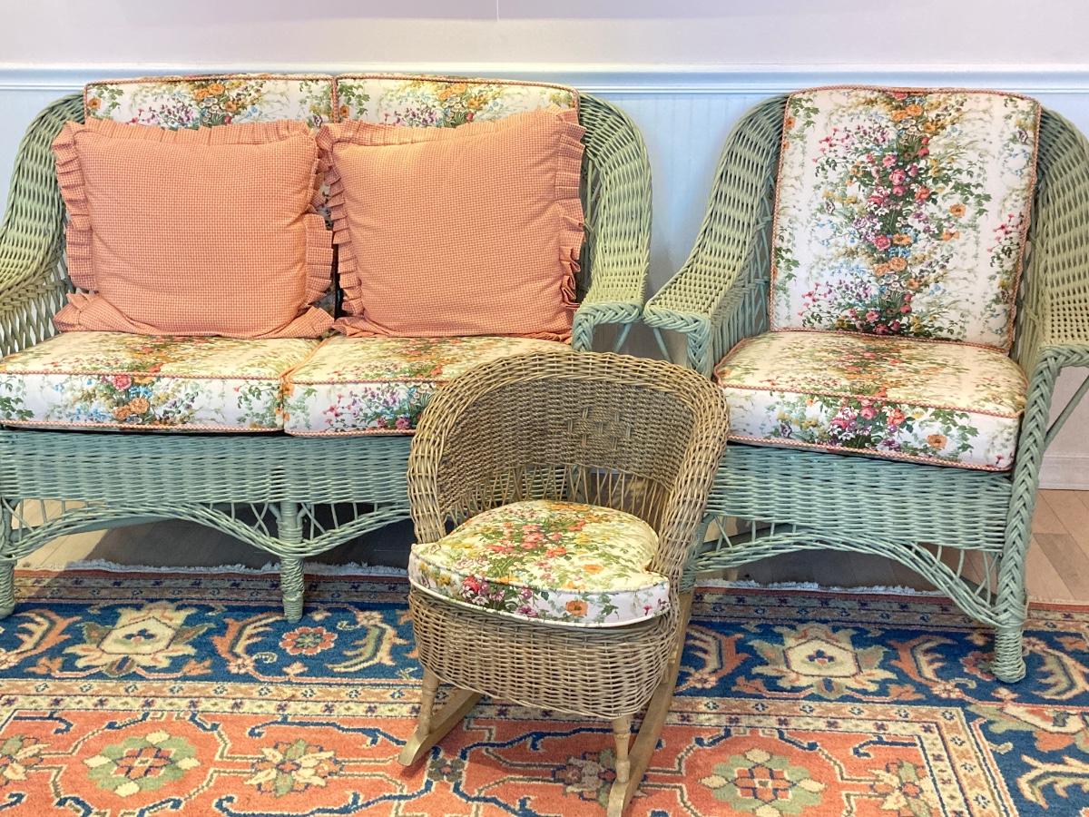 LOT 283: Green Wicker Love Seat, Chair and Children's Rocking Chair
