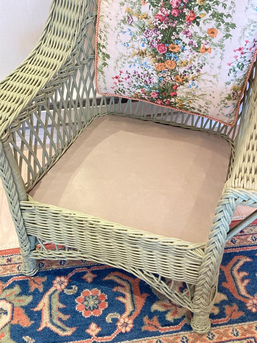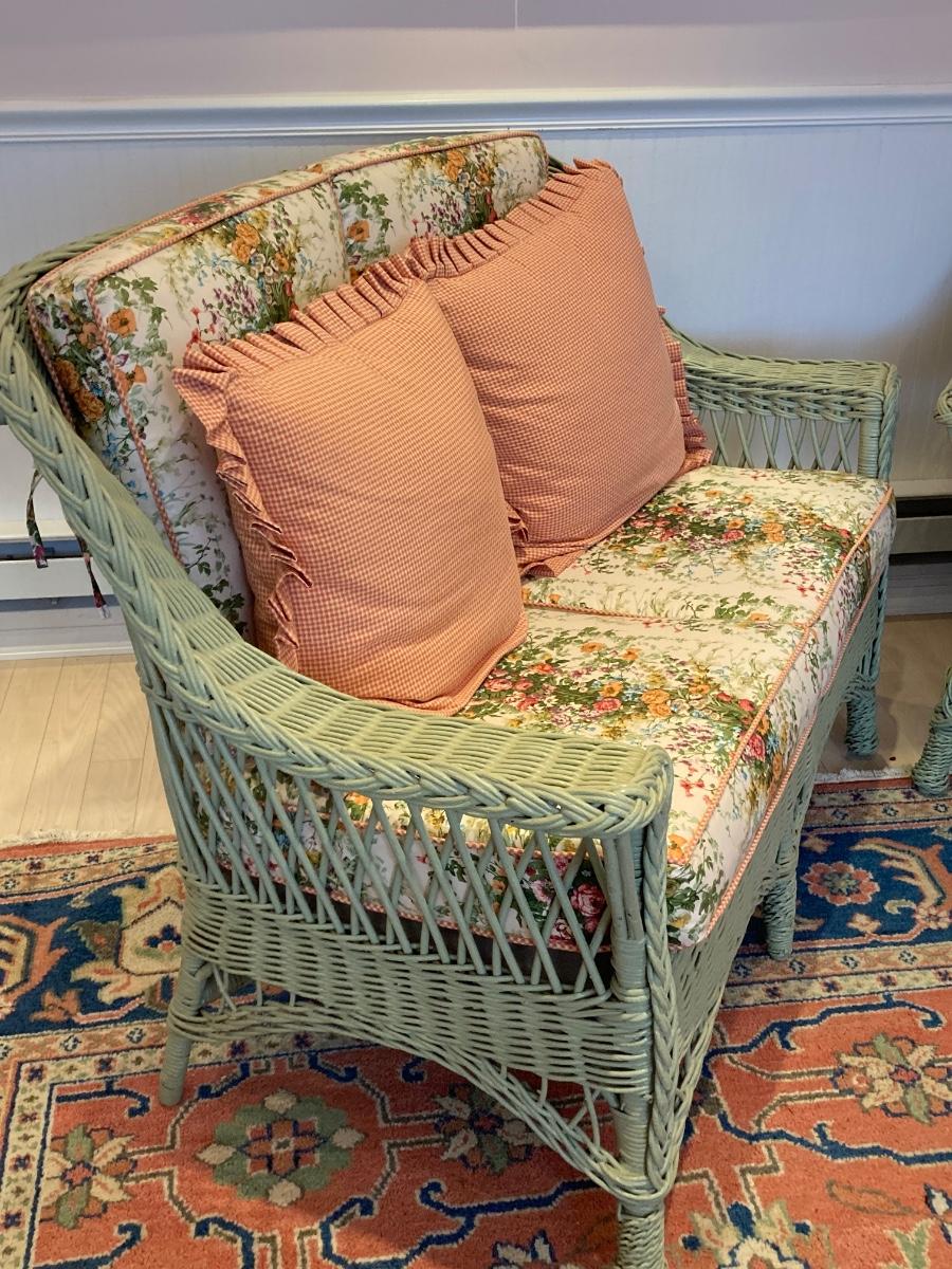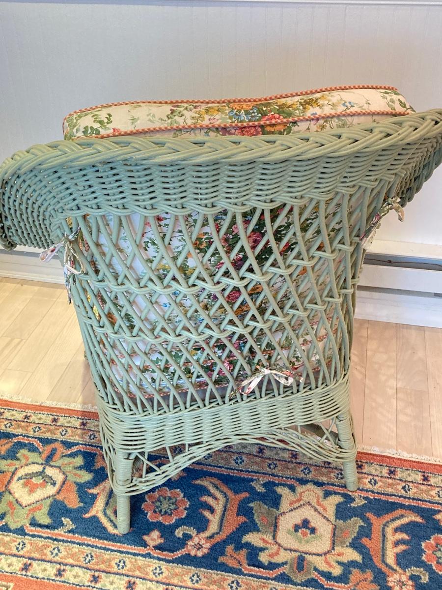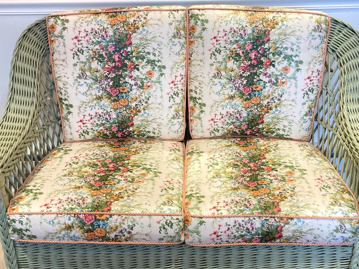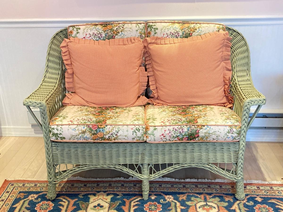 LOT 283: Green Wicker Love Seat, Chair and Children's Rocking Chair