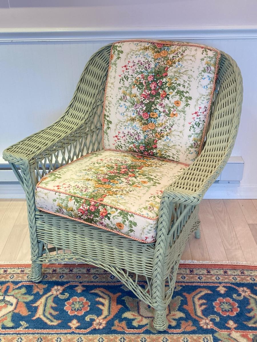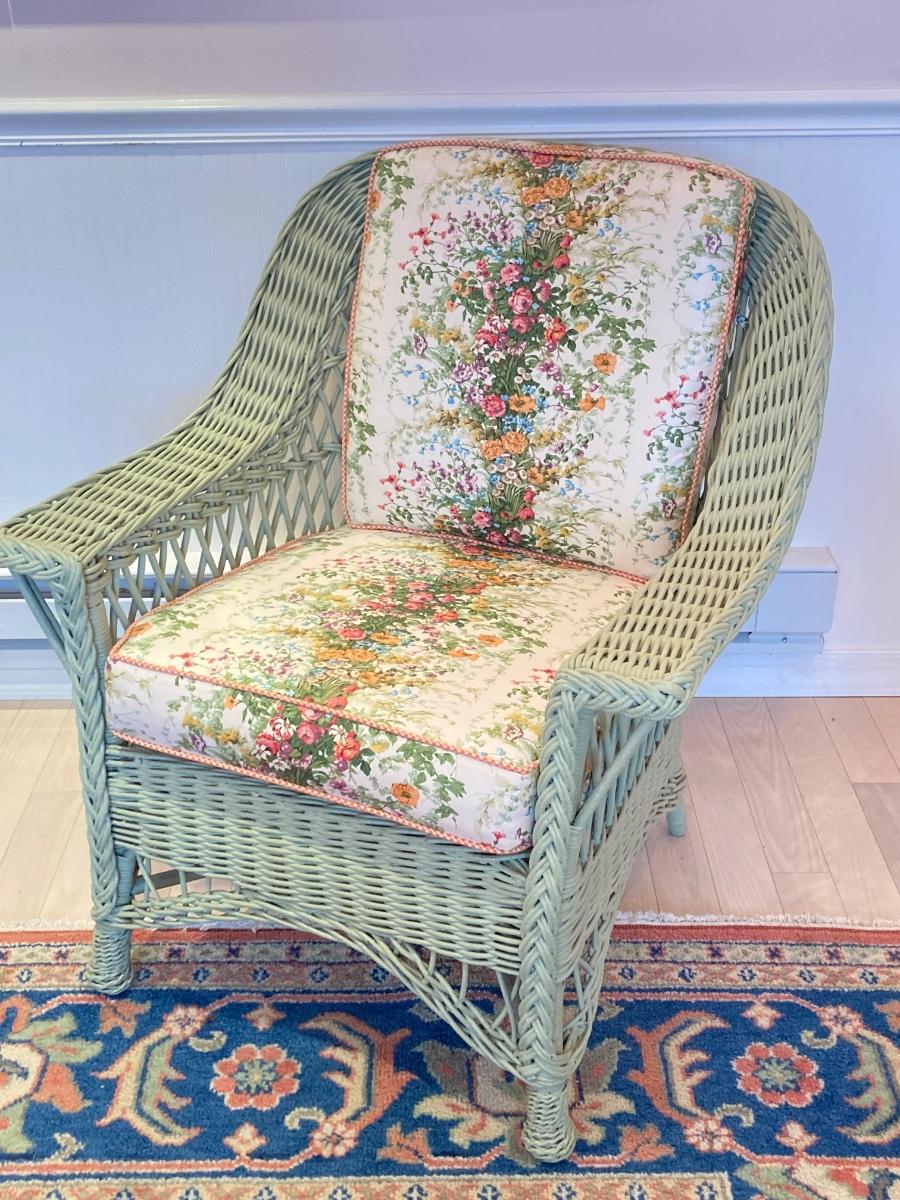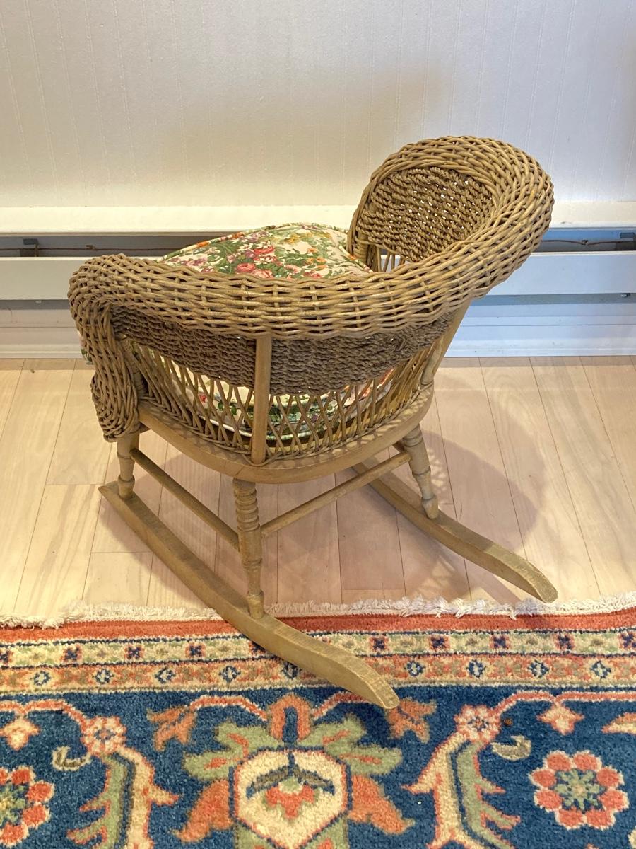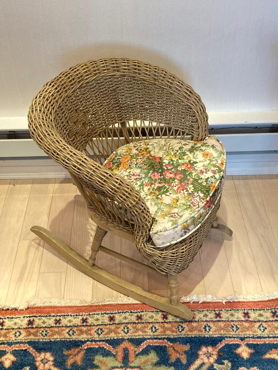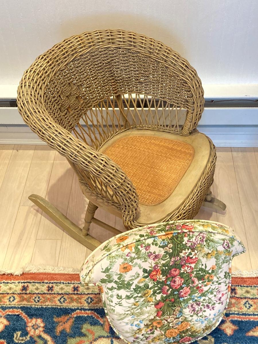 LOT 283: Green Wicker Love Seat, Chair and Children's Rocking Chair