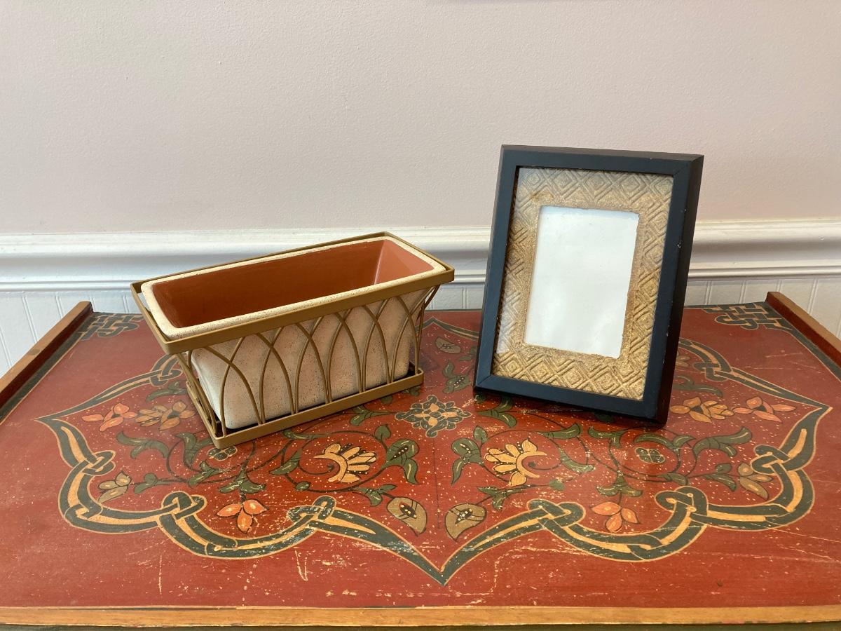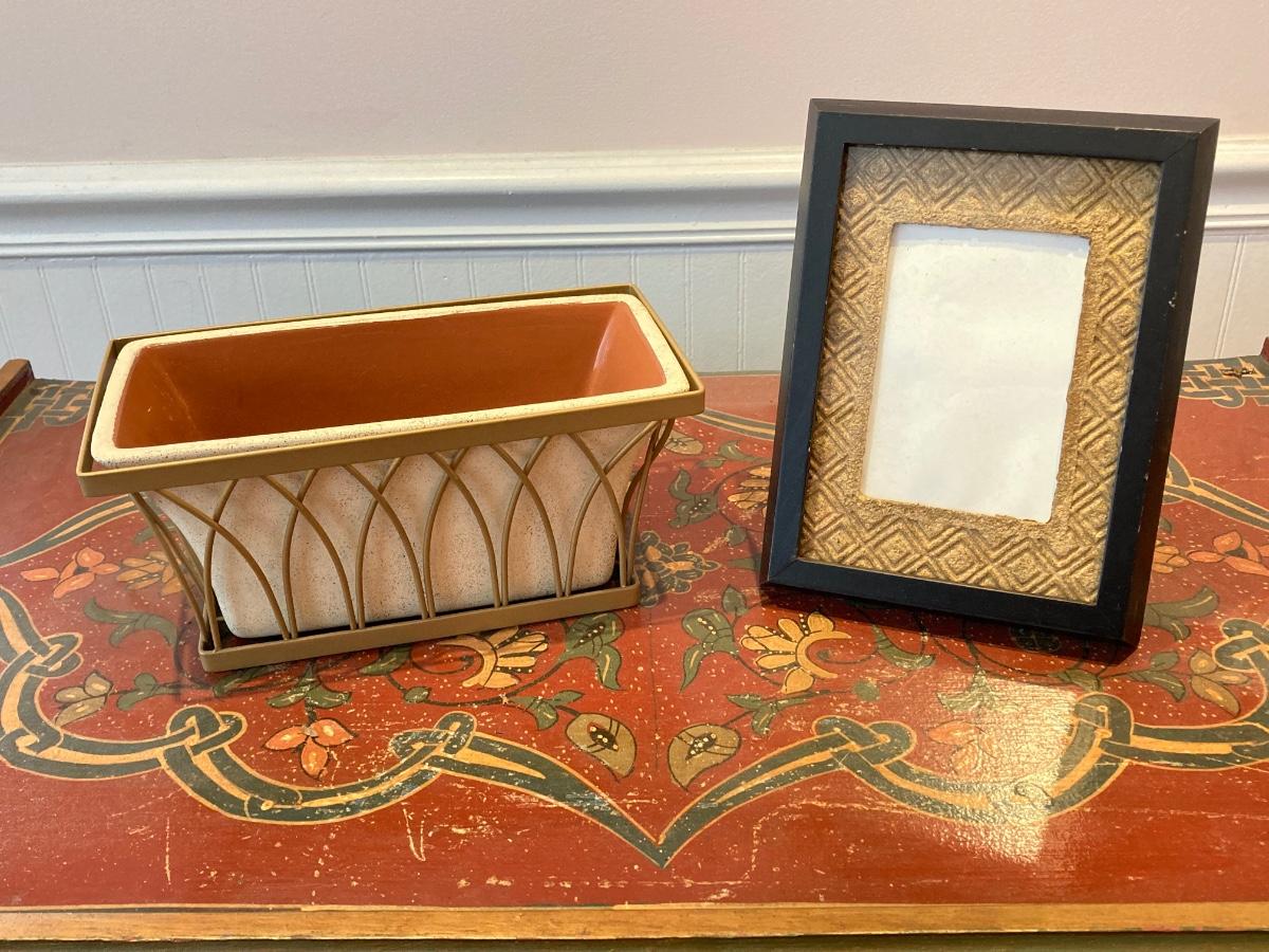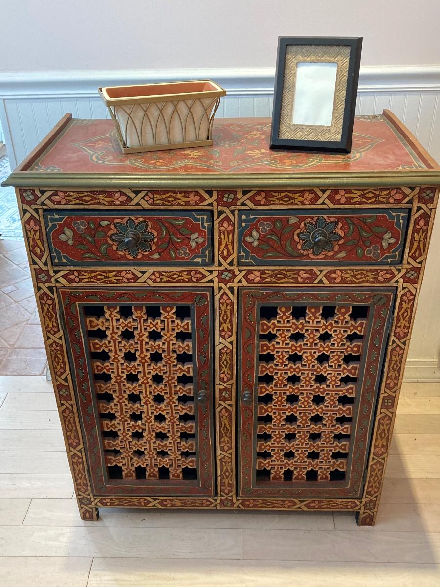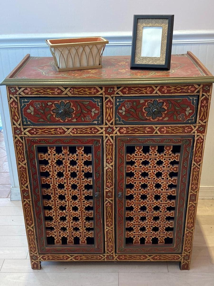 LOT 292: Modern Moroccan Painted Cabinet, Picture Frame and Planter Basket