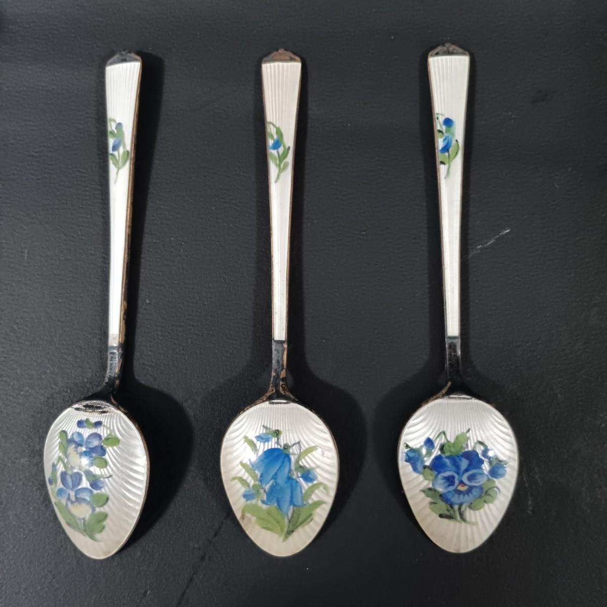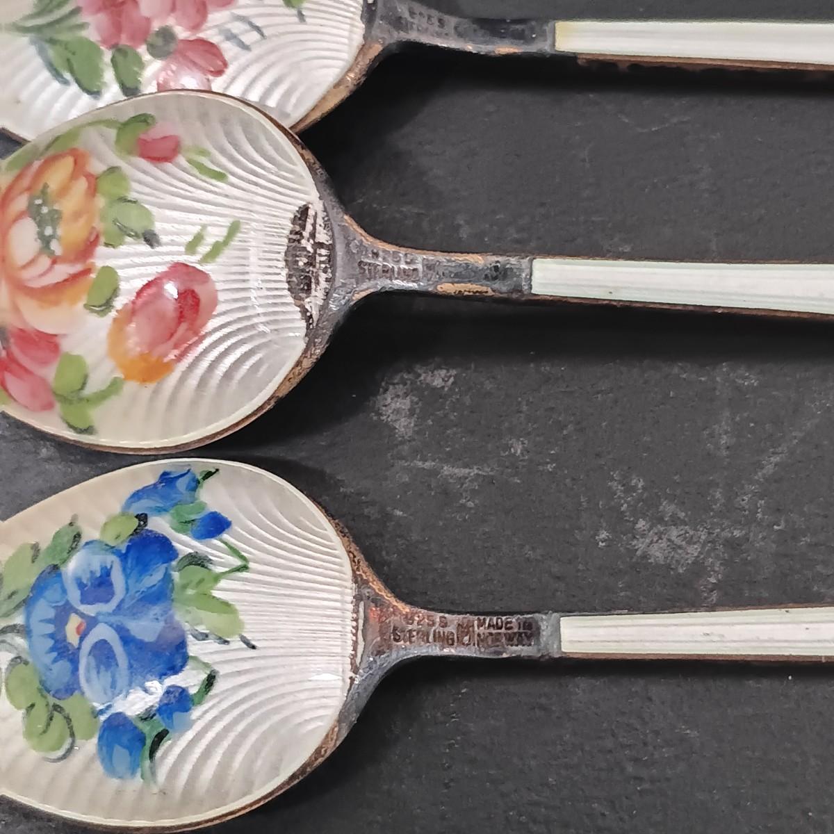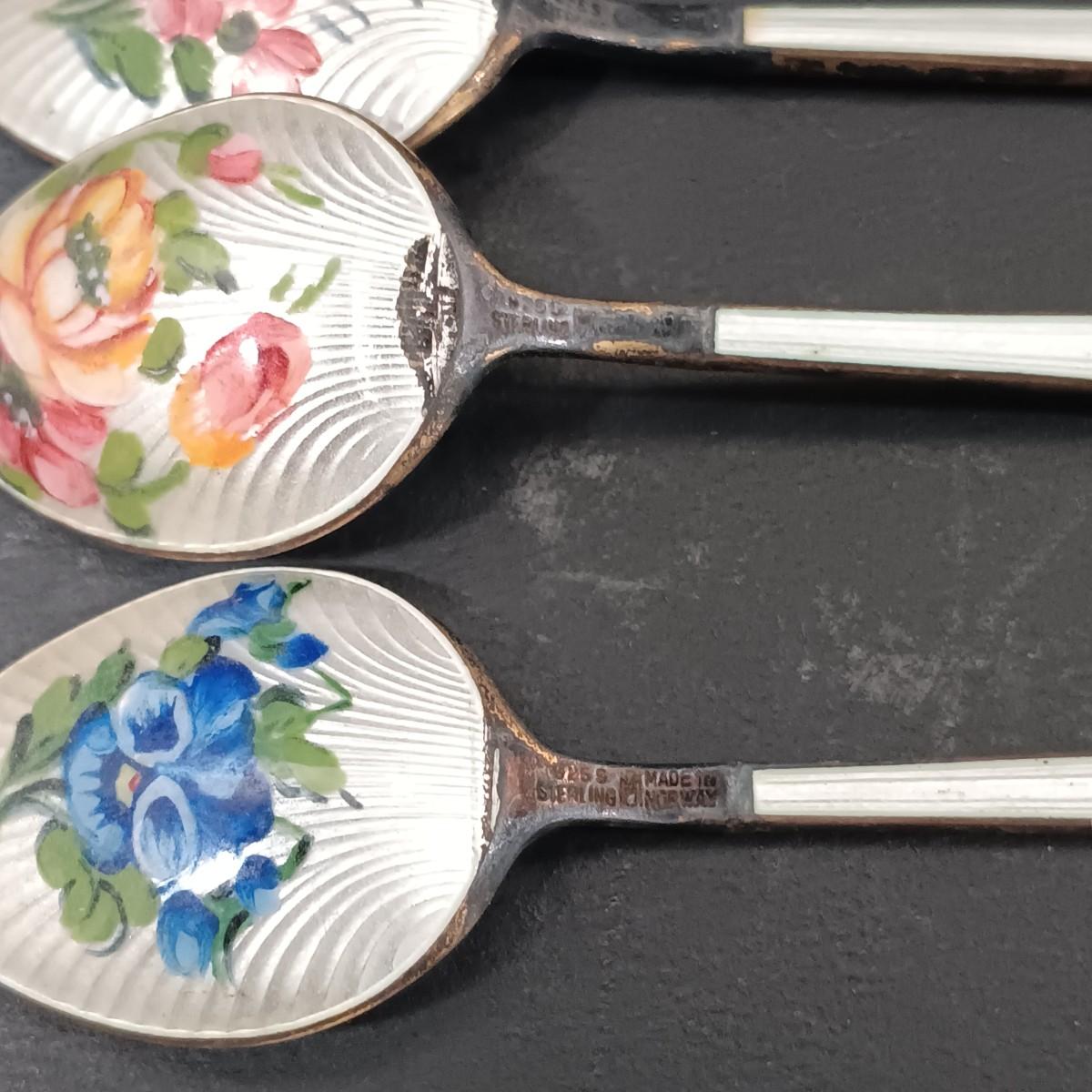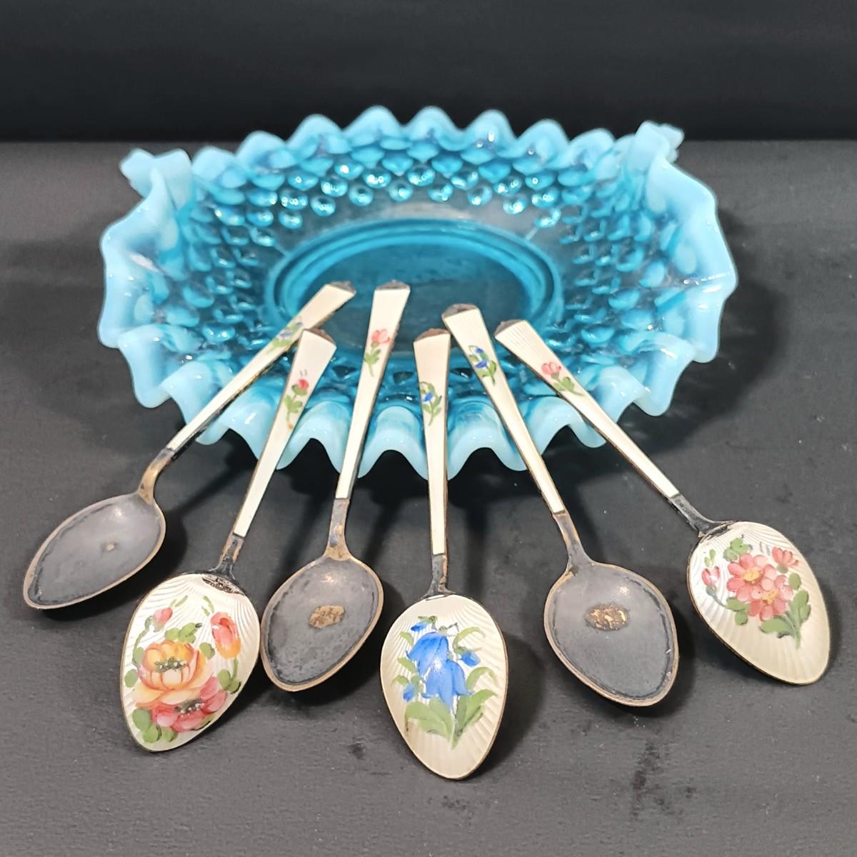 LOT 303: Set of 6 Sterling and Enameled Collectible Spoons from Norway w/ Hobnail Ruffled Glass Dish