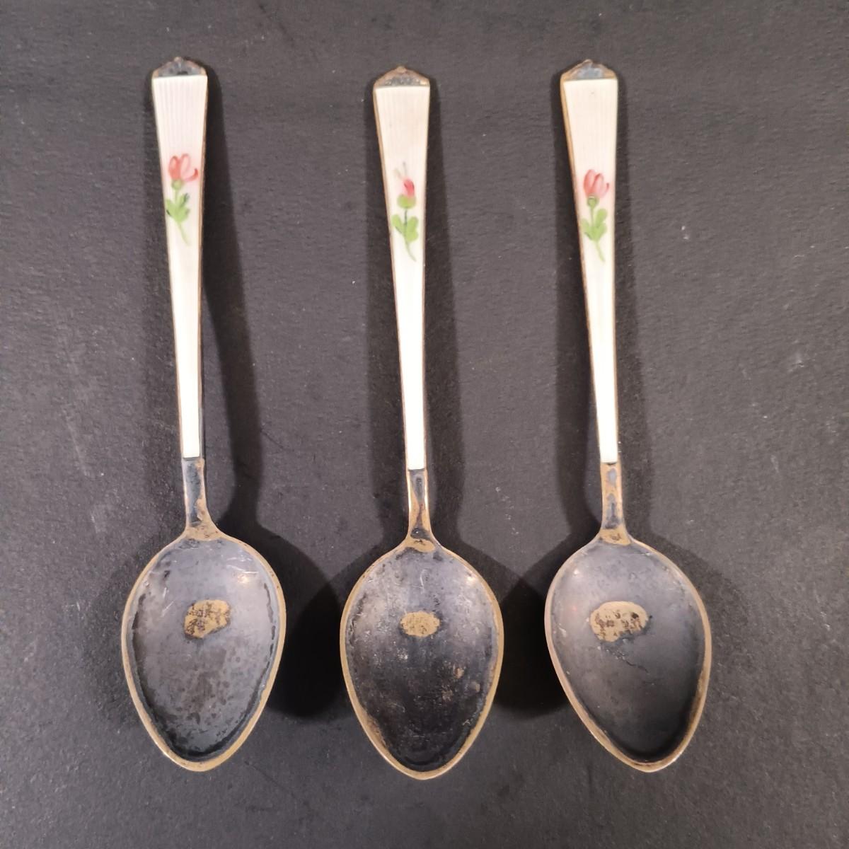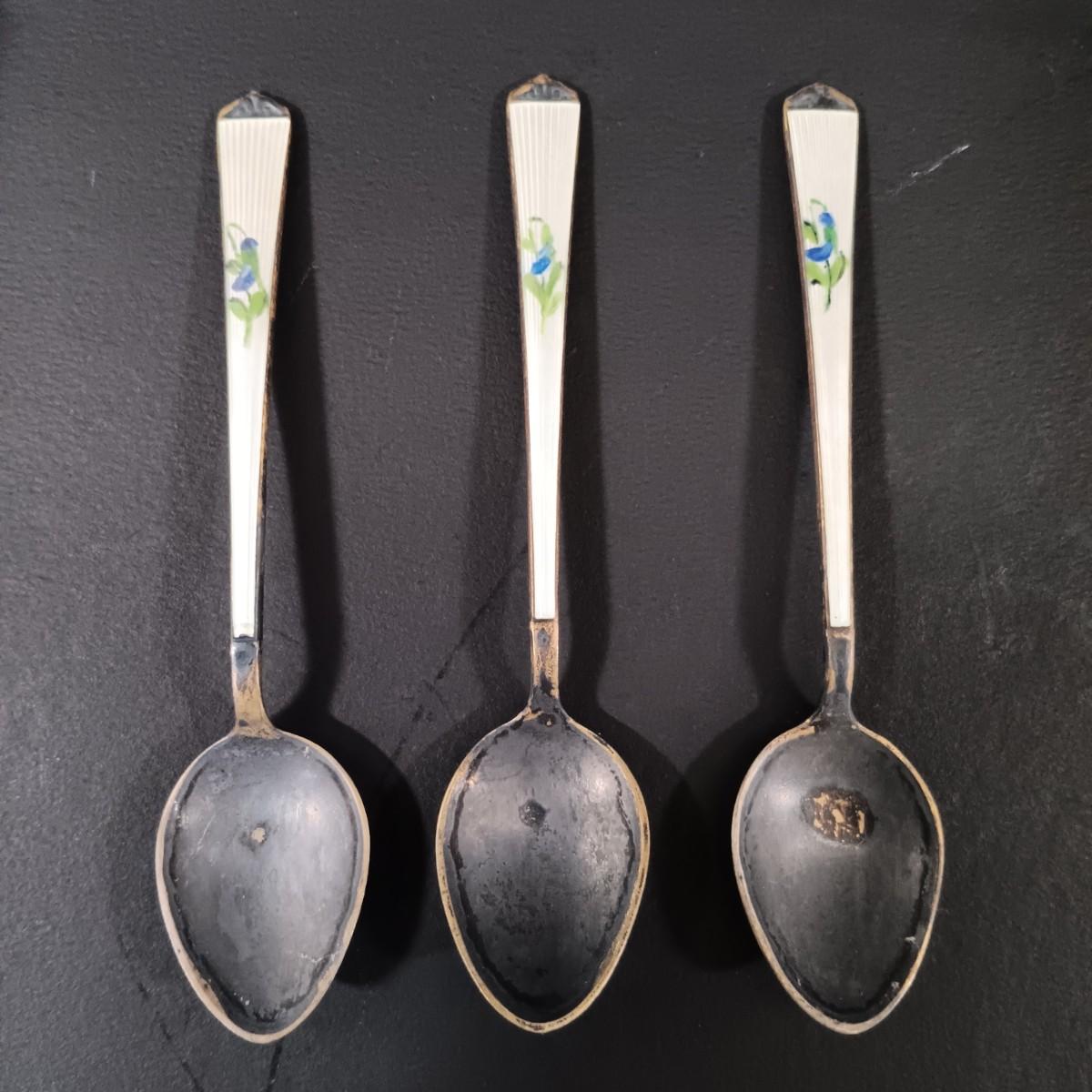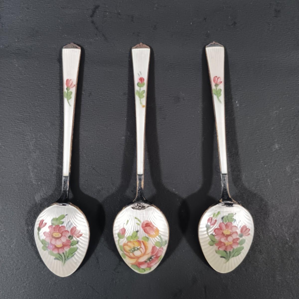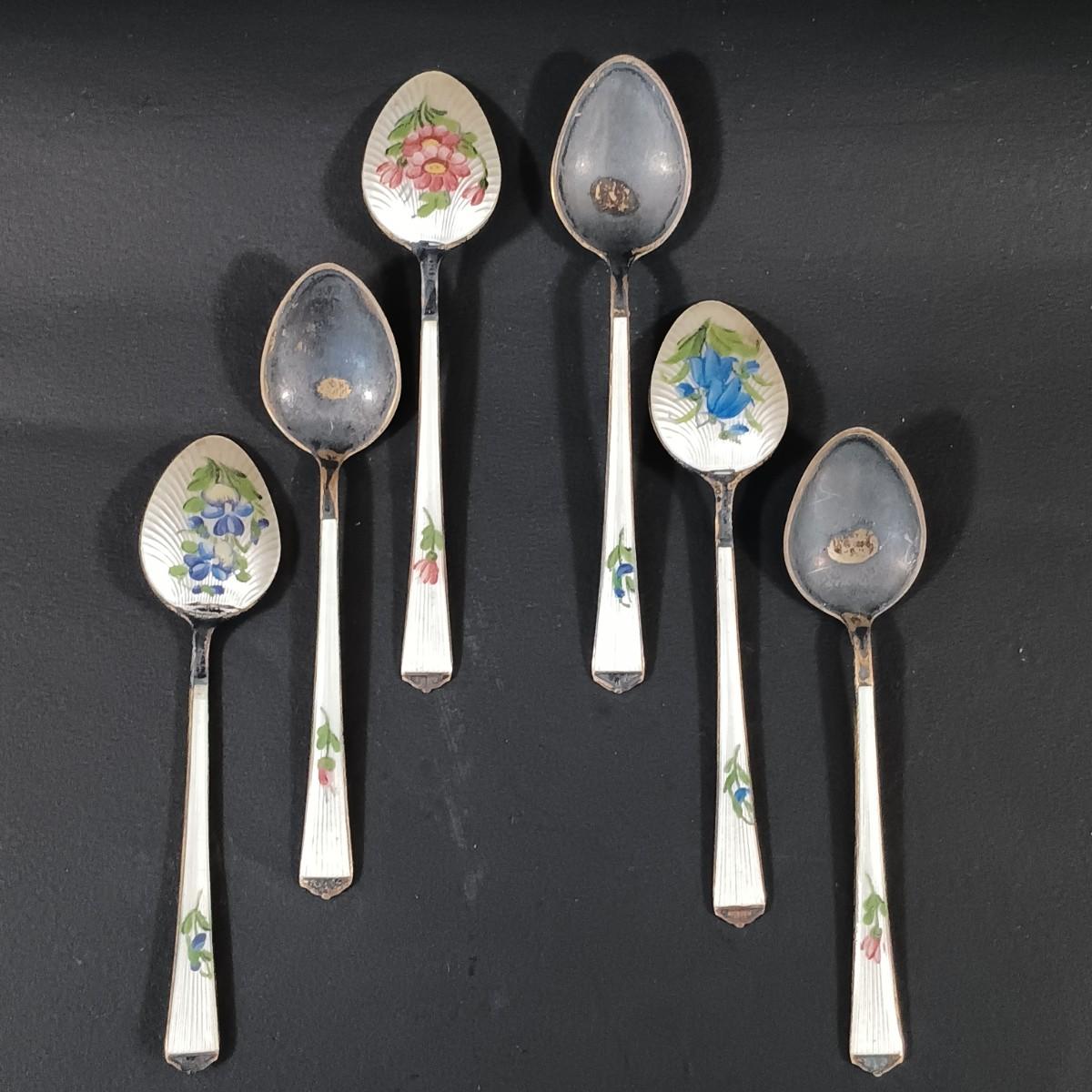 LOT 303: Set of 6 Sterling and Enameled Collectible Spoons from Norway w/ Hobnail Ruffled Glass Dish