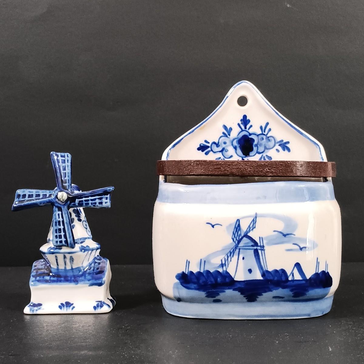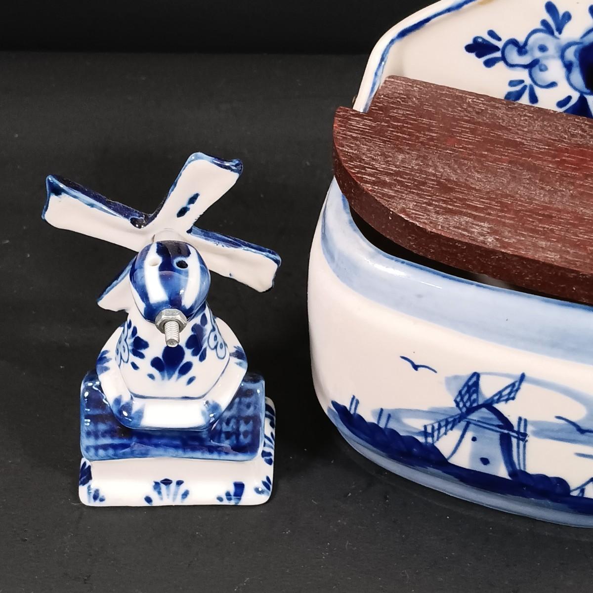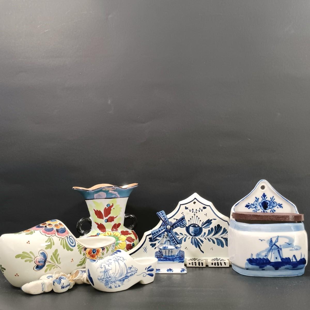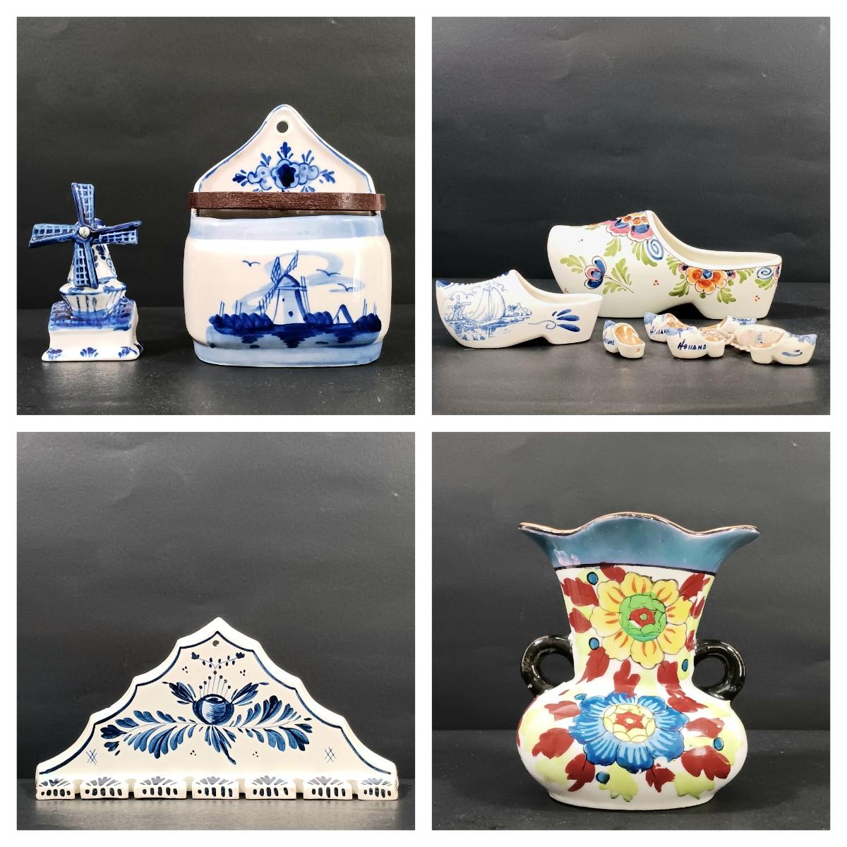 LOT 305: Delft Holland Porcelain Shoes and Spoon Display with Lusterware Vase, Salt Box & Windmill Salt Shaker
