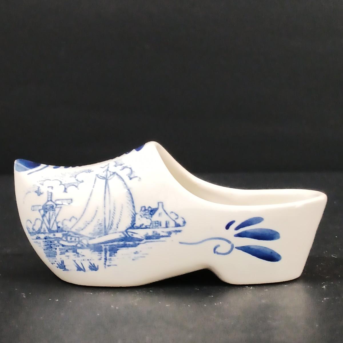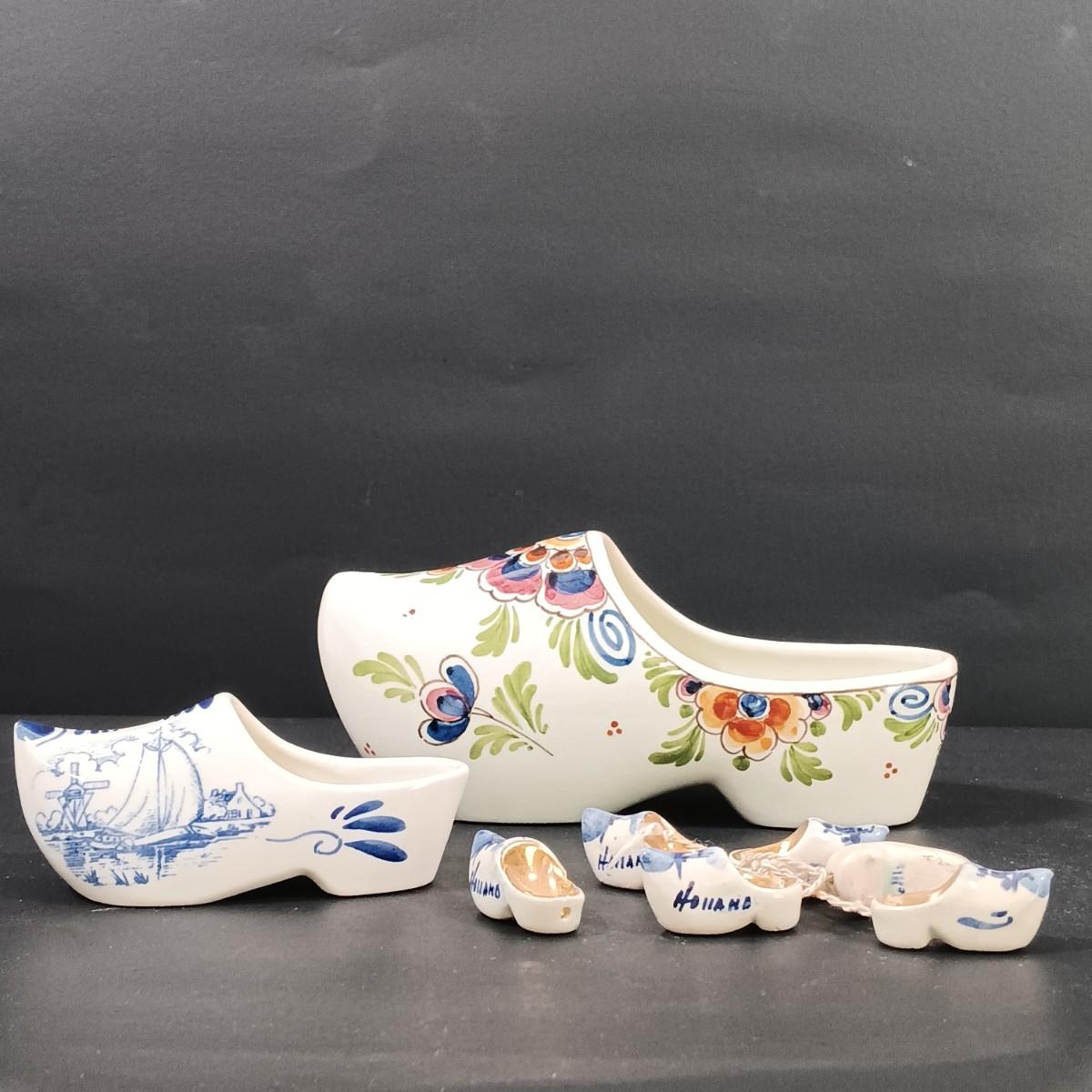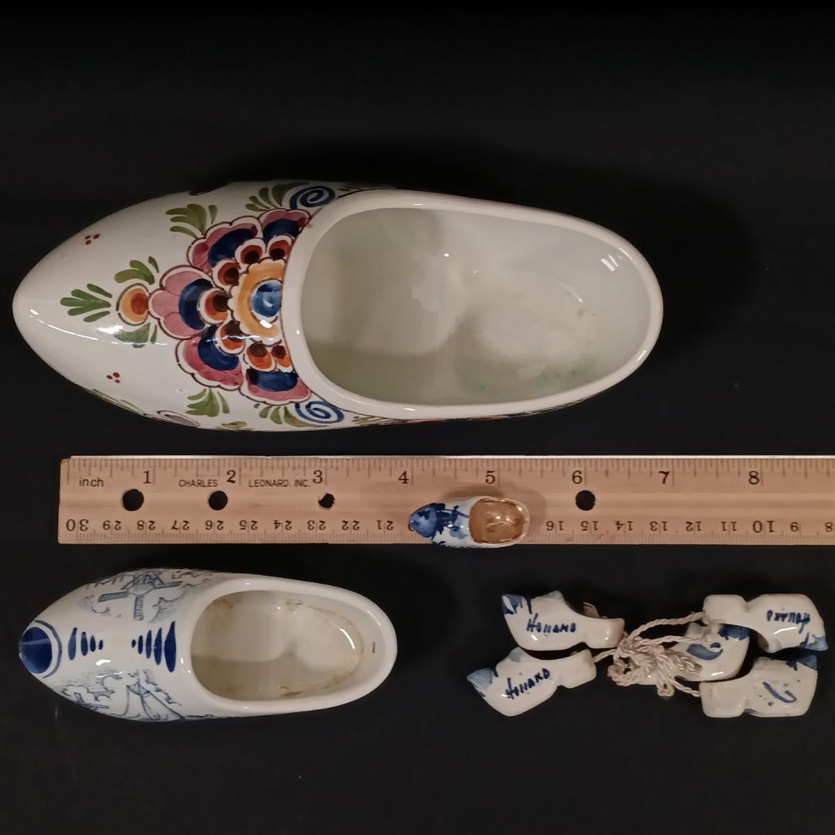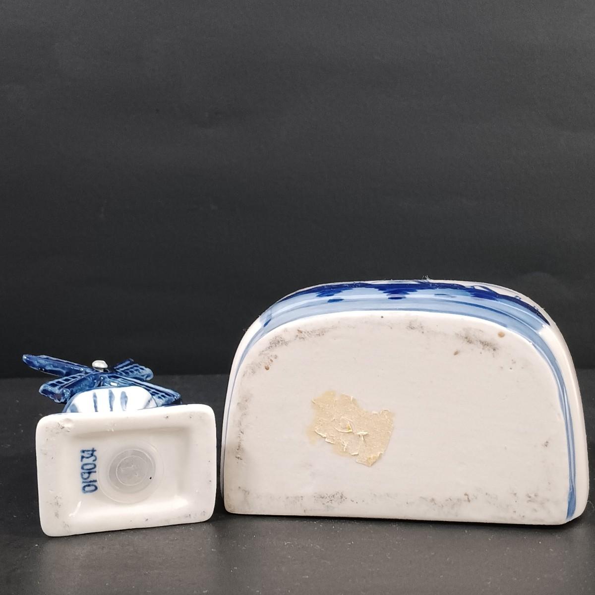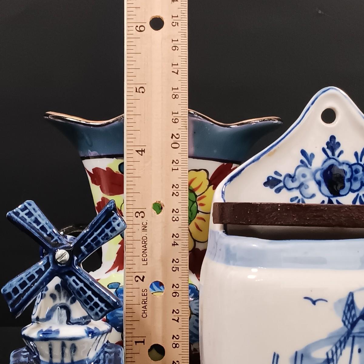 LOT 305: Delft Holland Porcelain Shoes and Spoon Display with Lusterware Vase, Salt Box & Windmill Salt Shaker