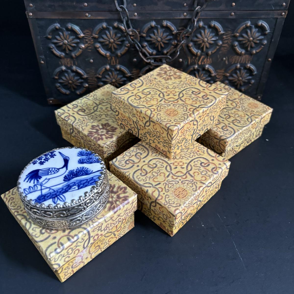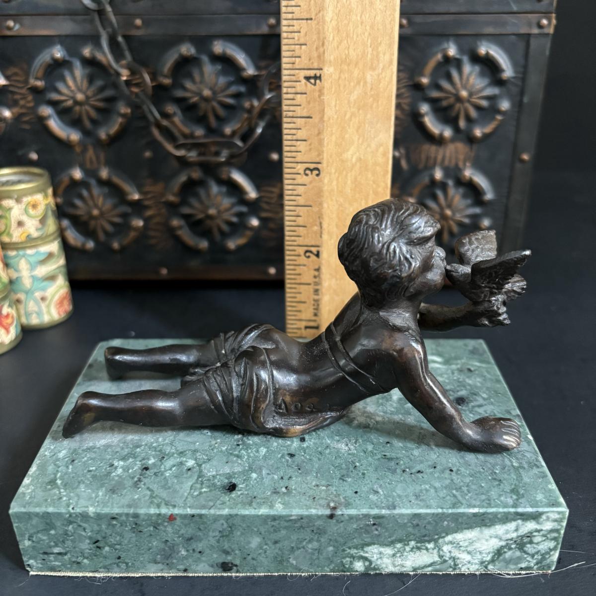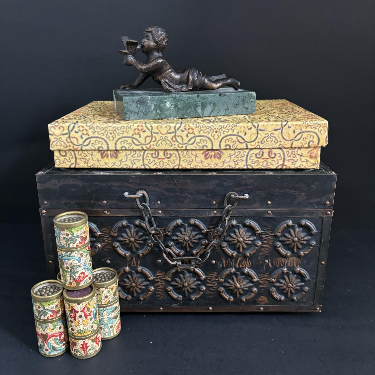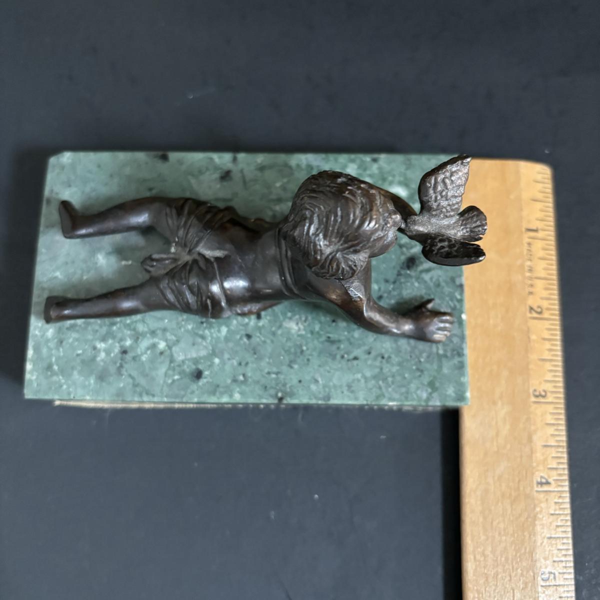 LOT 329: Renaissance Style Jewelry Chest, Bronze Statue of Boy w/Bird on Marble Base, New in Package Trinket Boxes