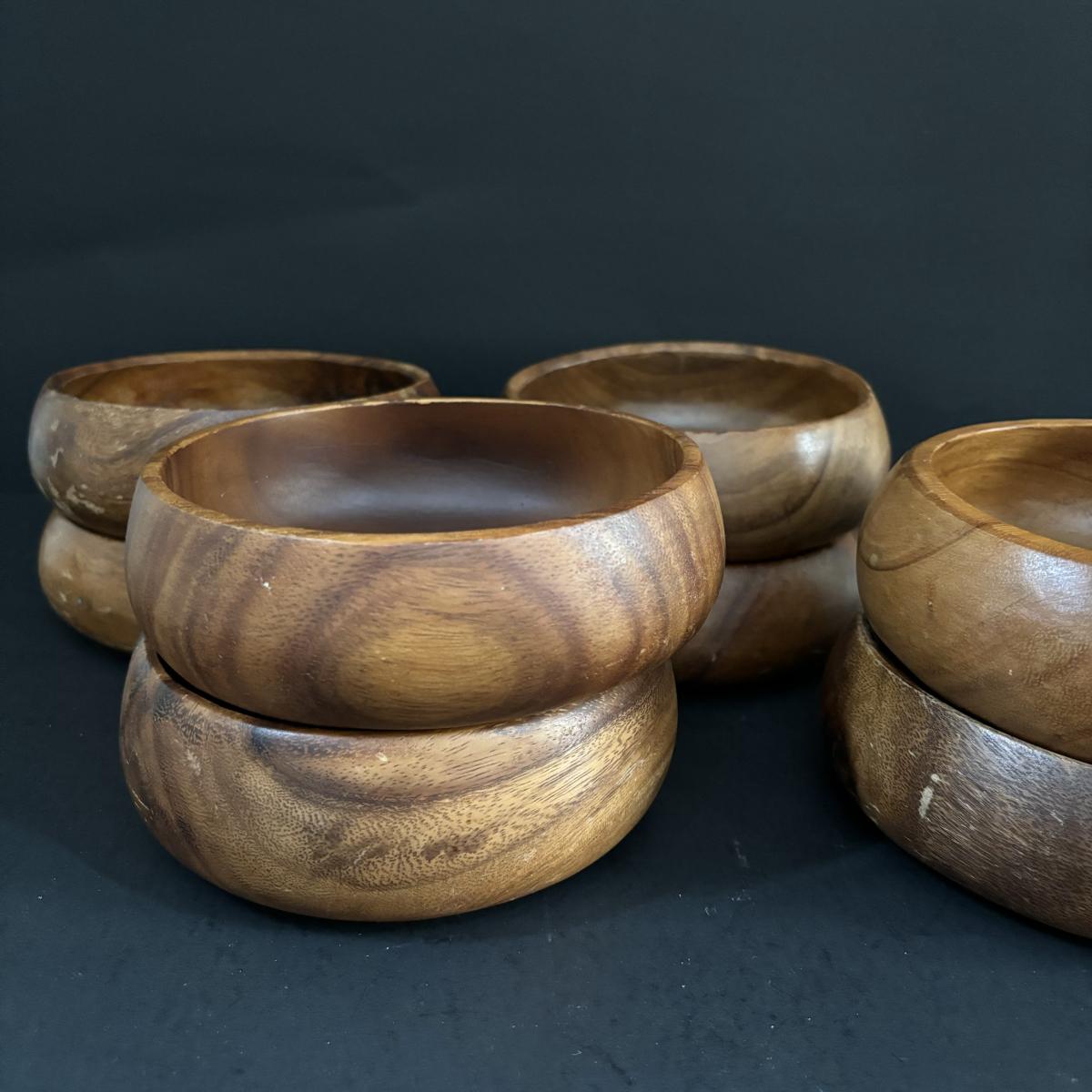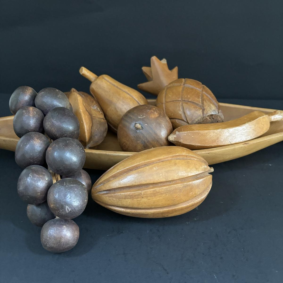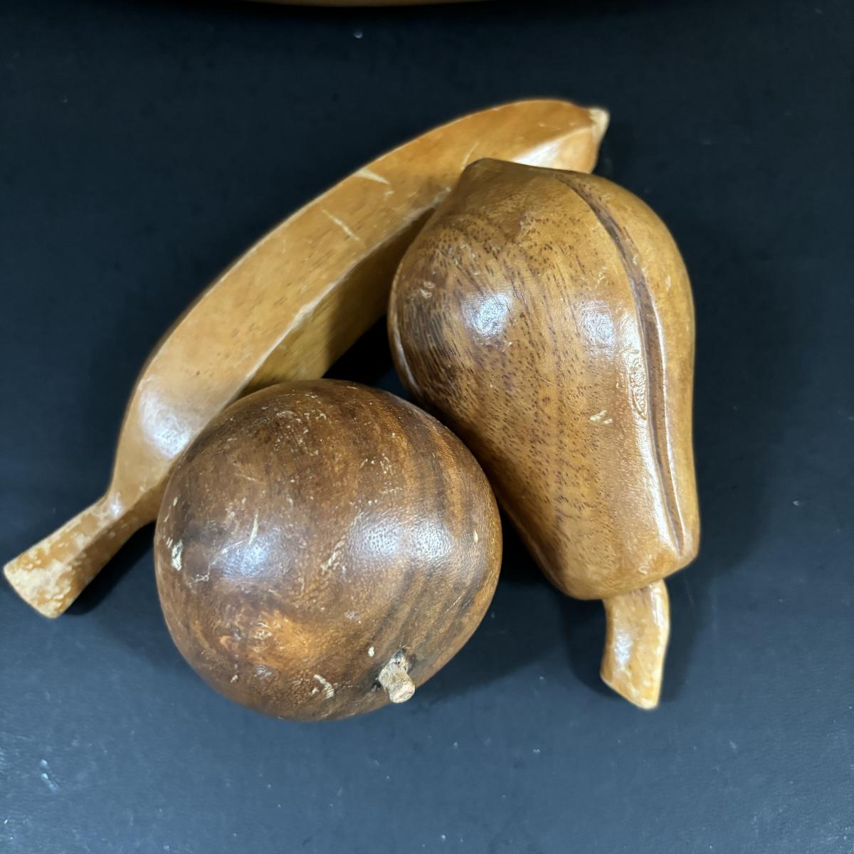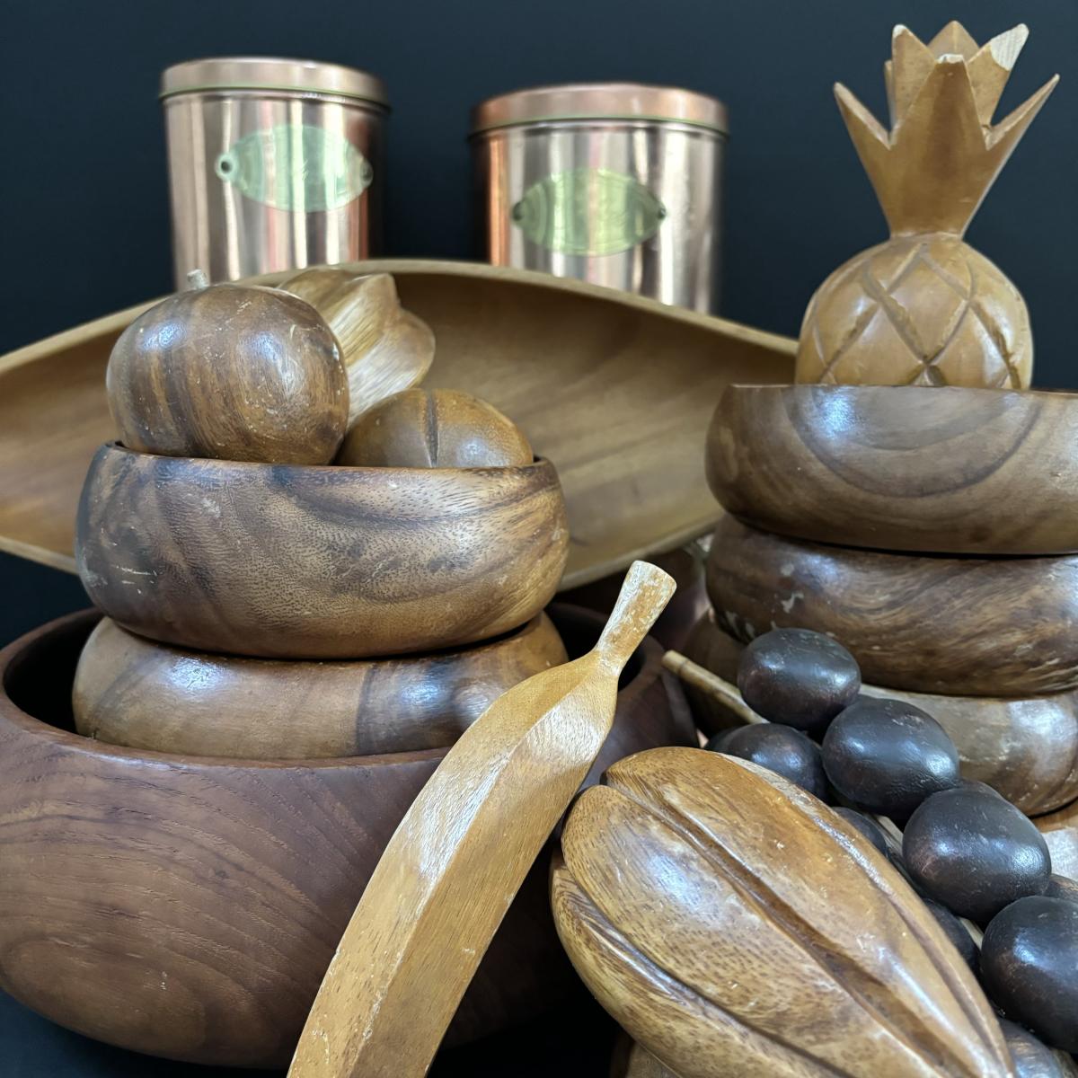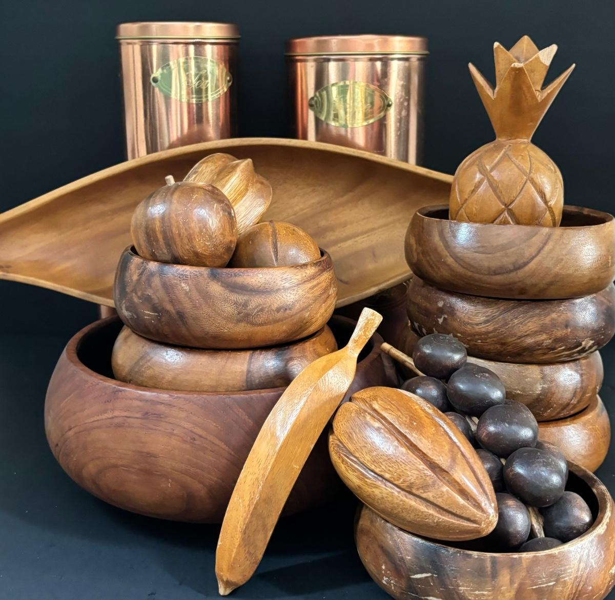 LOT 331: Wood Salad Bowl Set w/8 Bowls, Wooden Fruit & Copper Color Canister Set