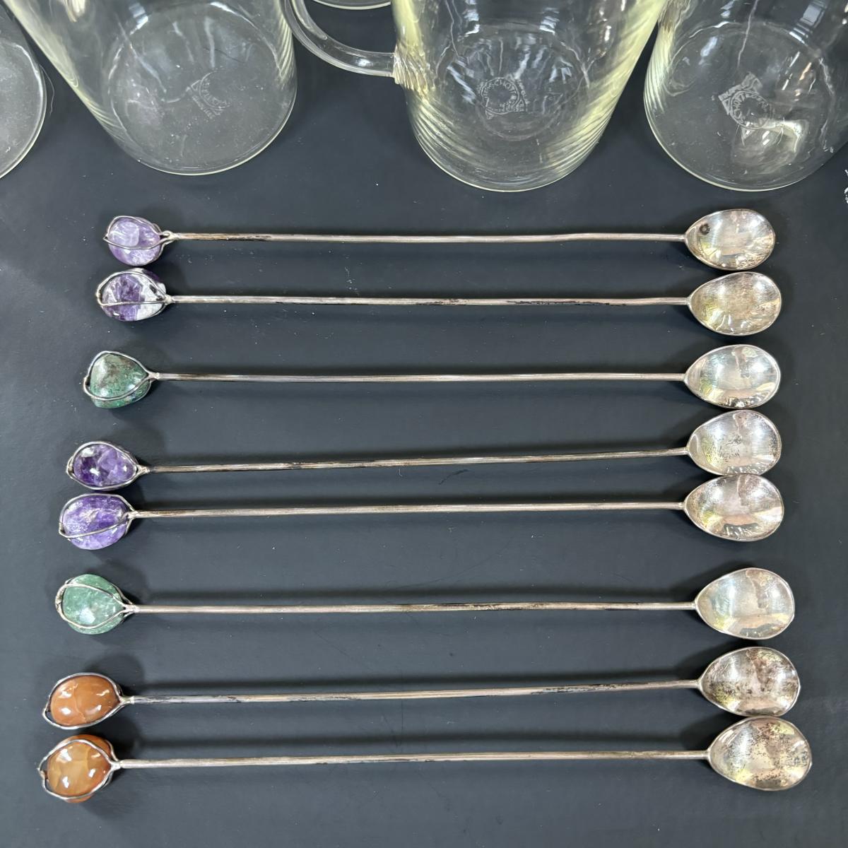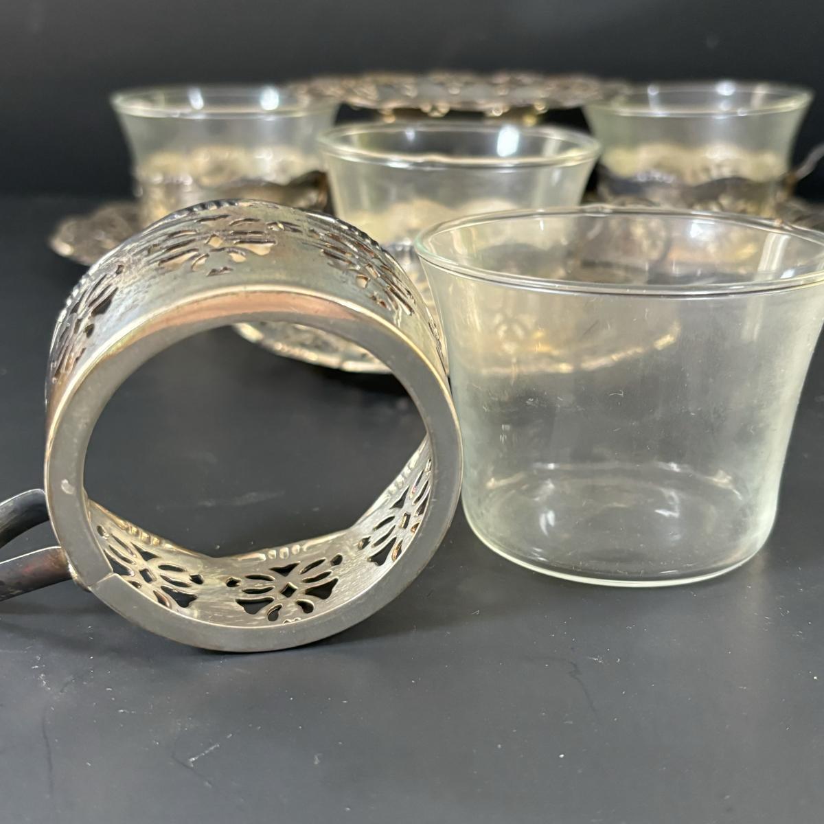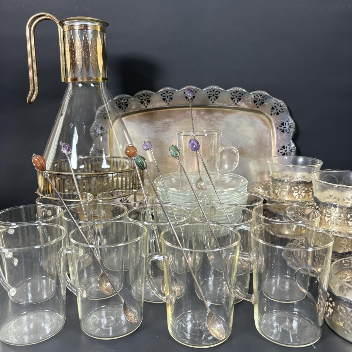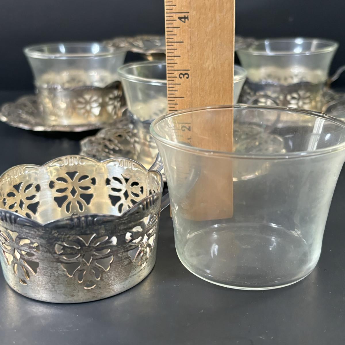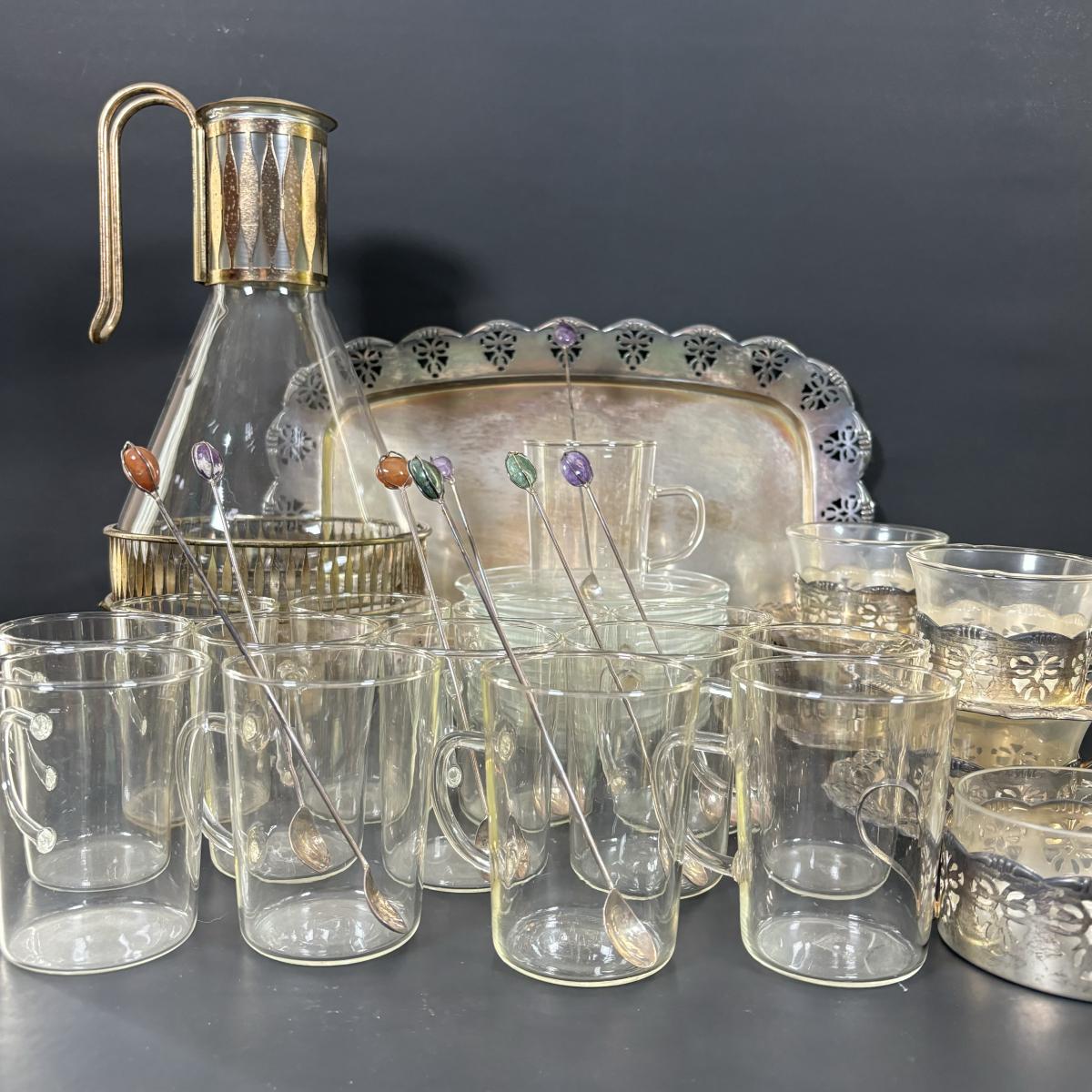 LOT 342: Sterling Silver Iced Teaspoons w/Gemstones, (Mexico 925) Vintage Schott Glass Tea/Coffee Mugs w/ Saucers, Germany, Russian Tea Set Rz. 8710 MET.. Pyrex Berverage Server