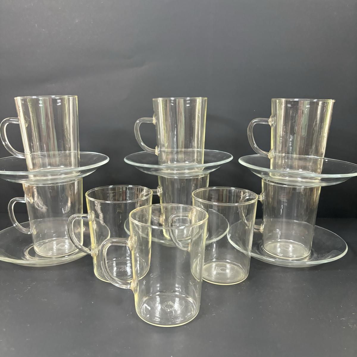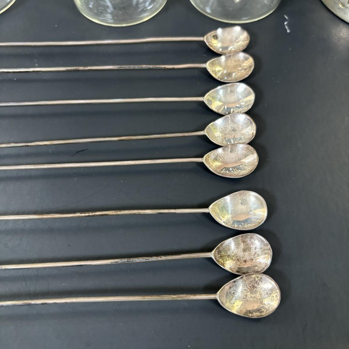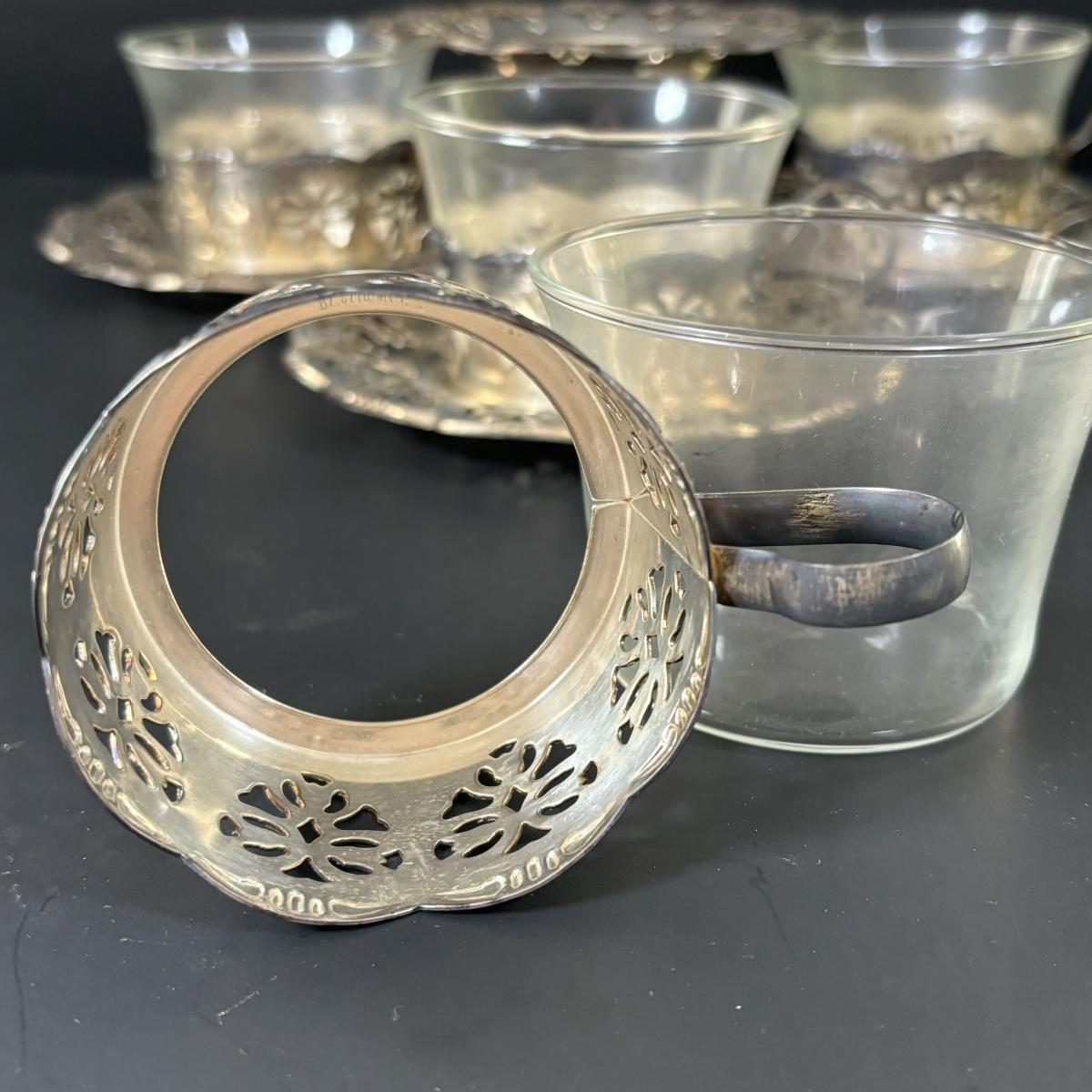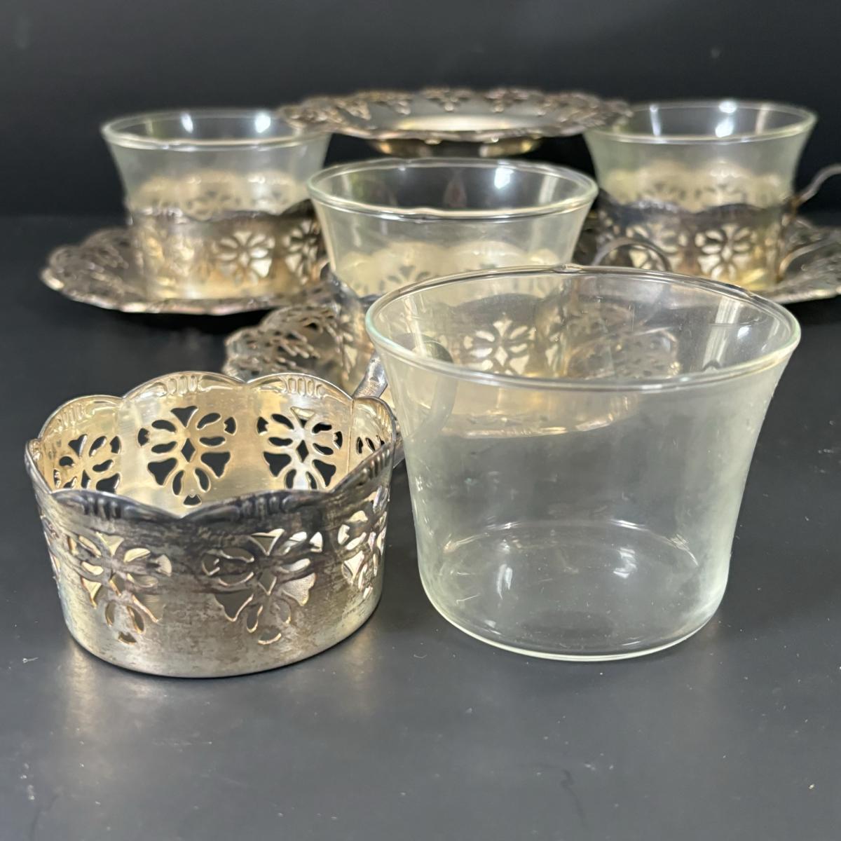 LOT 342: Sterling Silver Iced Teaspoons w/Gemstones, (Mexico 925) Vintage Schott Glass Tea/Coffee Mugs w/ Saucers, Germany, Russian Tea Set Rz. 8710 MET.. Pyrex Berverage Server
