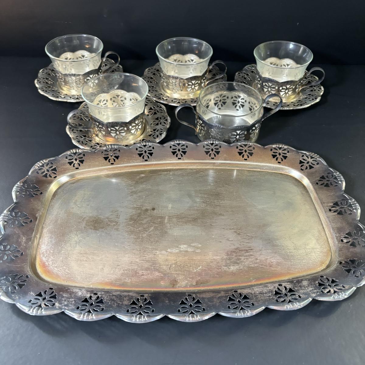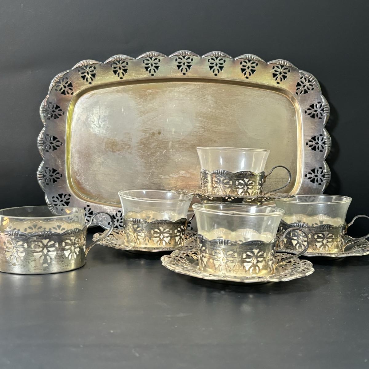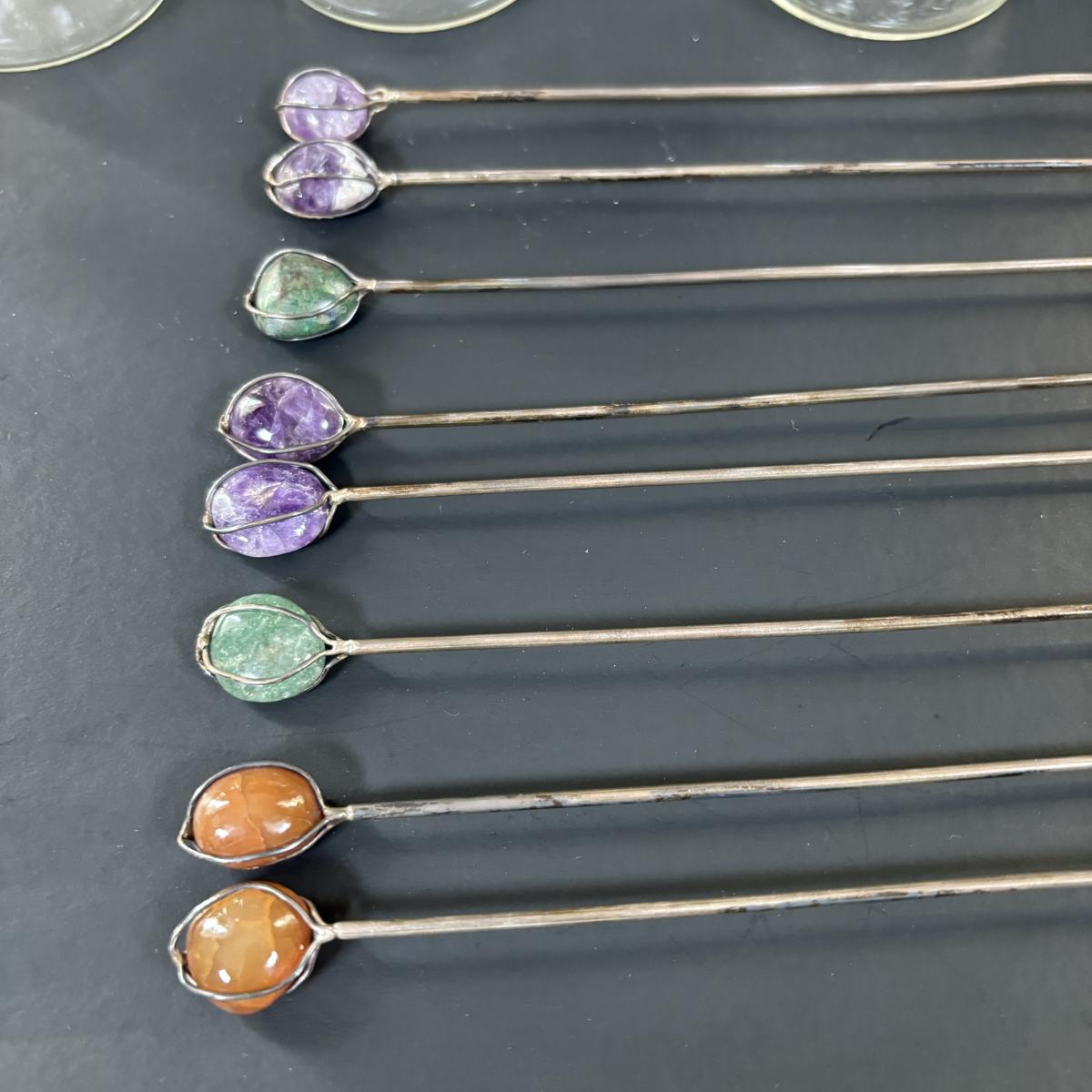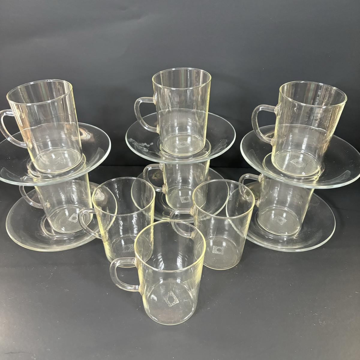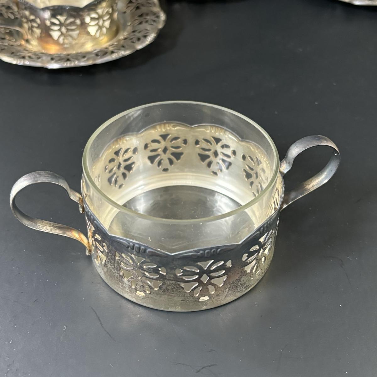 LOT 342: Sterling Silver Iced Teaspoons w/Gemstones, (Mexico 925) Vintage Schott Glass Tea/Coffee Mugs w/ Saucers, Germany, Russian Tea Set Rz. 8710 MET.. Pyrex Berverage Server