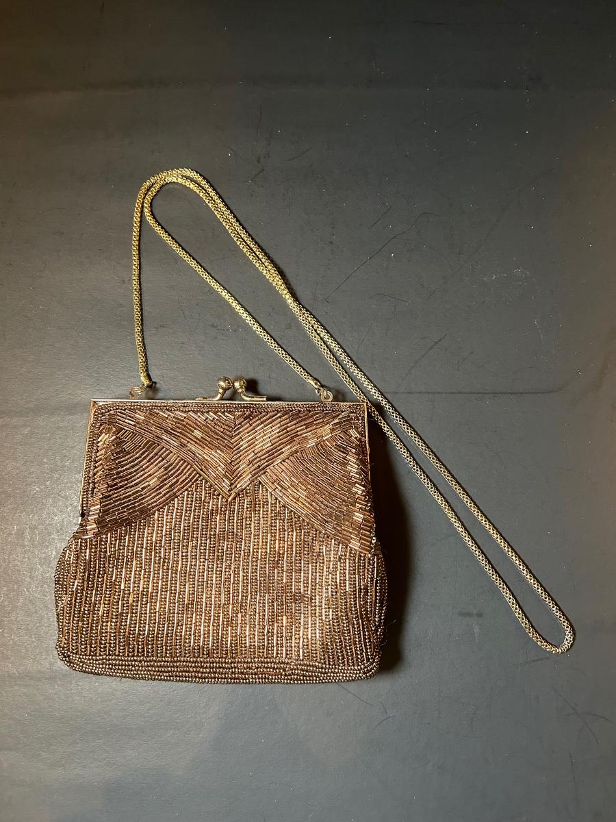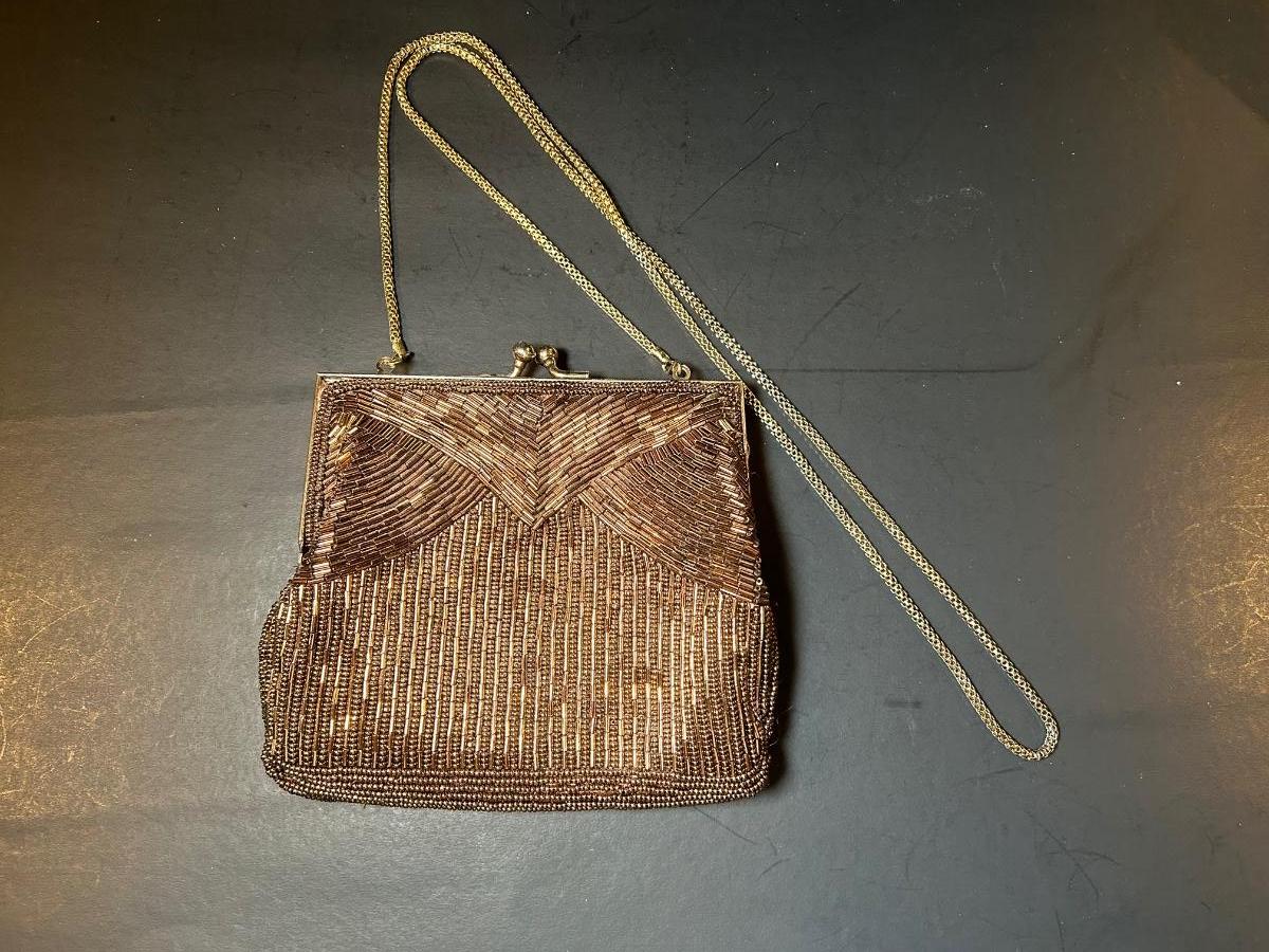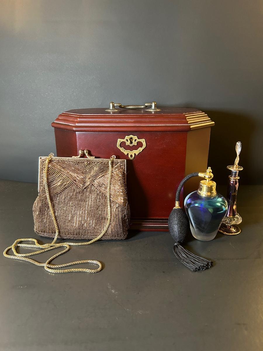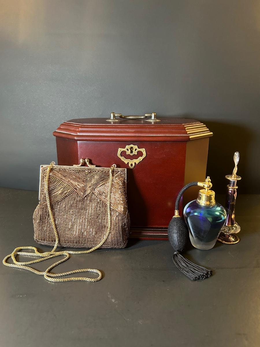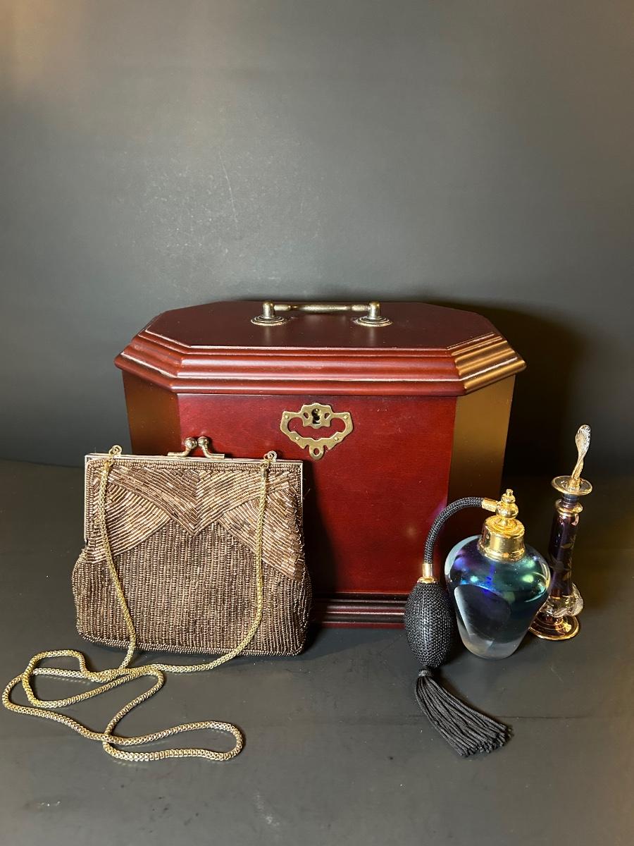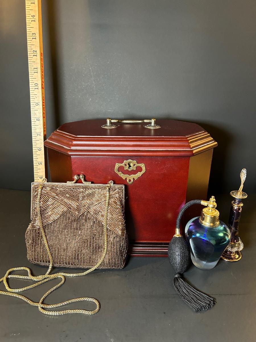 LOT 356BR: Wood Jewelry Box, Beaded Handbag and Decorative Perfume Bottles