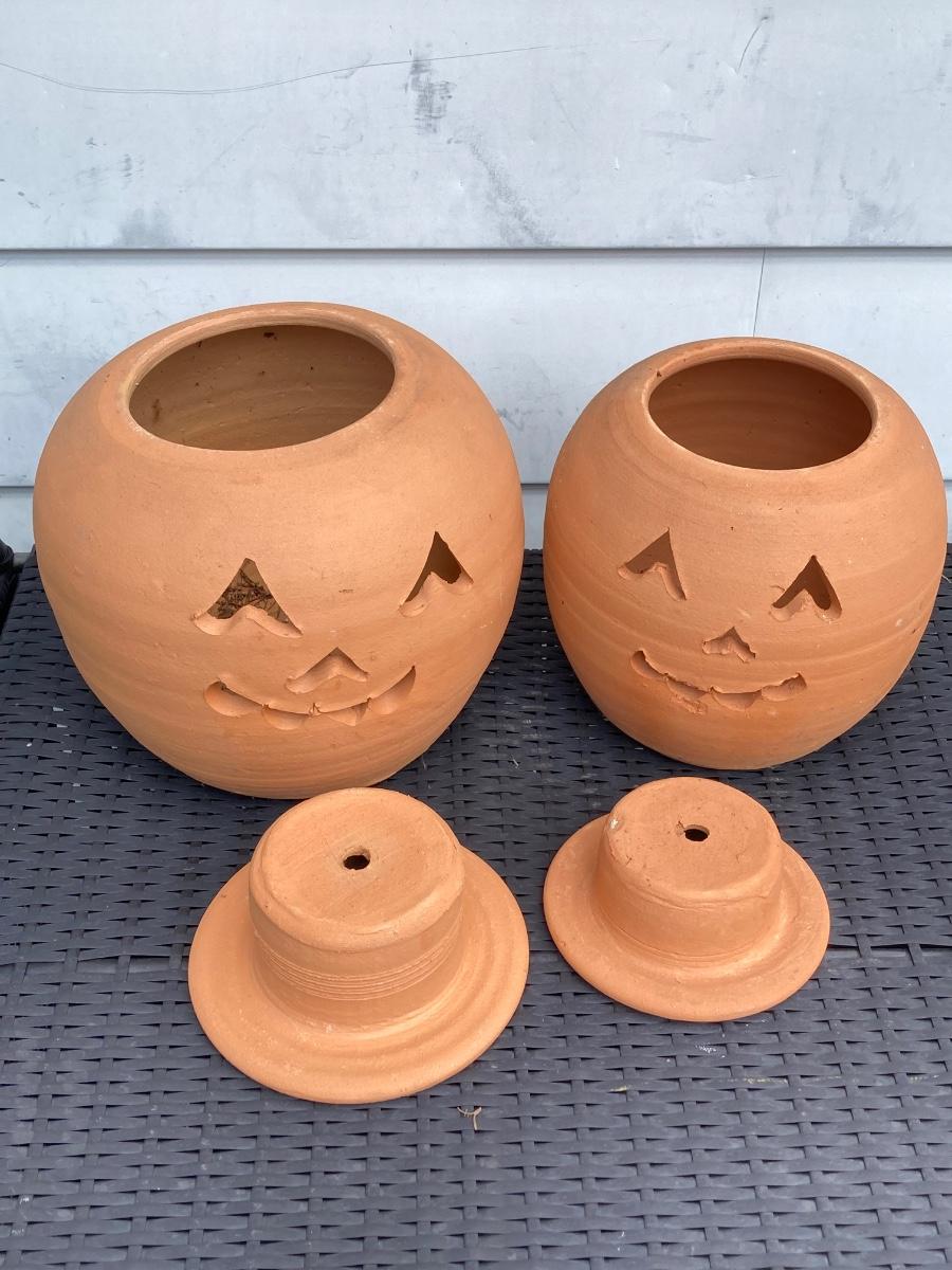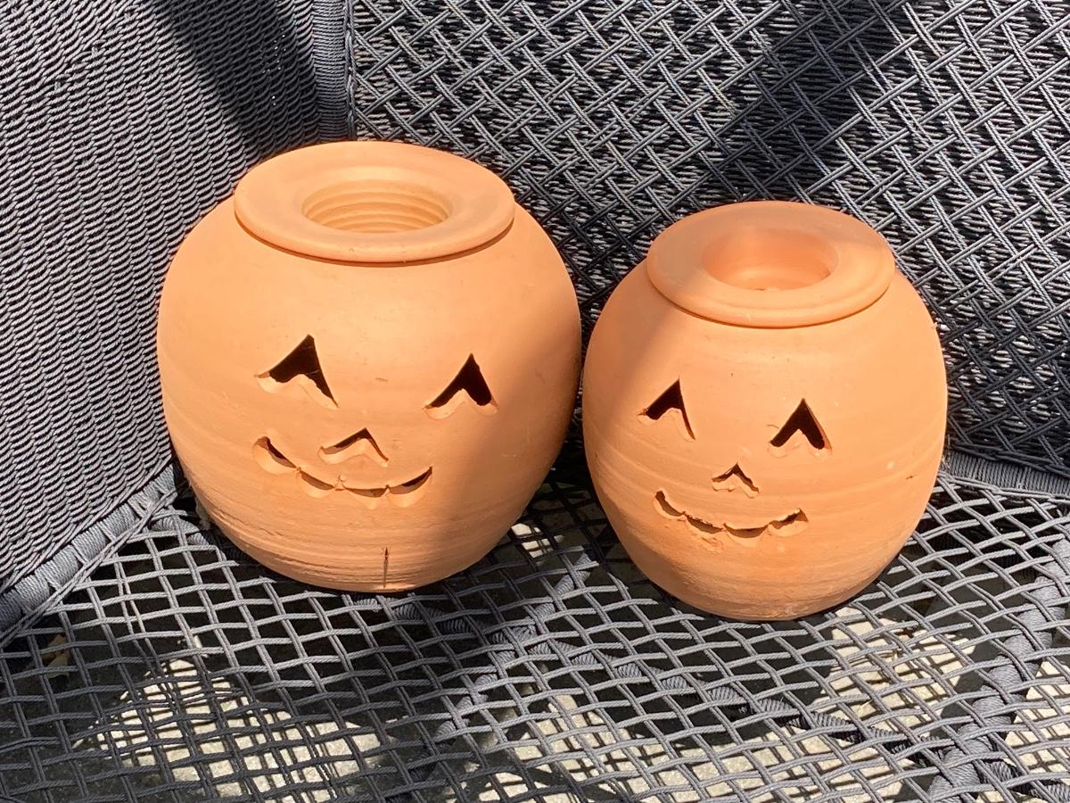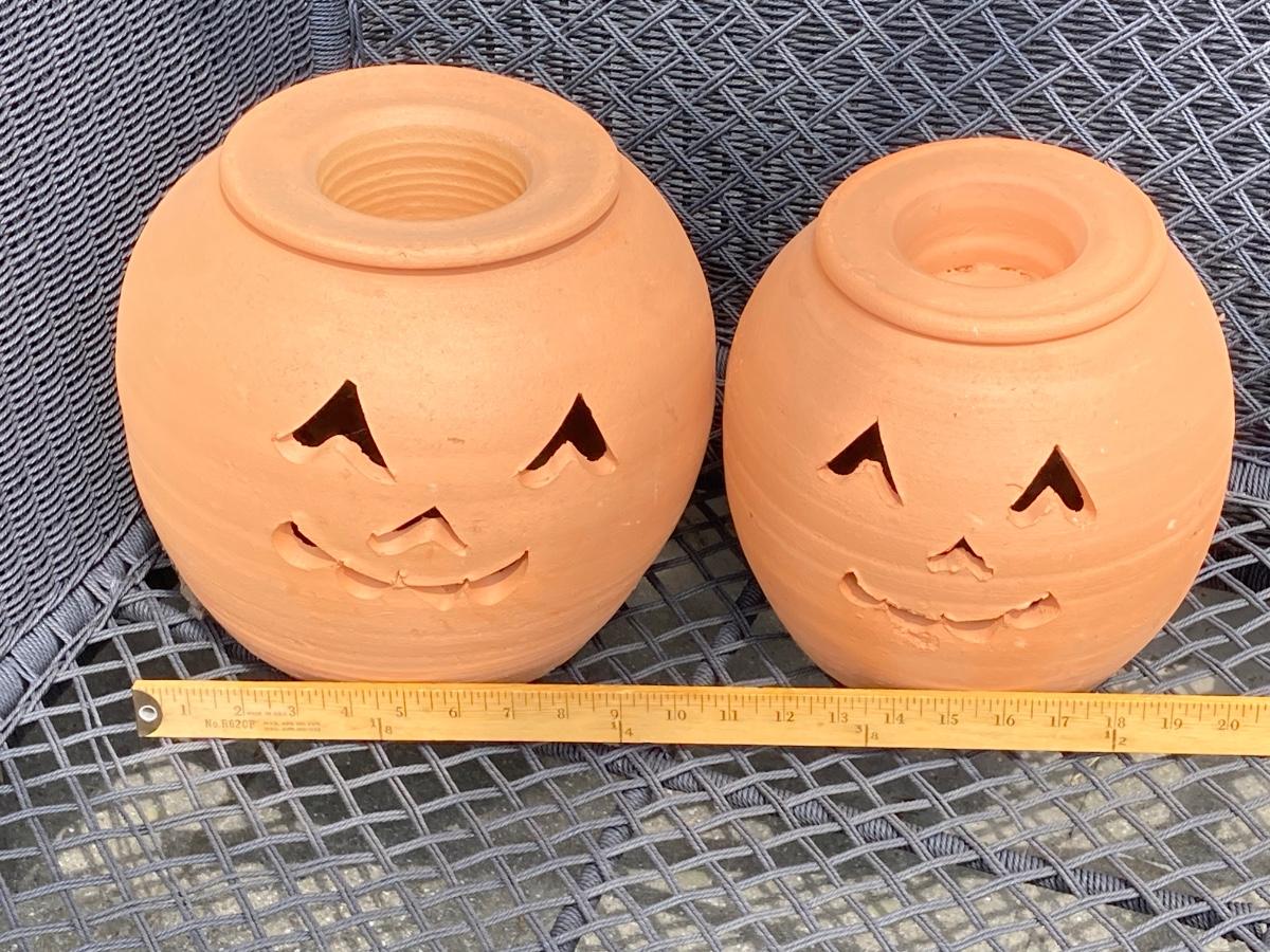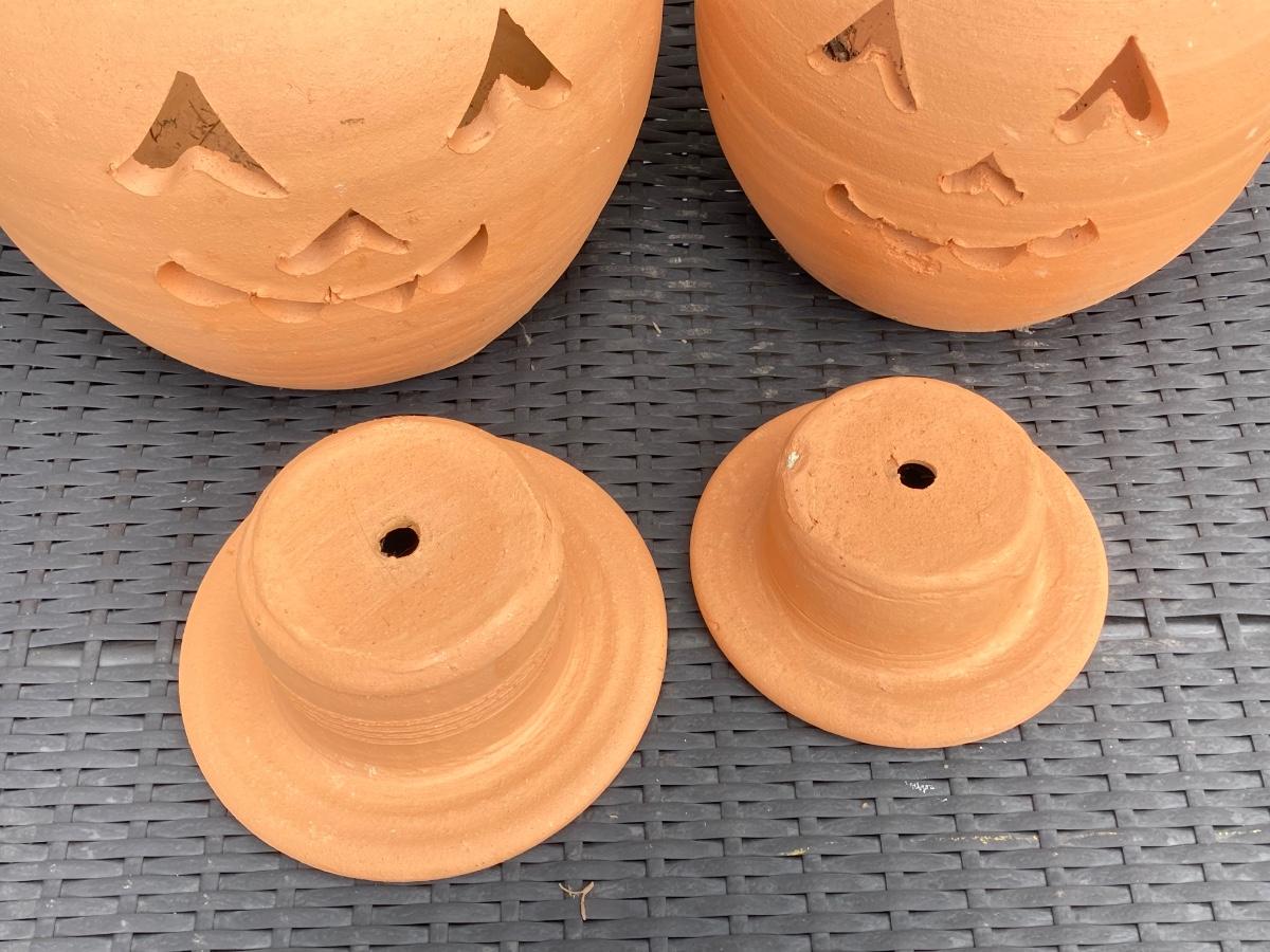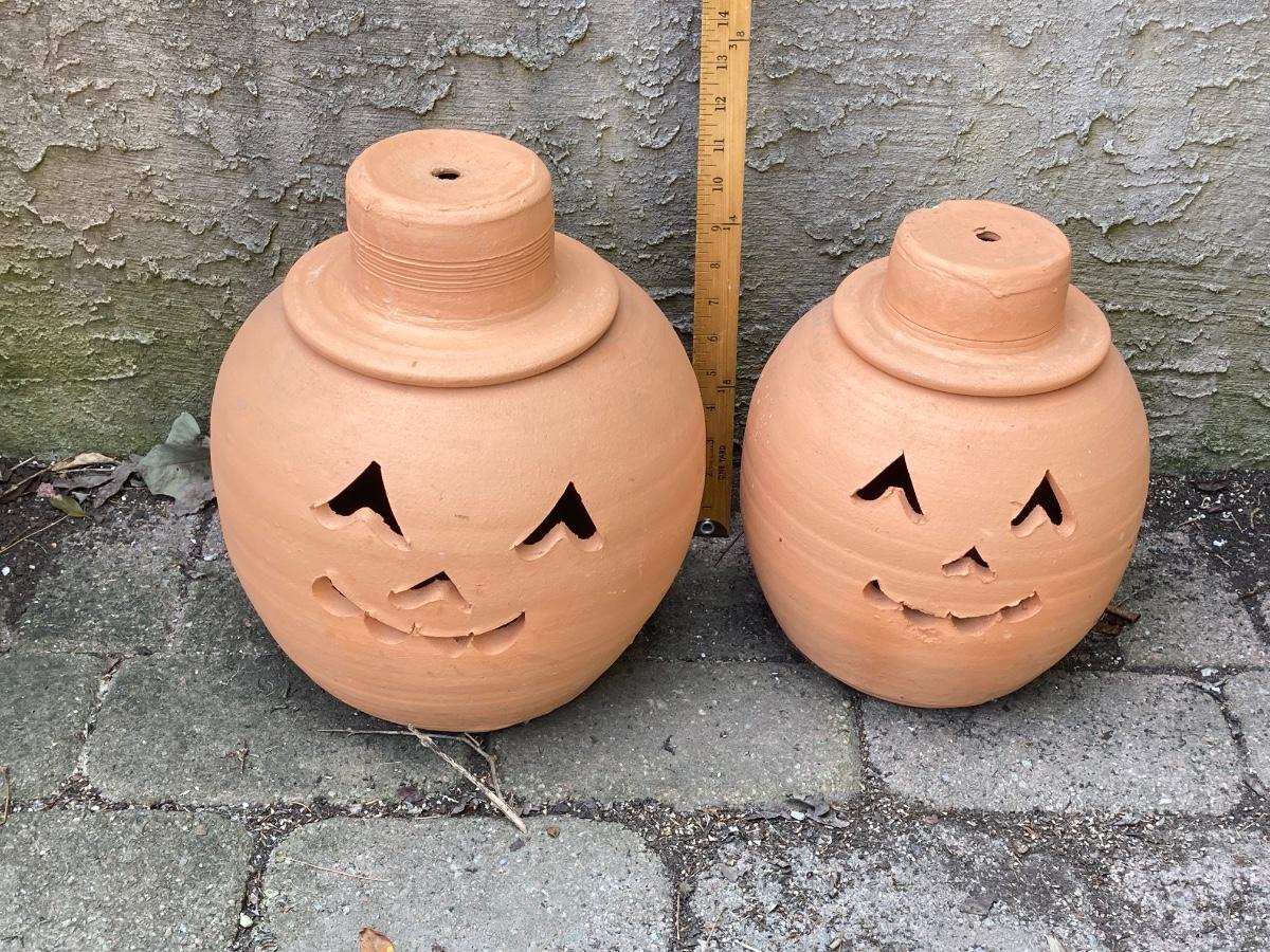 LOT 393: Pair of Terracotta Jack O Lantern / Pumpkins with Top Hats (Hewell's Pottery)