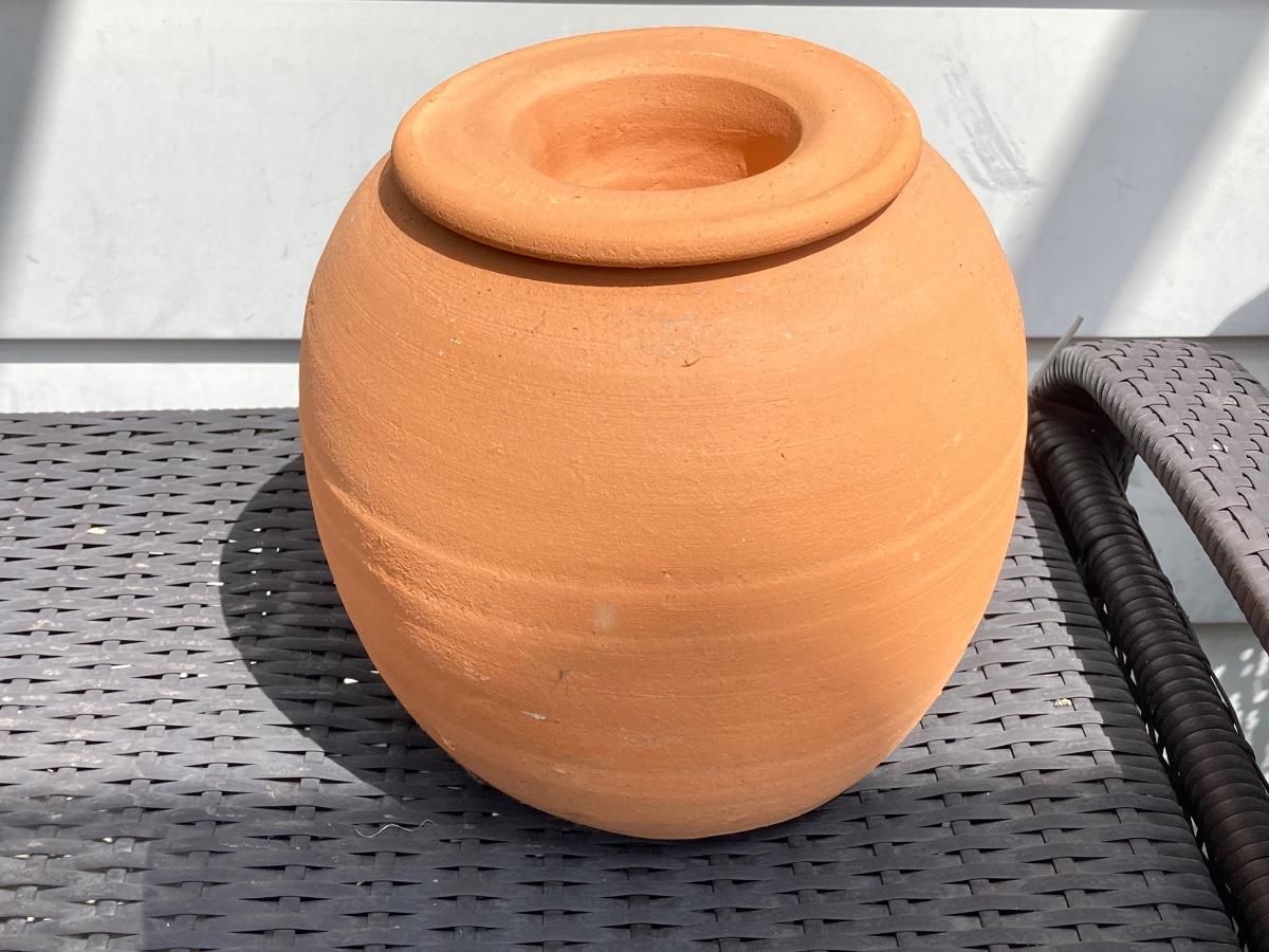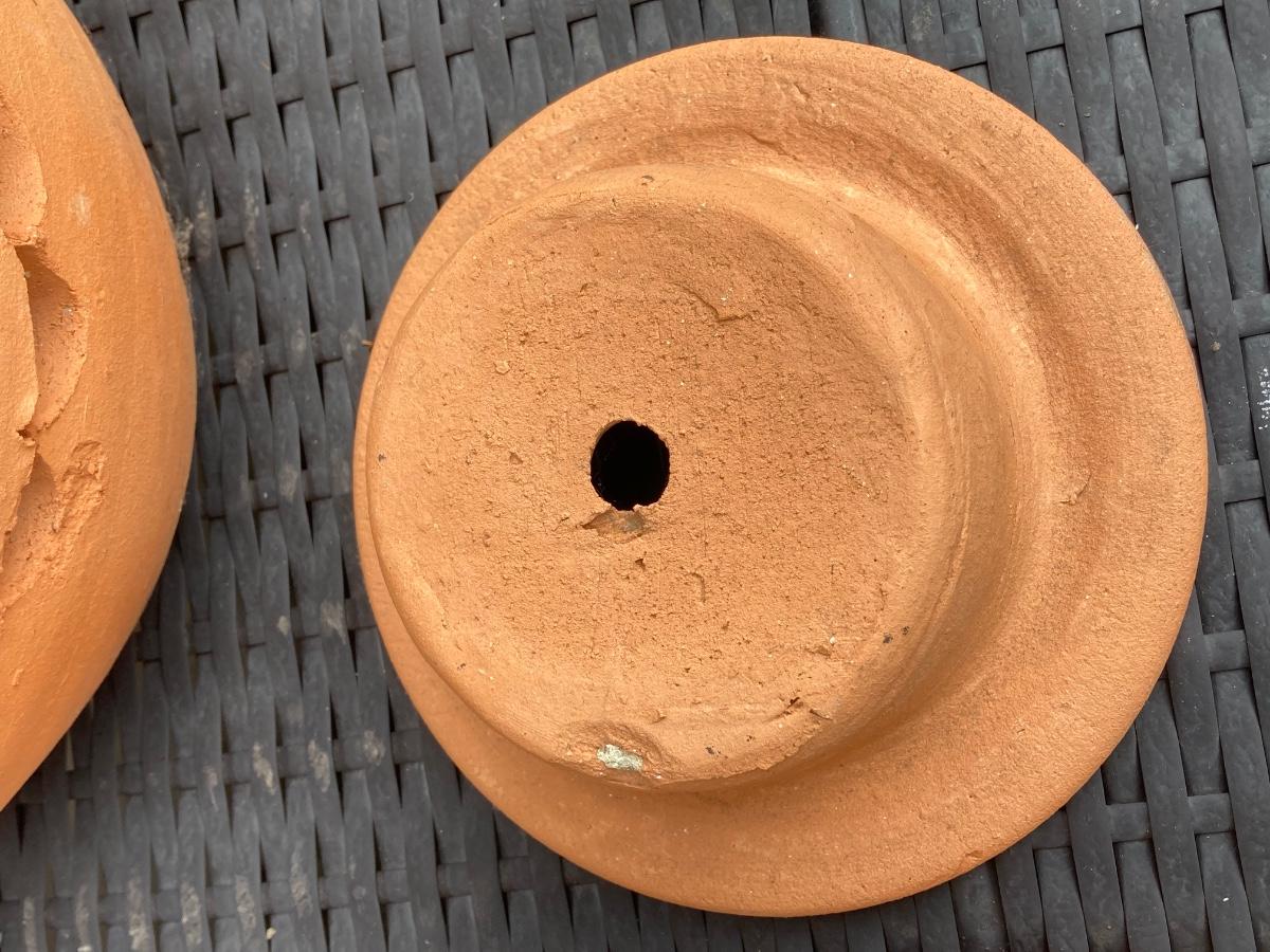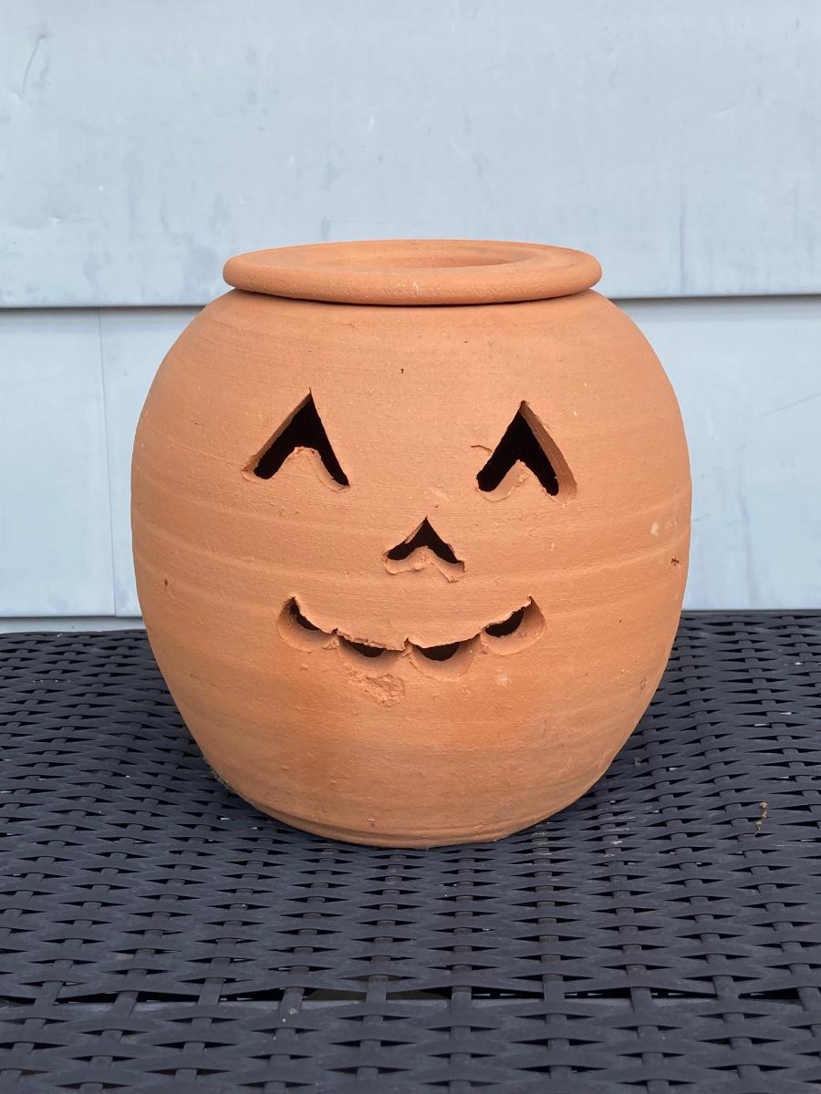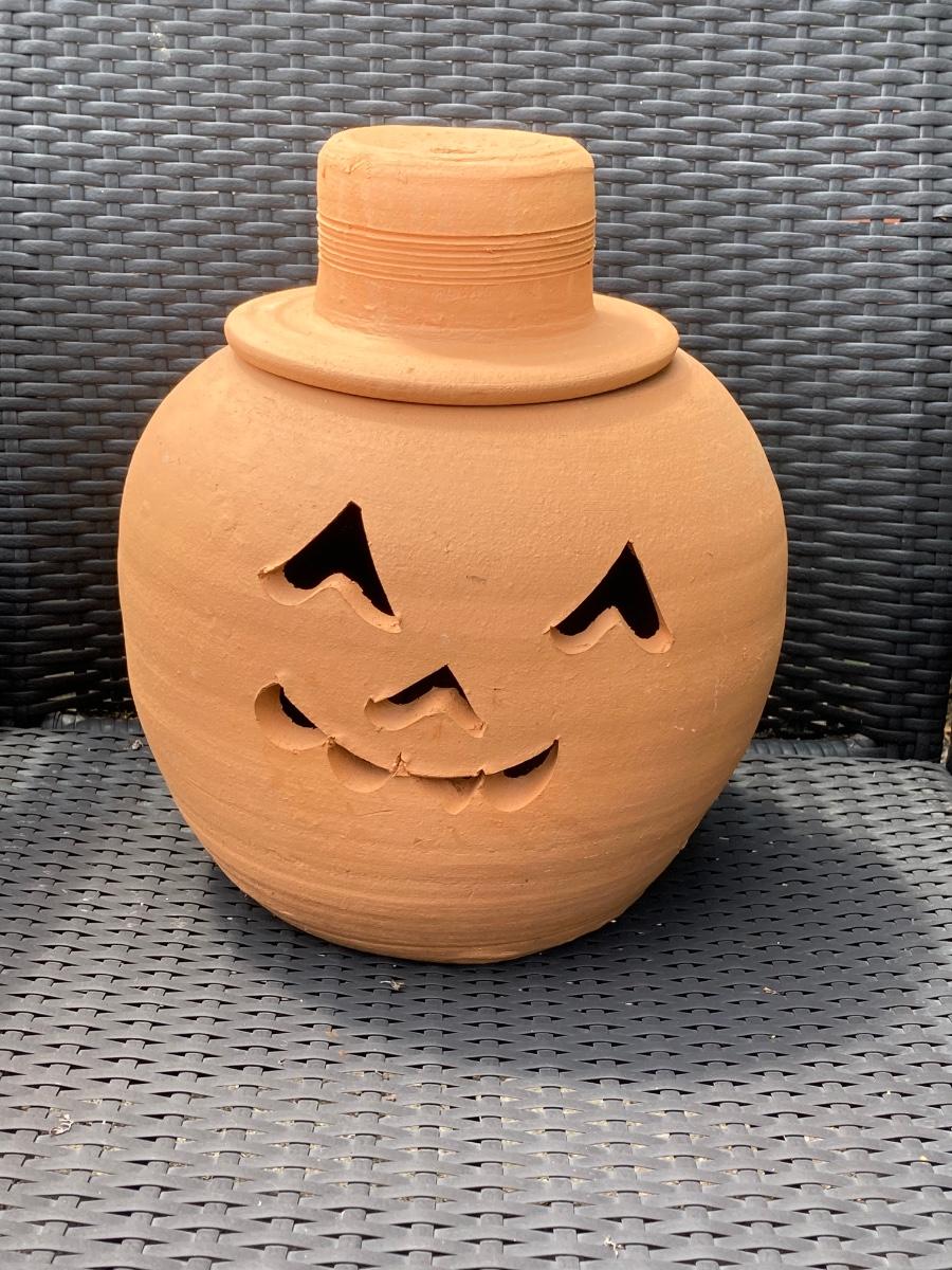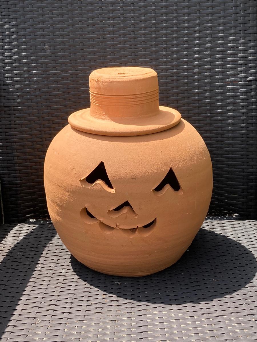 LOT 393: Pair of Terracotta Jack O Lantern / Pumpkins with Top Hats (Hewell's Pottery)