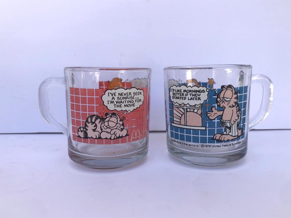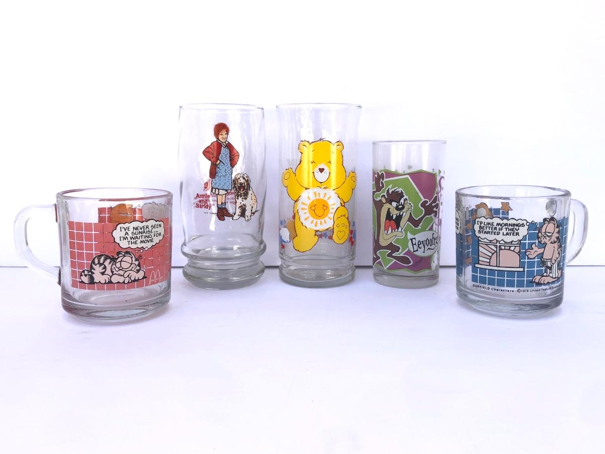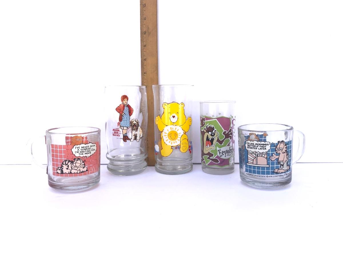 LOT 37G: Collectible Kid's Glasses - McDonald's Garfield Comic Mugs, Smucker's Mil-Looney-um 2000 Taz, 1988 Pizza Hut Carebears Funshine Bear & 1982 Swenson's Annie & Sandy