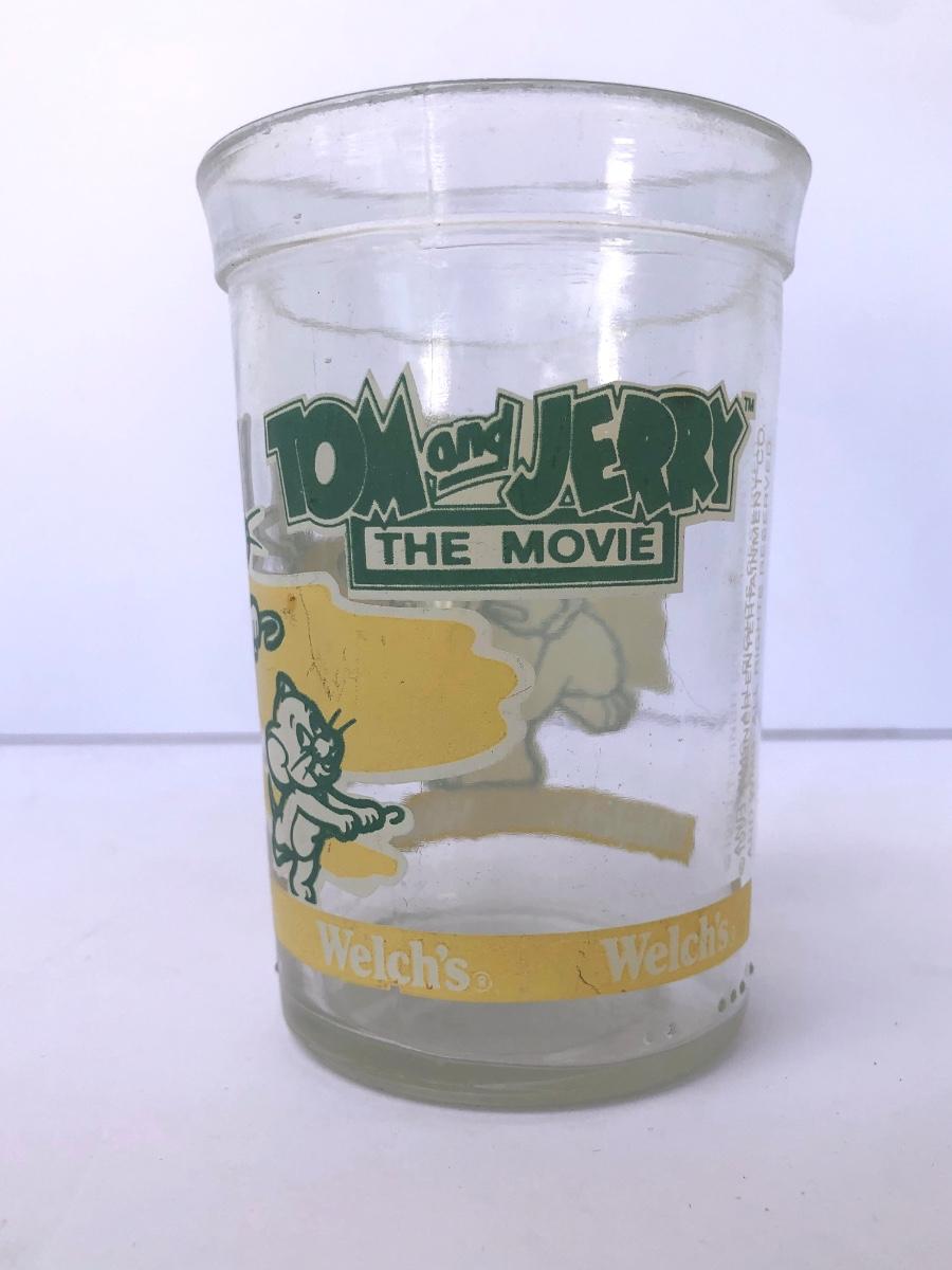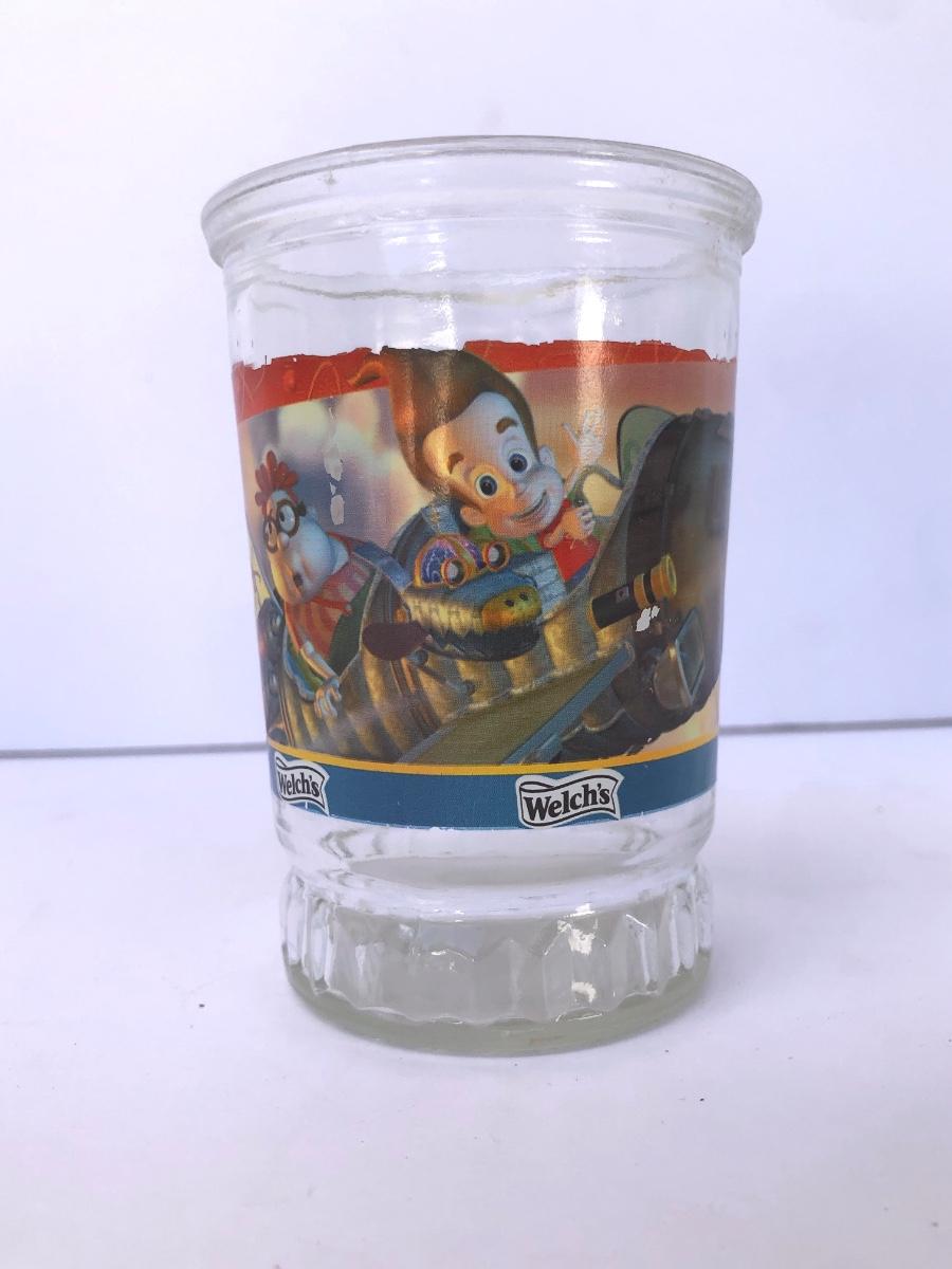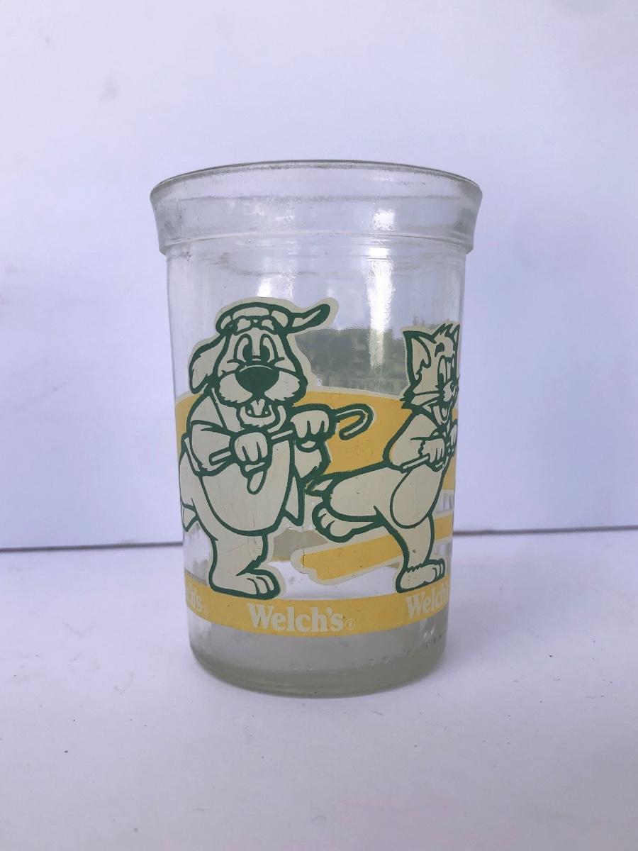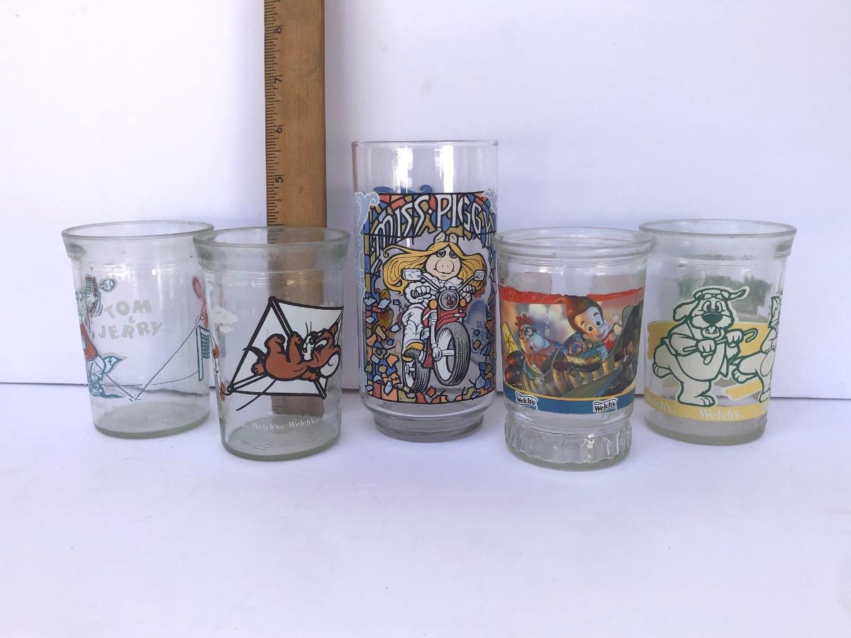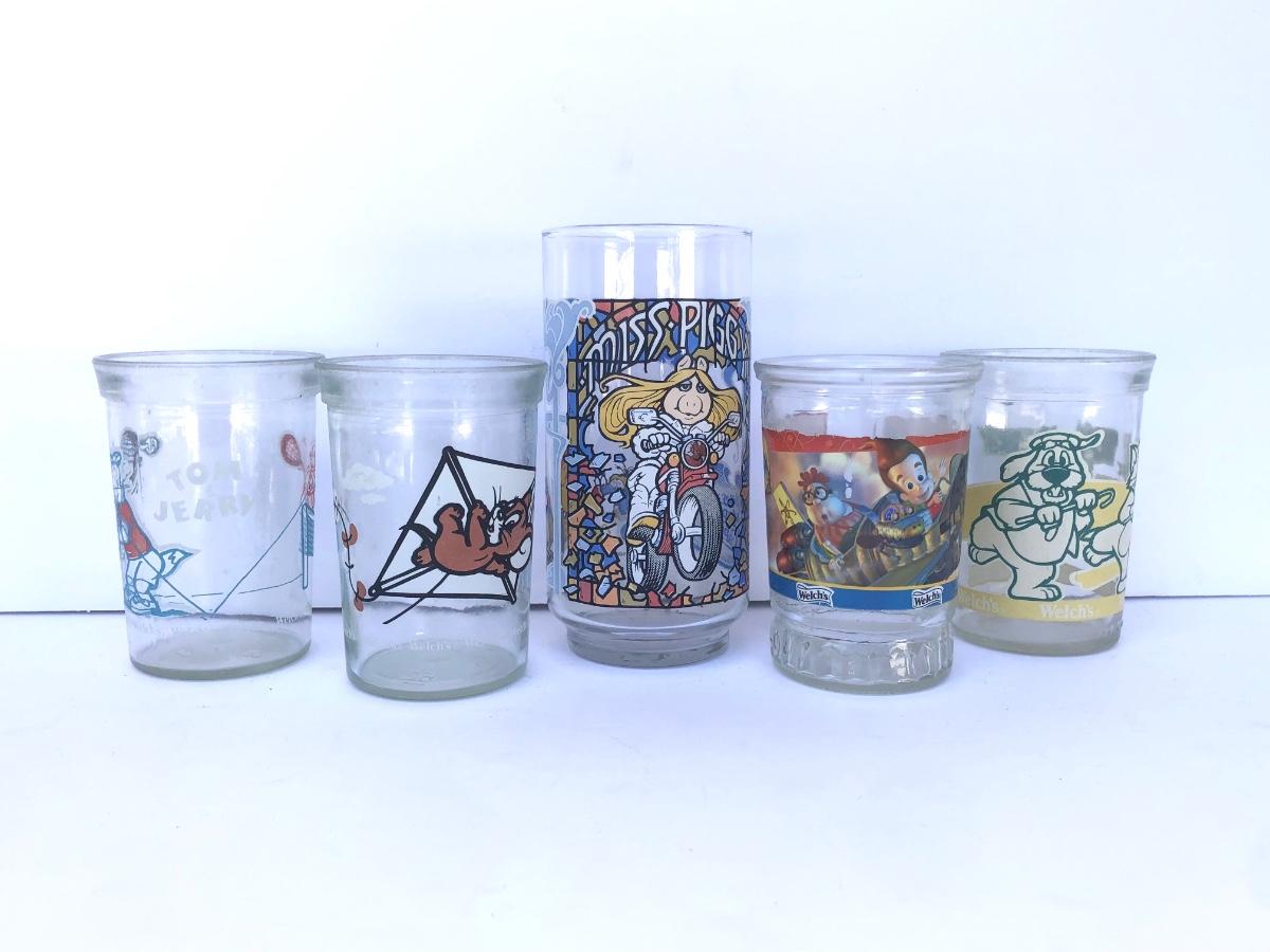 LOT 38G: 1981 McDonald's Miss Piggy on Motorcycle Glass & Welch's Collectible Glass Jelly Jars - 2002 Jimmy Neutron w/ Tom & Jerry - 1991 Tennis, 1990 Kite, 1993 Movie